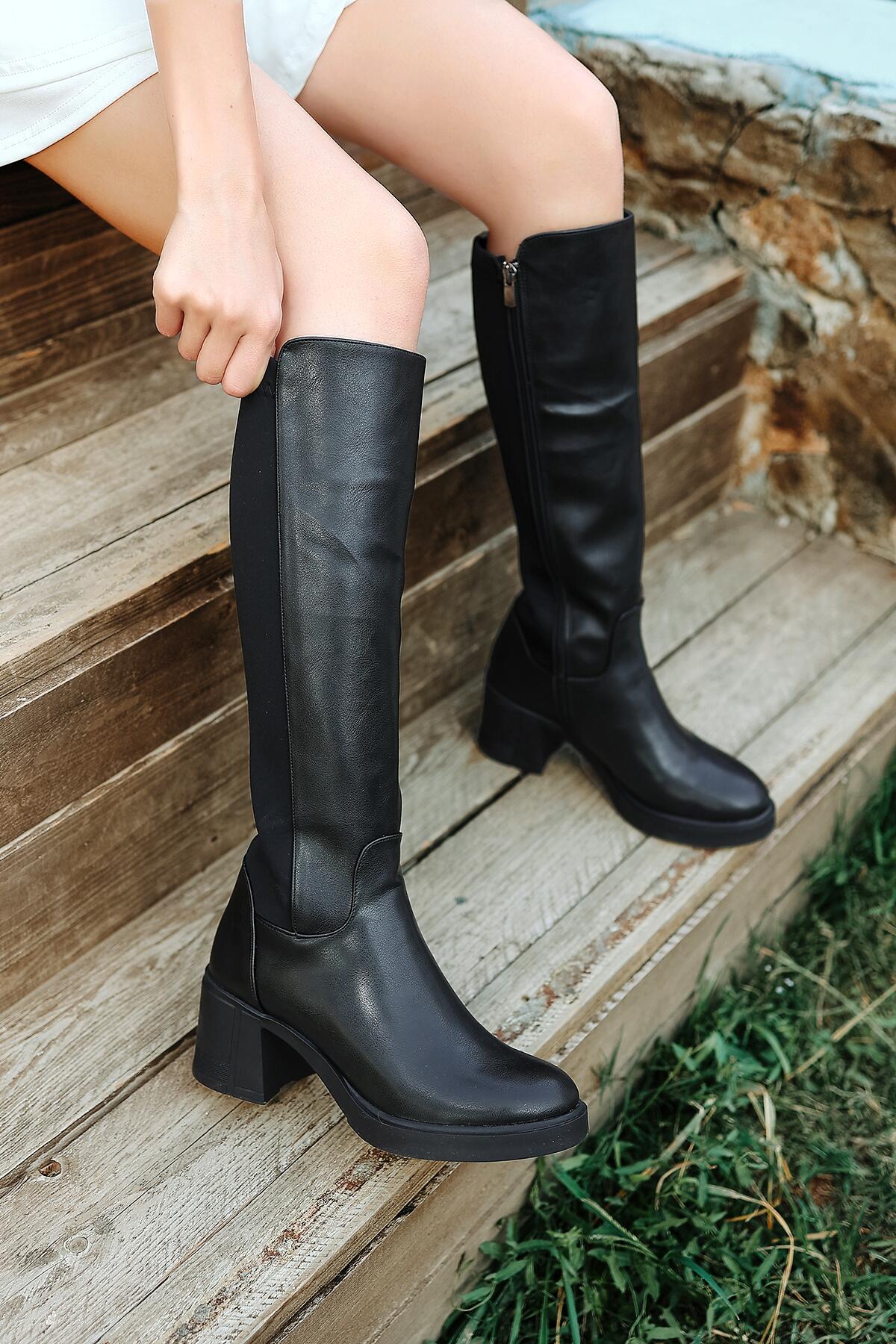 Kadın Kısa Topuklu Diz Altı Çizme Corie Siyah Cilt