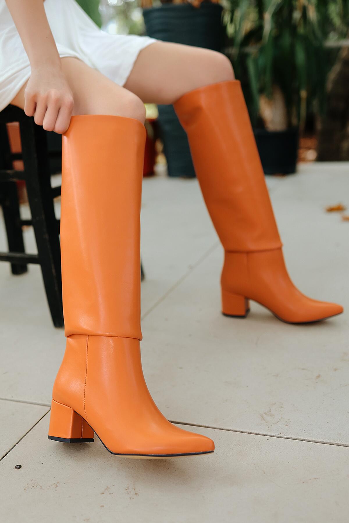 Kadın Kısa Topuklu Diz Altı Çizme Enedy Turuncu