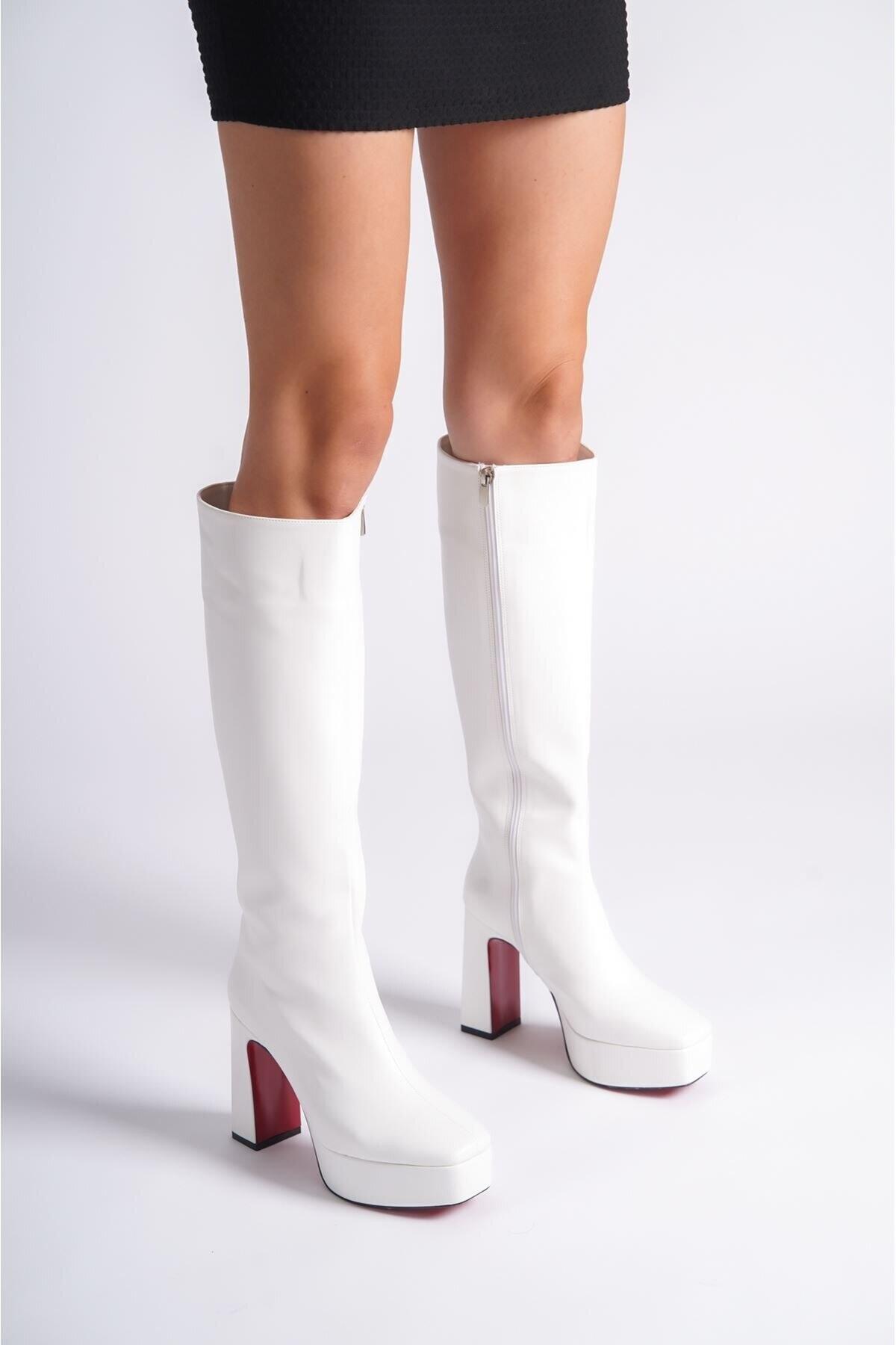 Kadın Platform Diz Altı Çizme Paman Beyaz Cilt