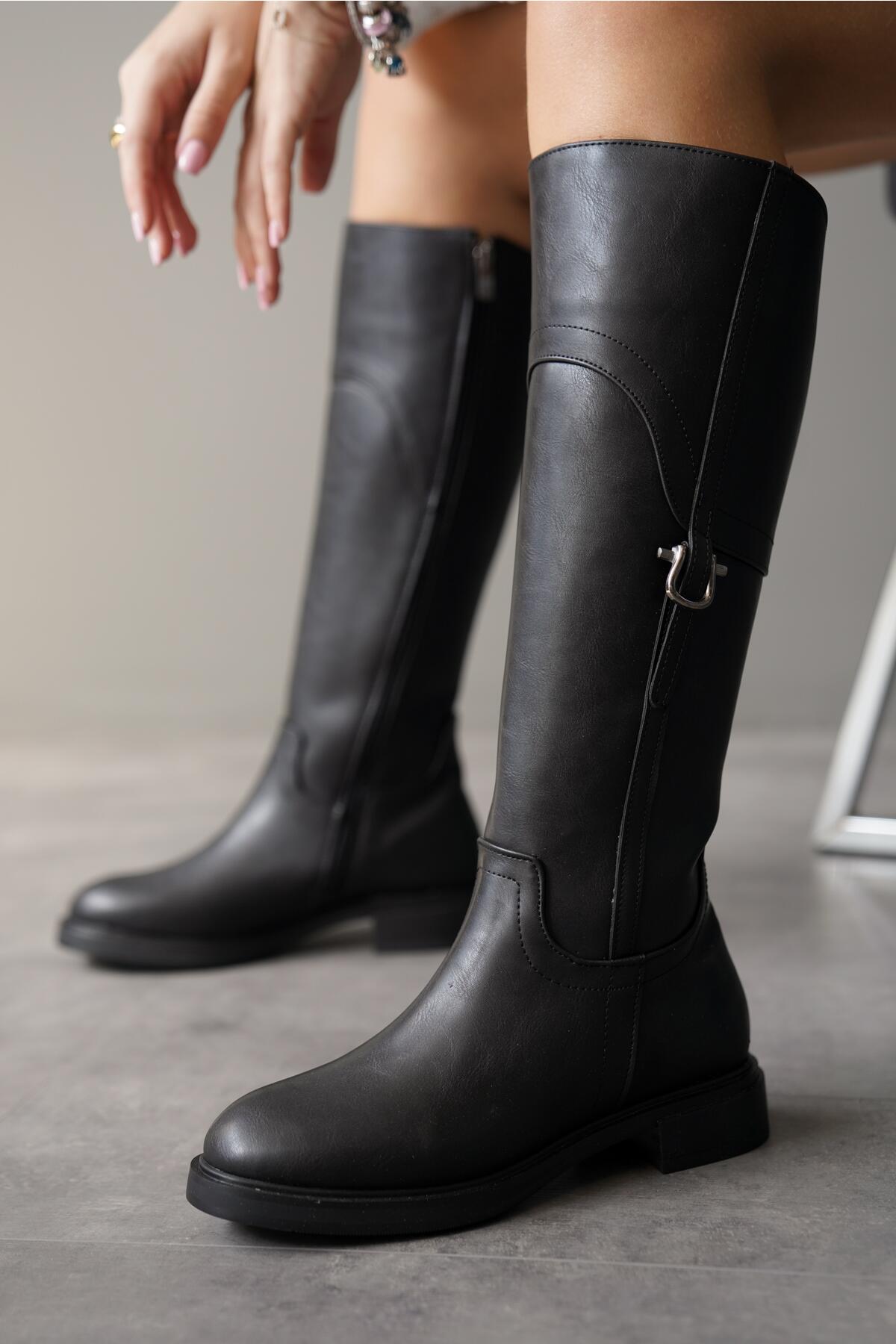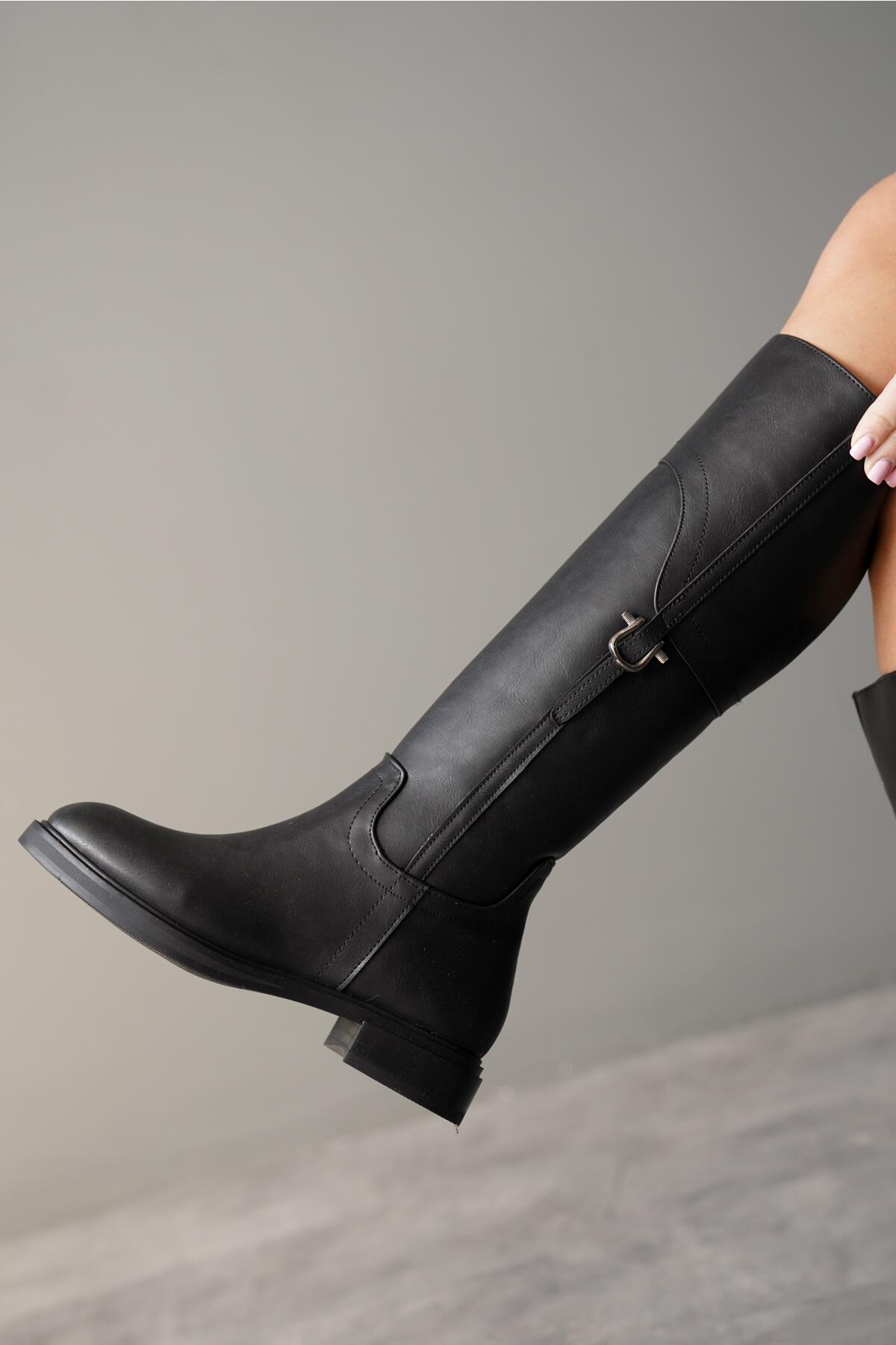 Kadın Sade Tokalı Düz Çizme Ezzie Siyah Cilt