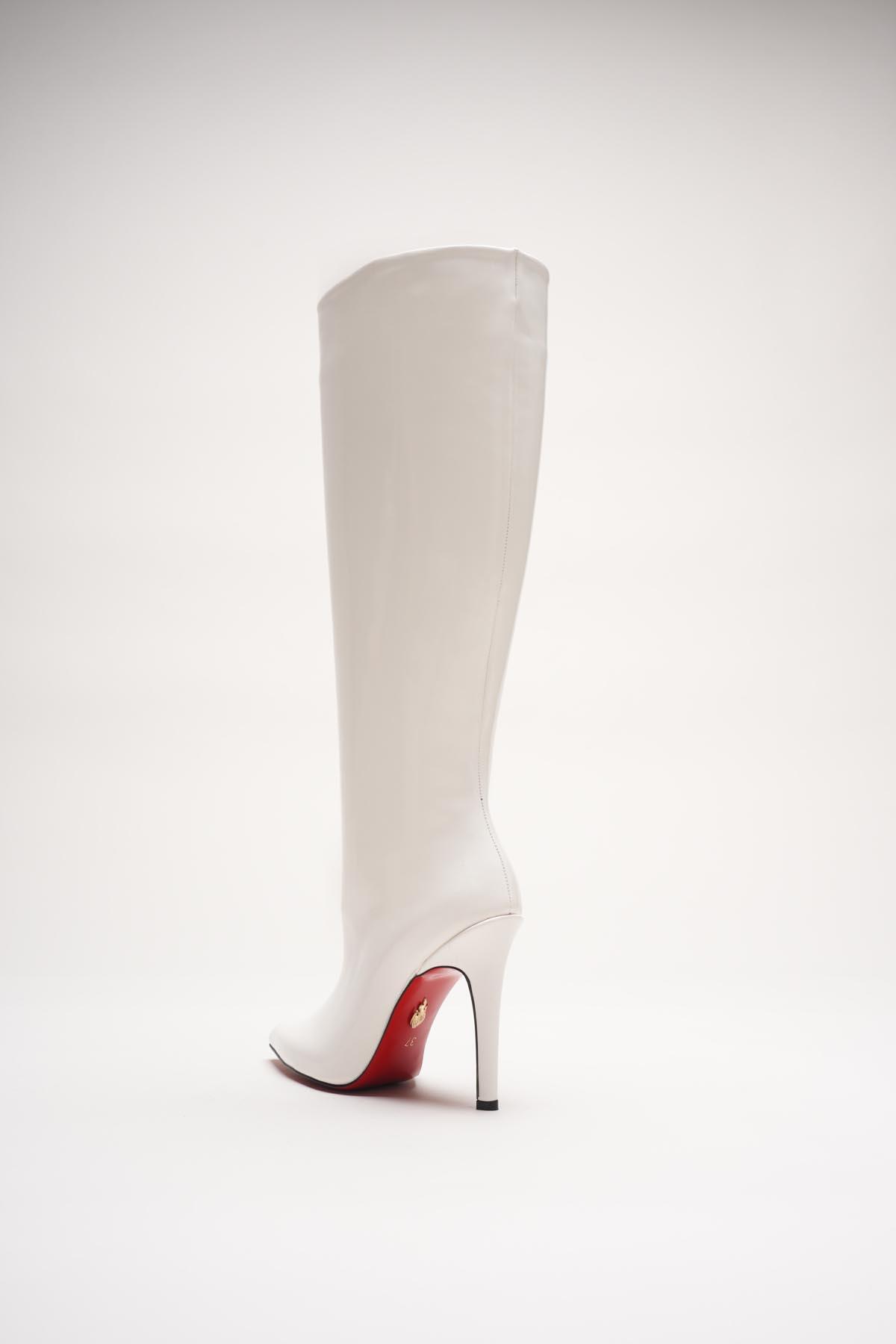 Kadın Sivri Burun Fermuarsız İnce Topuklu Diz Altı Çizme Monias Beyaz Rugan