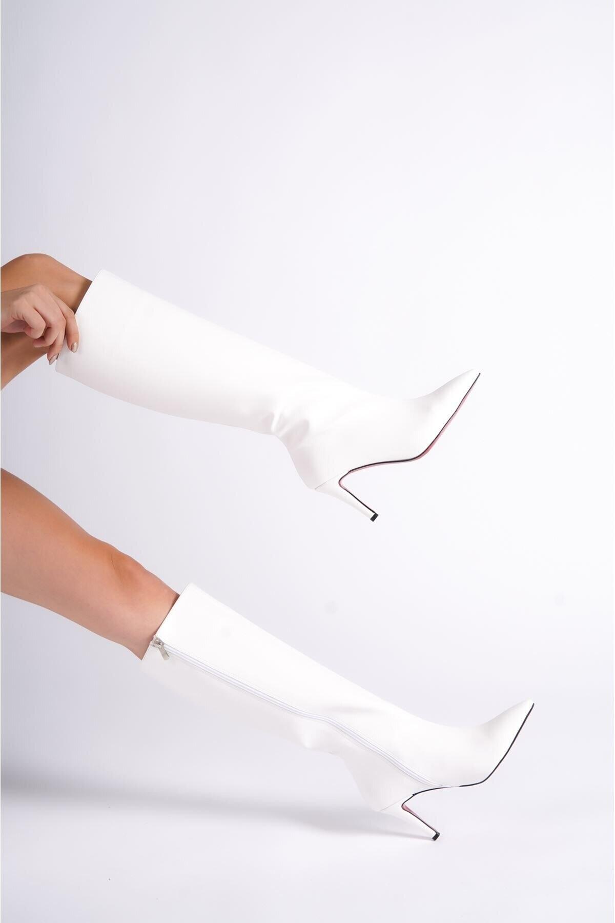 Kadın Sivri Burun Kısa Topuklu Çizme Zelda Beyaz Cilt
