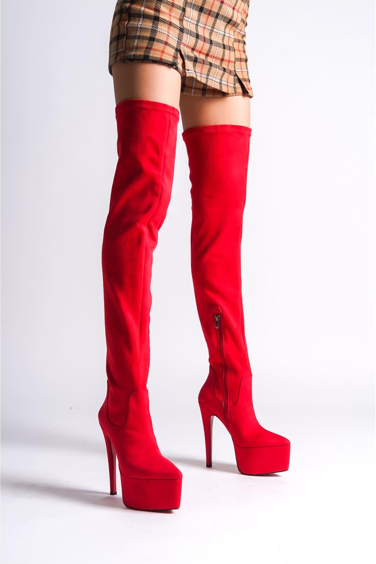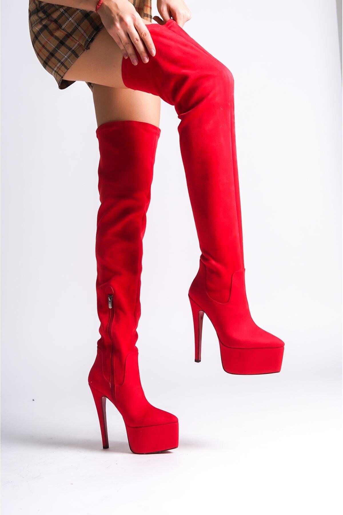 Kadın Sivri Burun Yüksek Topuklu Diz Üstü Streç Çizme Isabella Kırmızı Saten