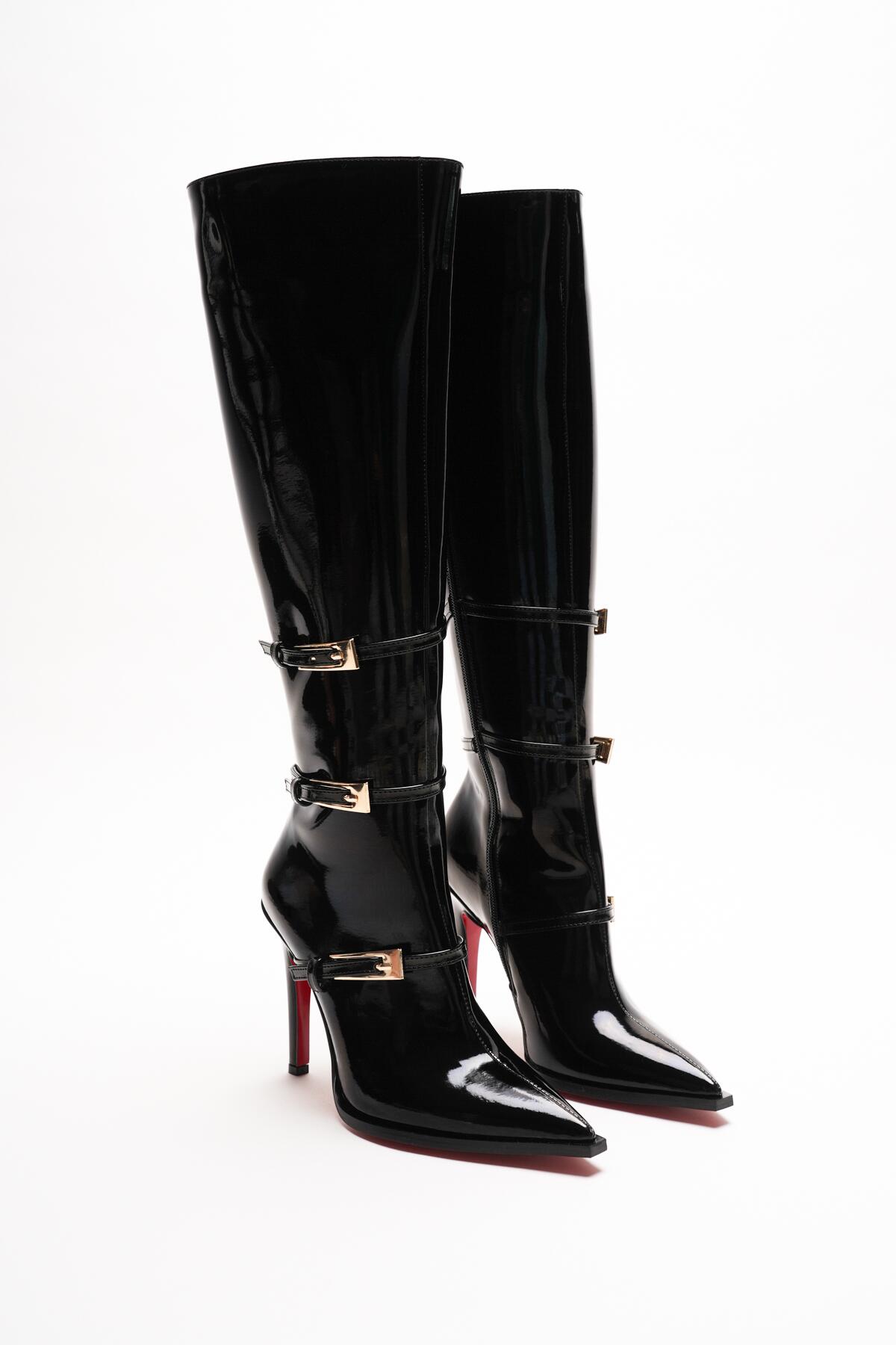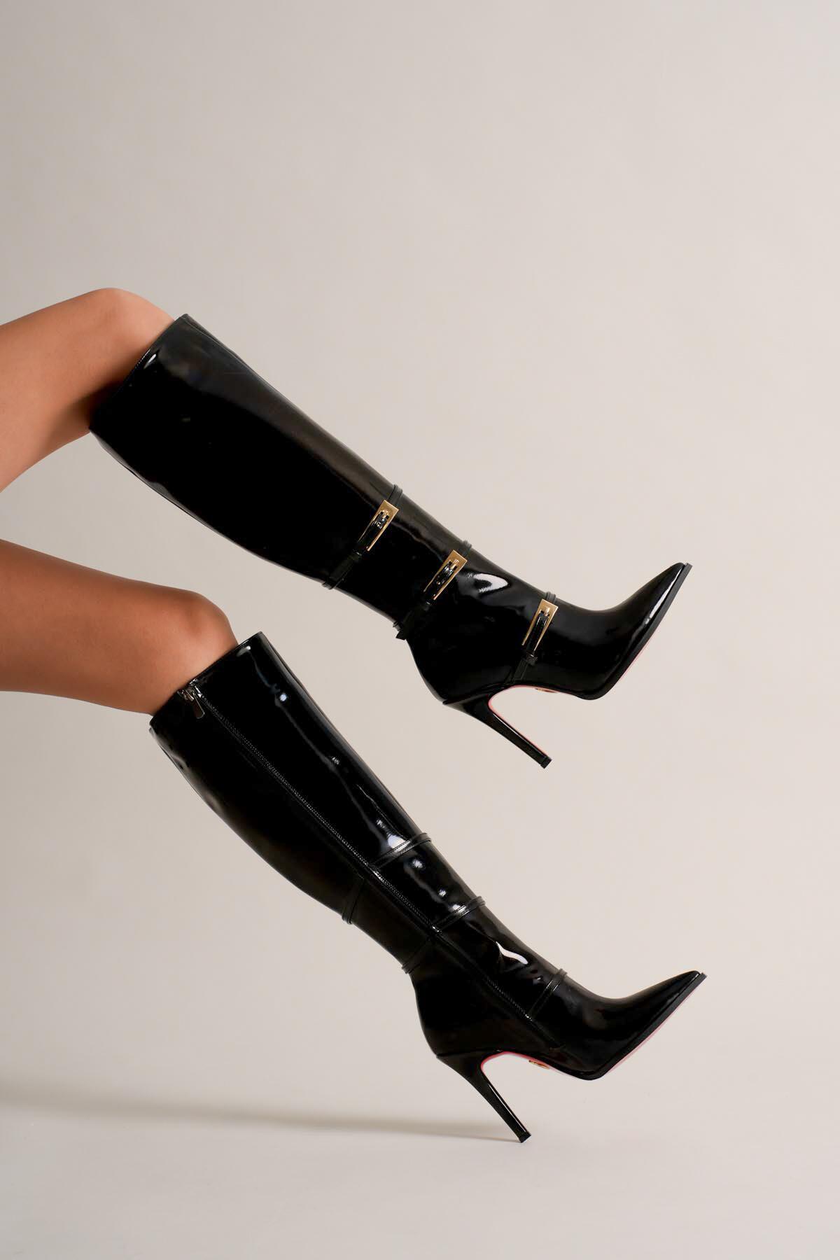 Kadın Siyah Rugan Sivri Burun 3 Tokalı İnce Topuklu Çizme Tokai Siyah Rugan