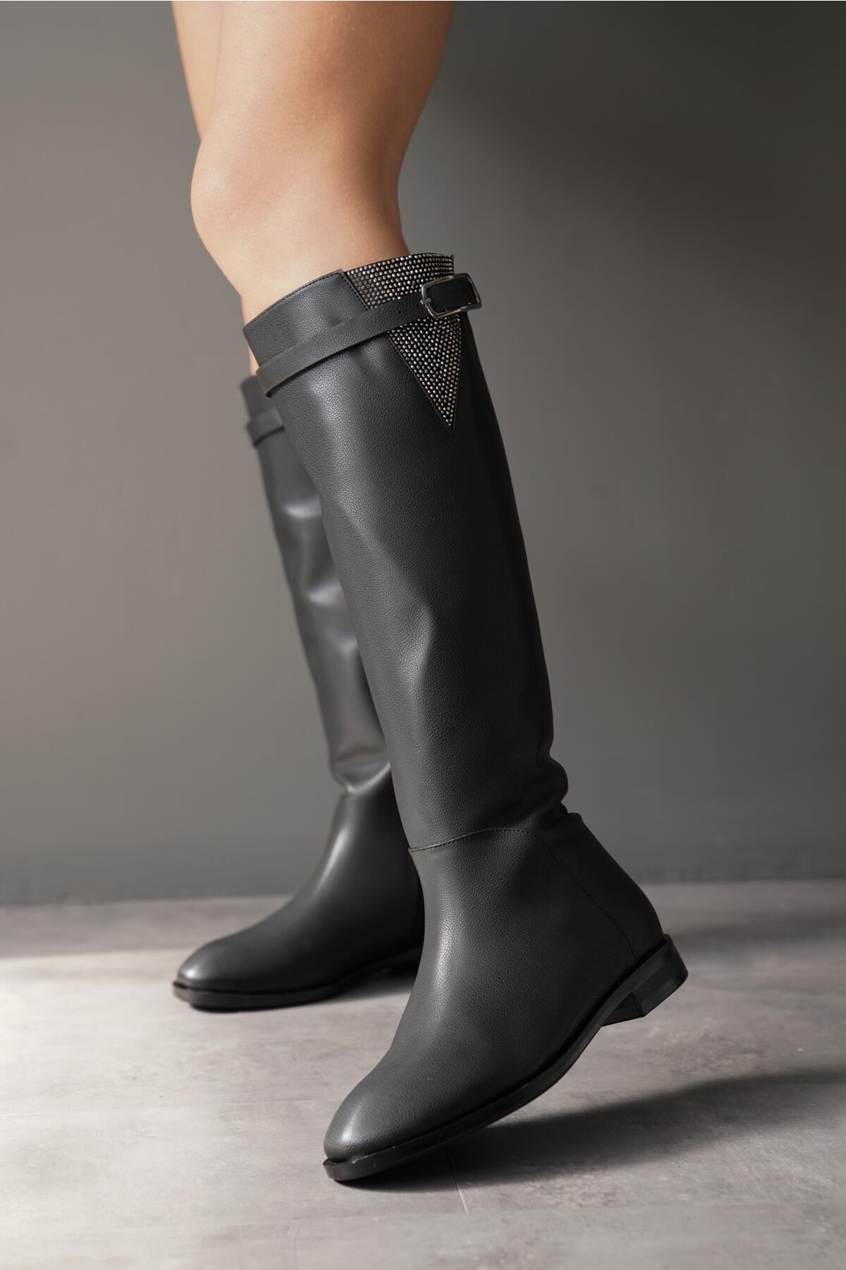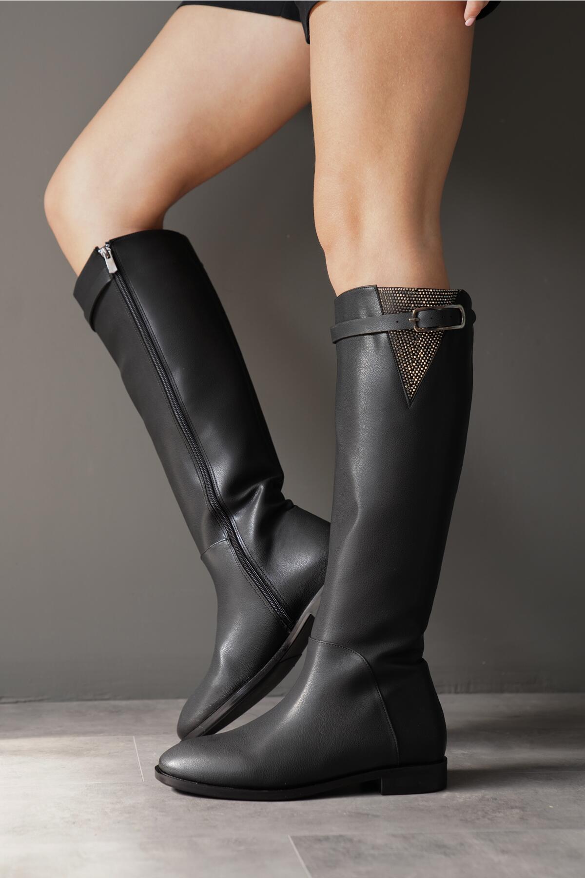Kadın Taşlı Toka Detay Düz Çizme Linko Siyah