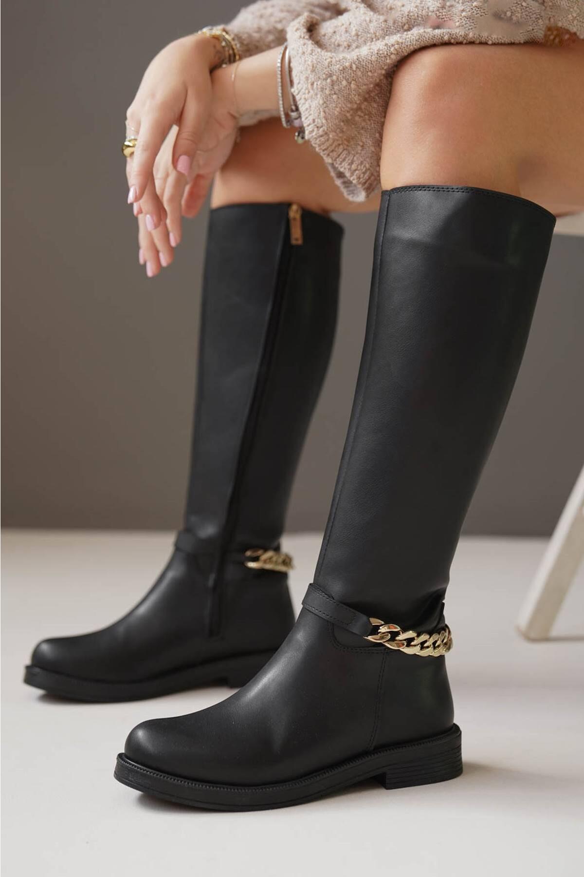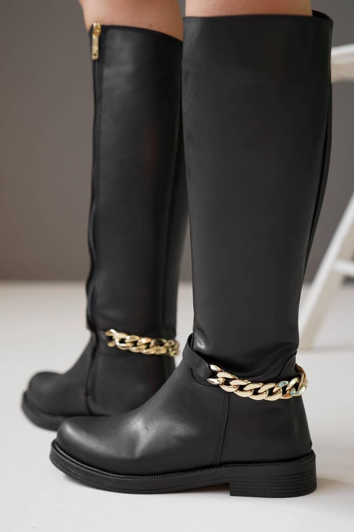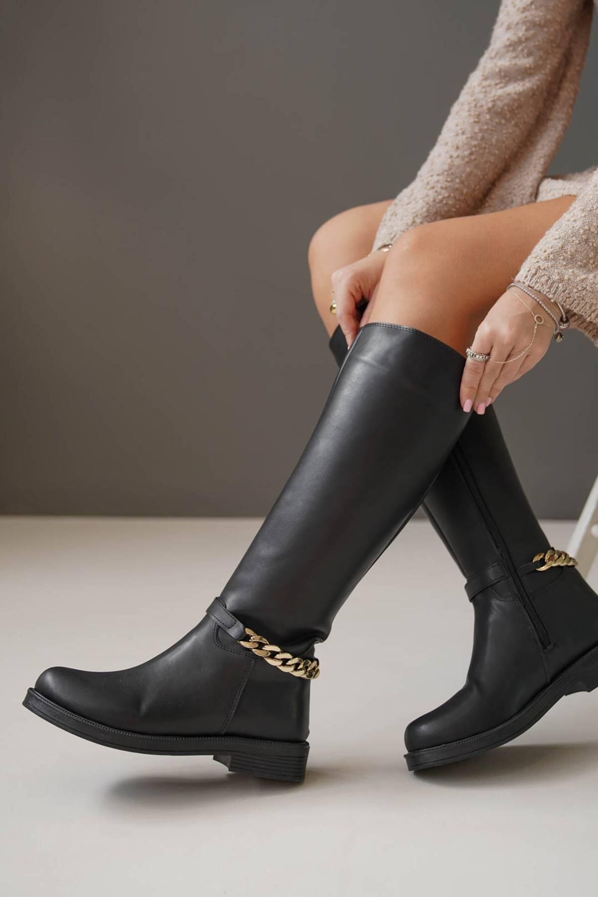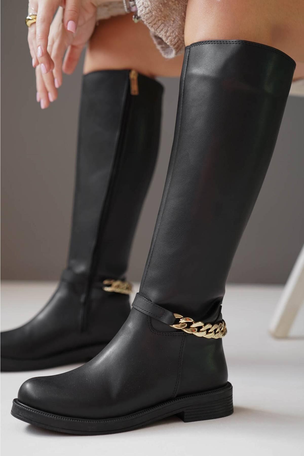Kadın Zincir Tokalı Düz Çizme Kloria Siyah
