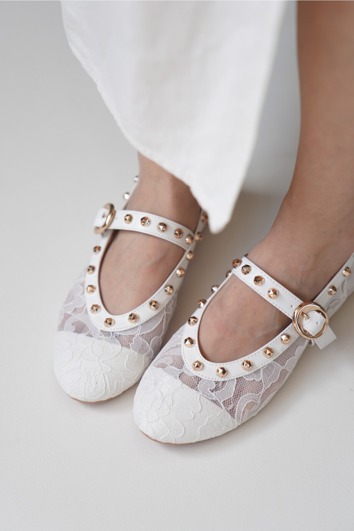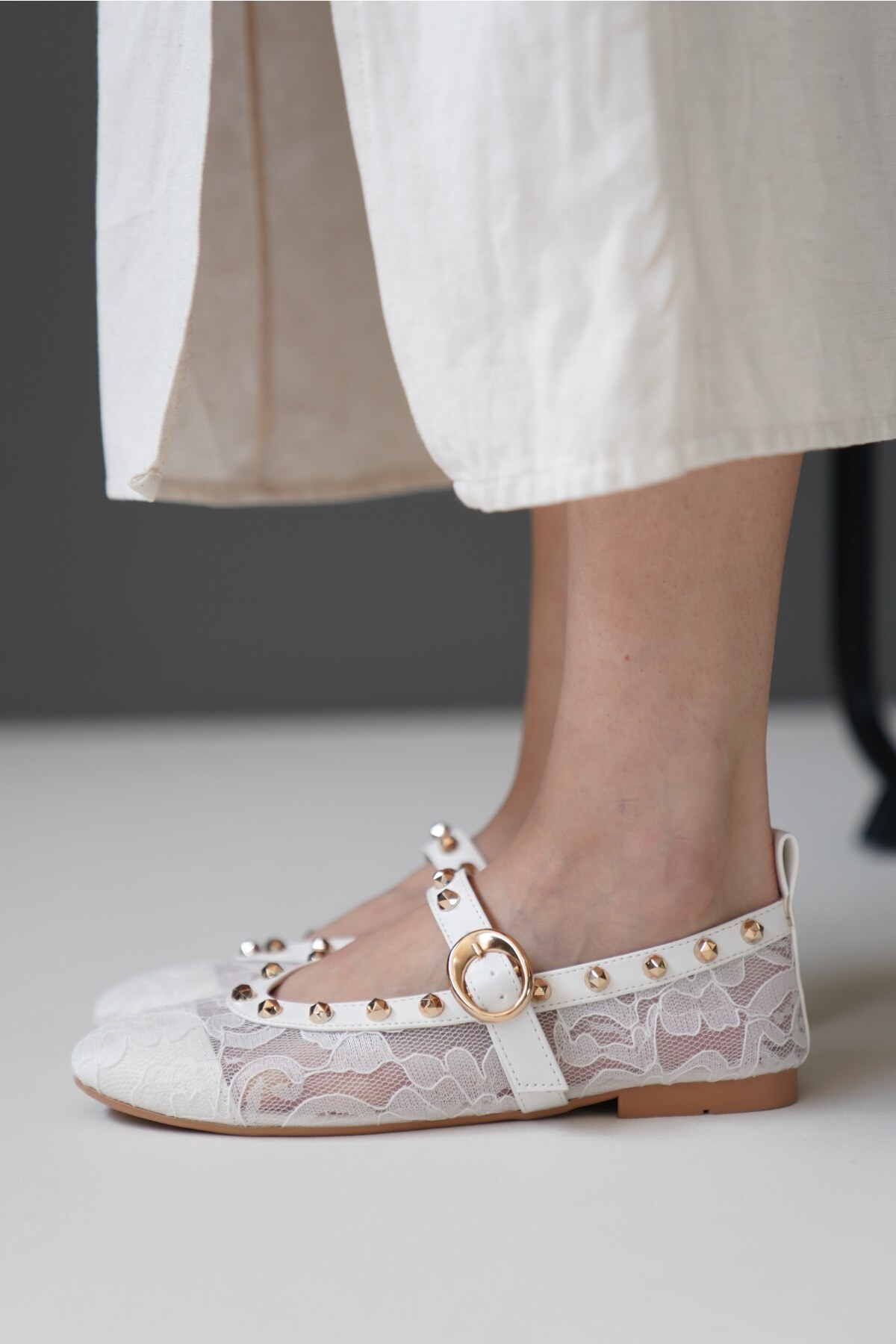 Kadın Dantel Gold Çivili Babet Cloi Beyaz