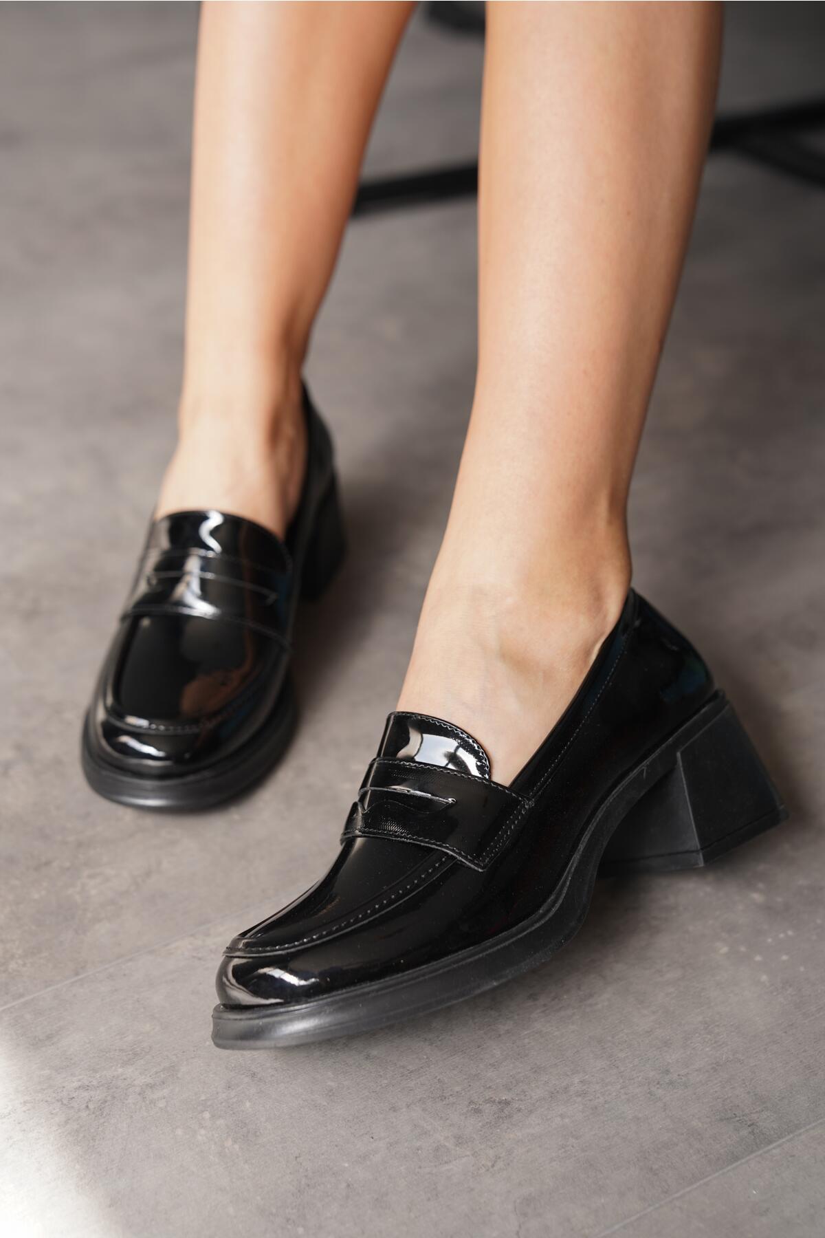 Kadın Kalın Topuk Loafer Poyli Siyah Rugan