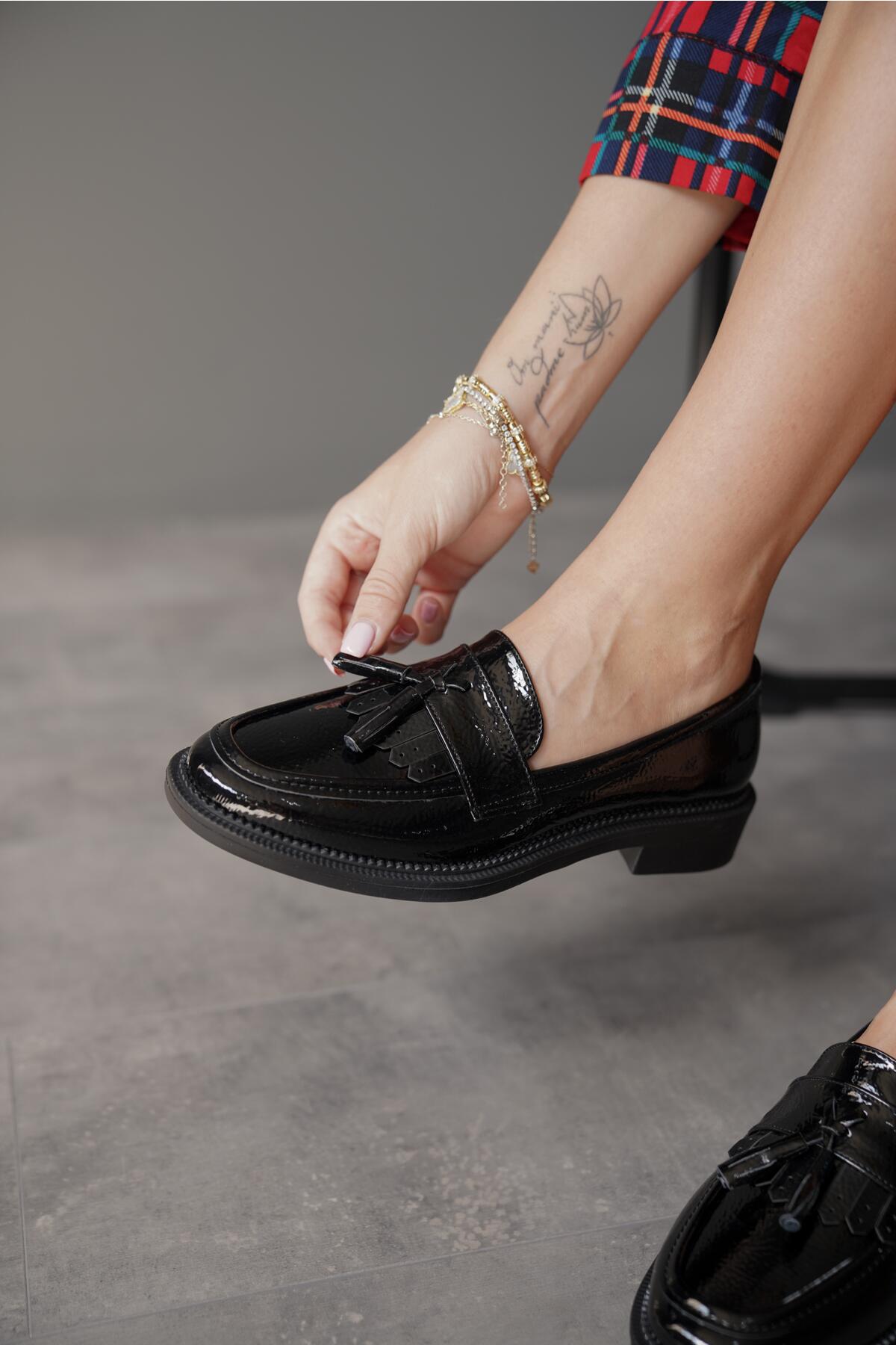 Kadın Püskül Tokalı Loafer Günlük Ayakkabı Livora Siyah Rugan