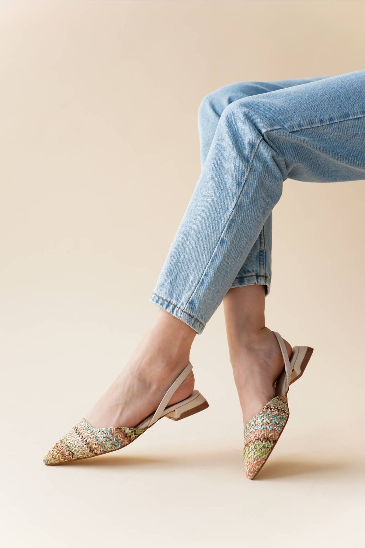 Kadın Sivri Burun Hasır Topuklu Babet Nude Cilt