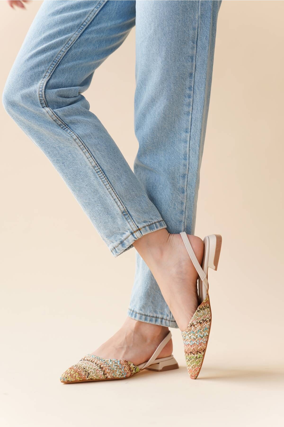 Kadın Sivri Burun Hasır Topuklu Babet Nude Cilt