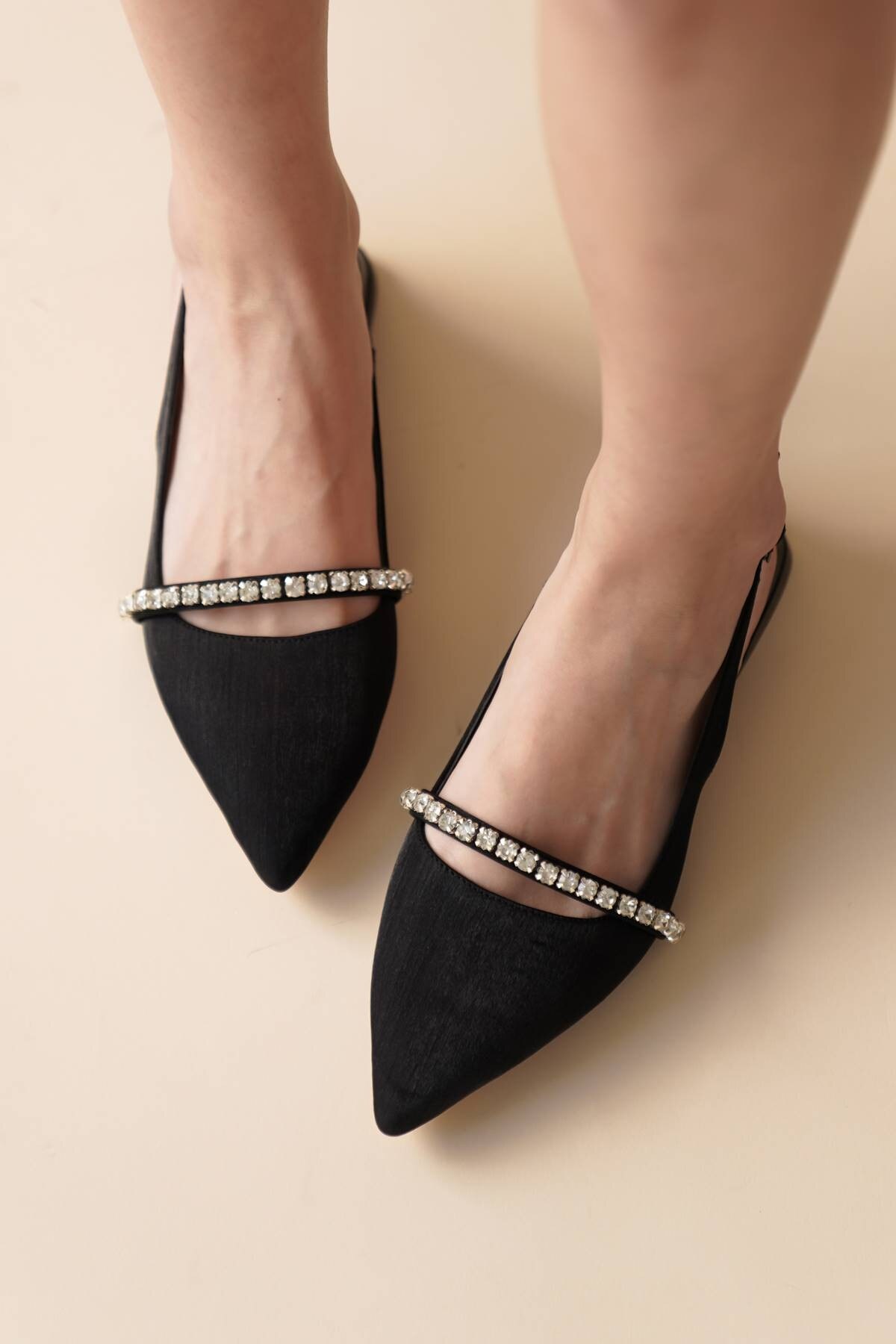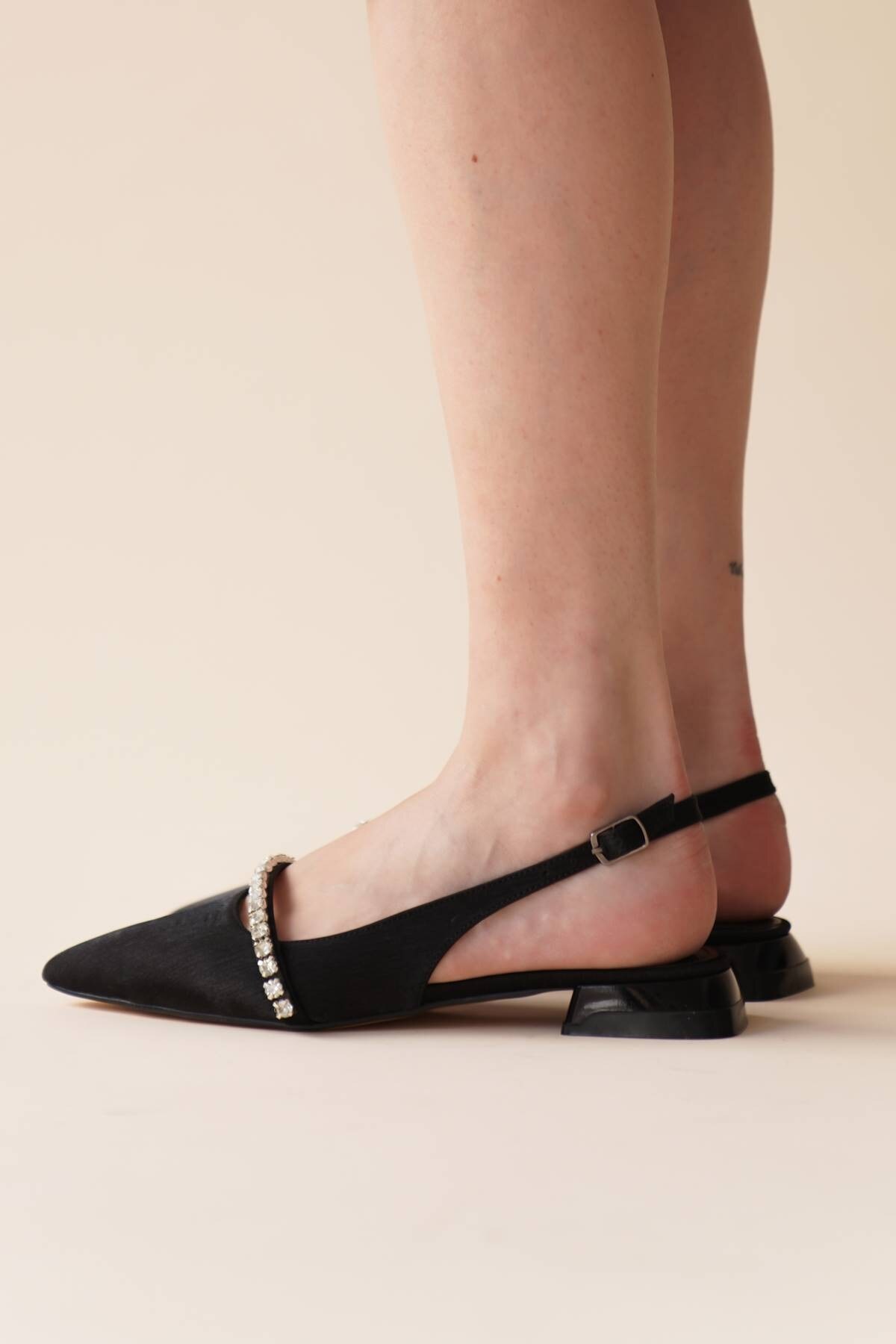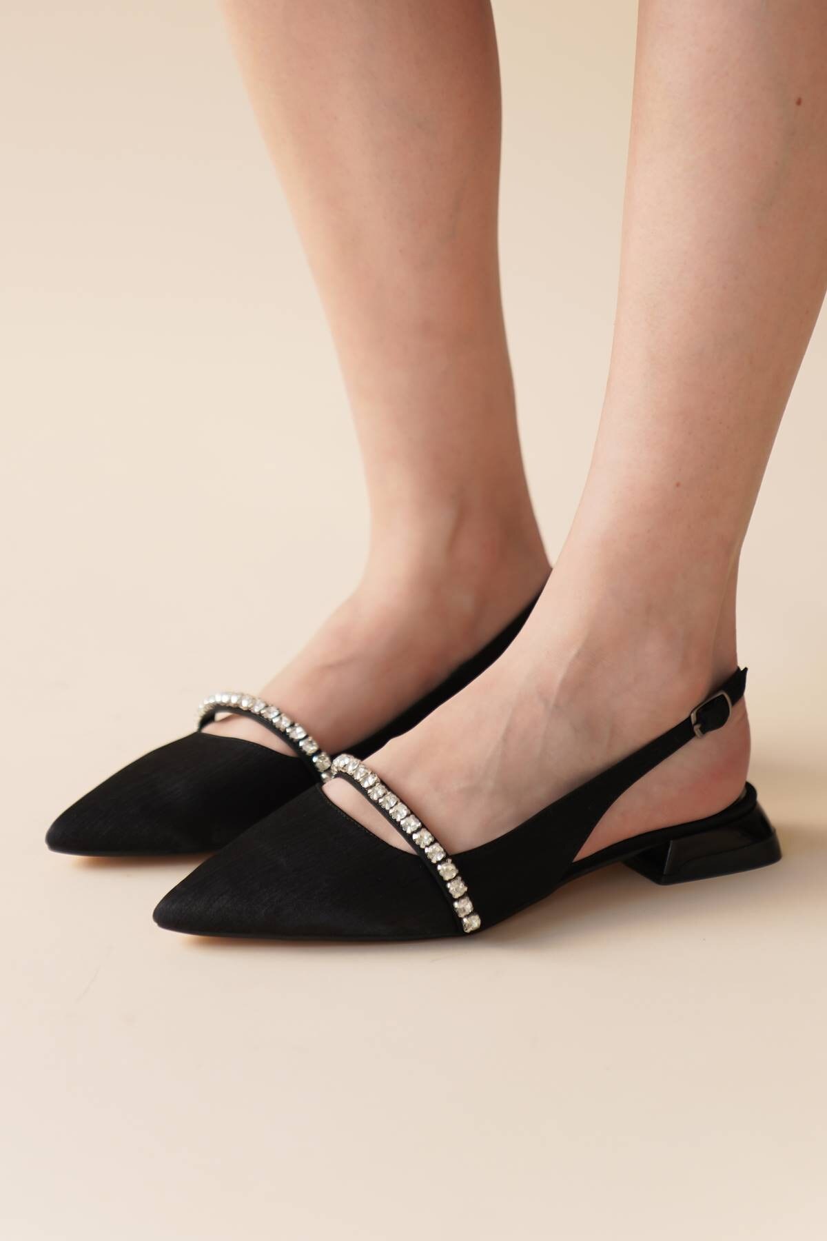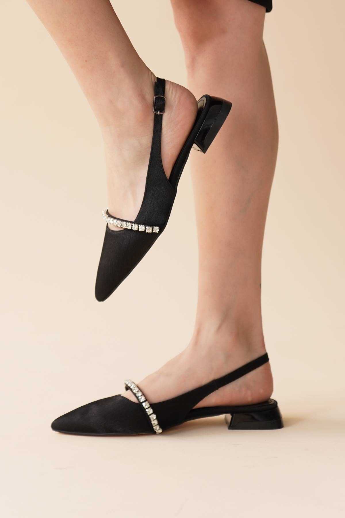 Kadın Taş Detaylı Kısa Topuklu Babet Droma Siyah Saten