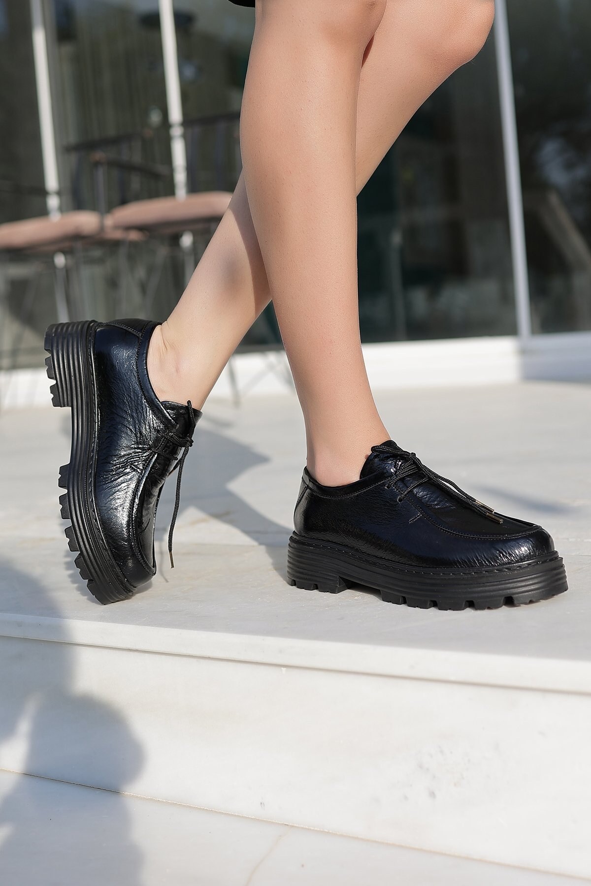 Kadın Bağcıklı Hakiki Deri Günlük Ayakkabı Kirev Siyah