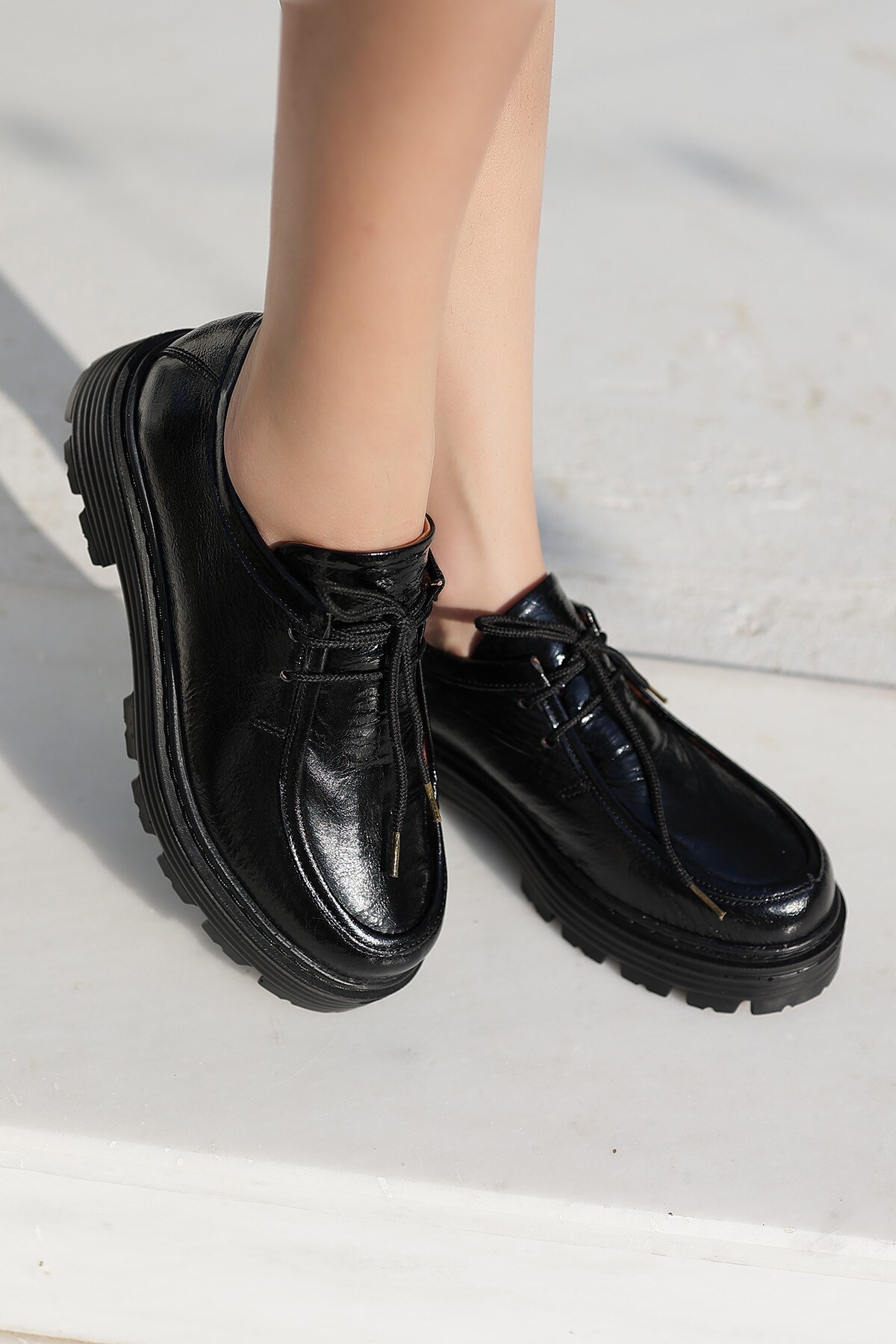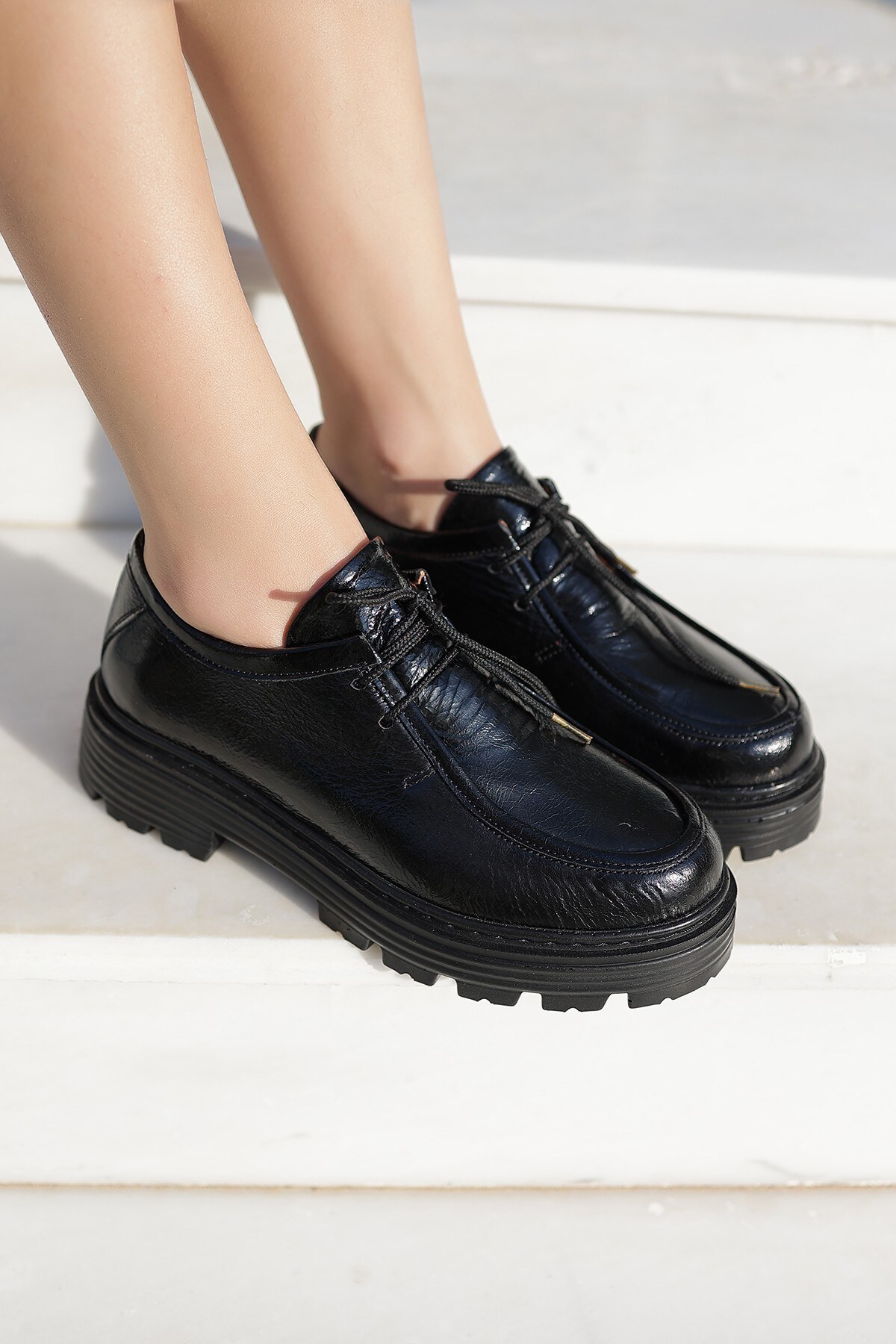 Kadın Bağcıklı Hakiki Deri Günlük Ayakkabı Kirev Siyah