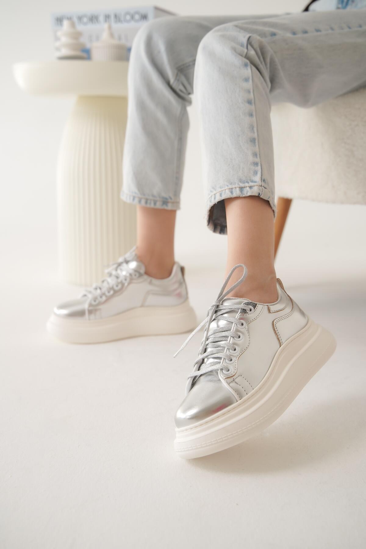 Kadın Kalın Taban Bağcıklı Spor Ayakkabı Cona Gümüş