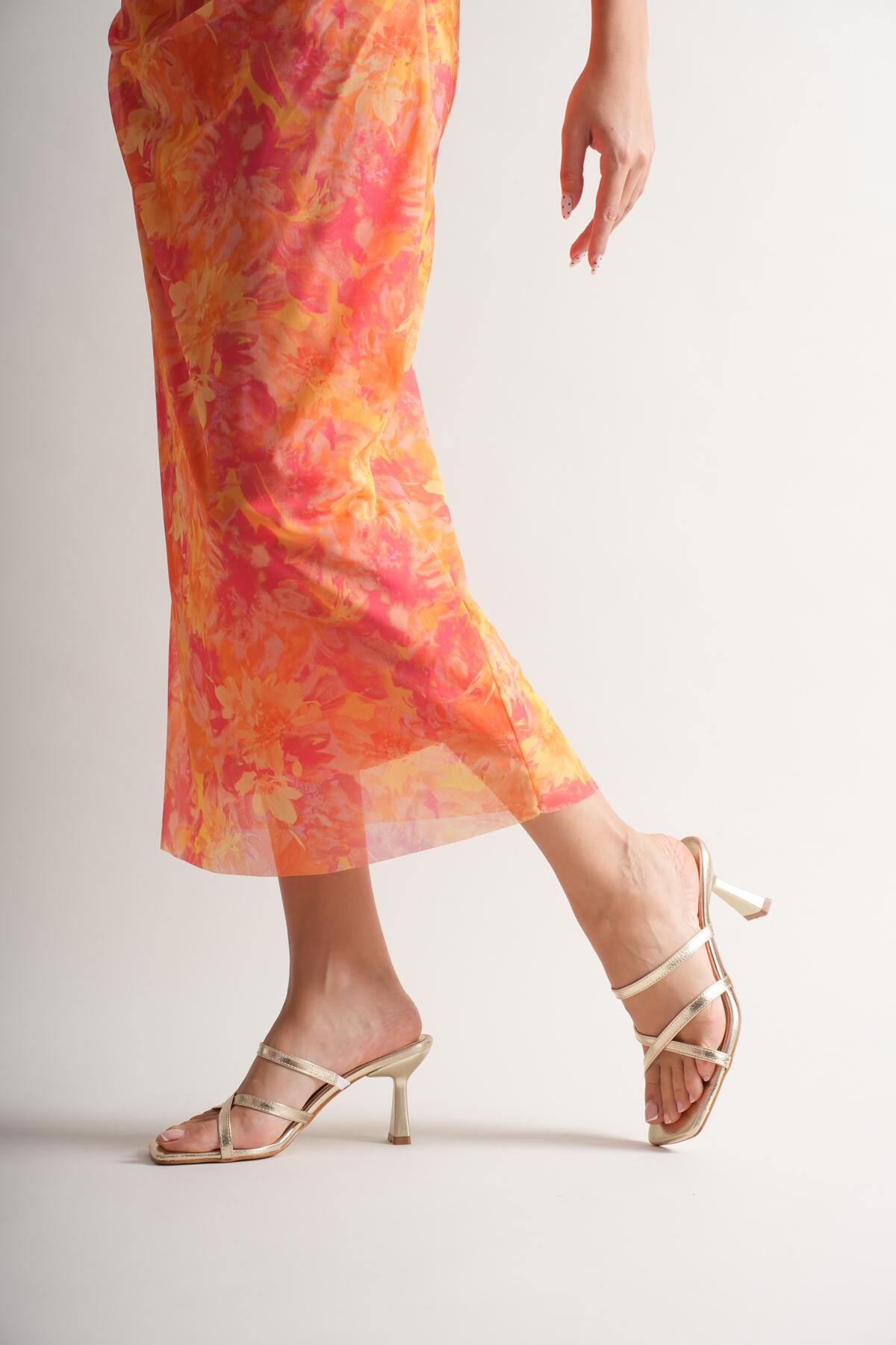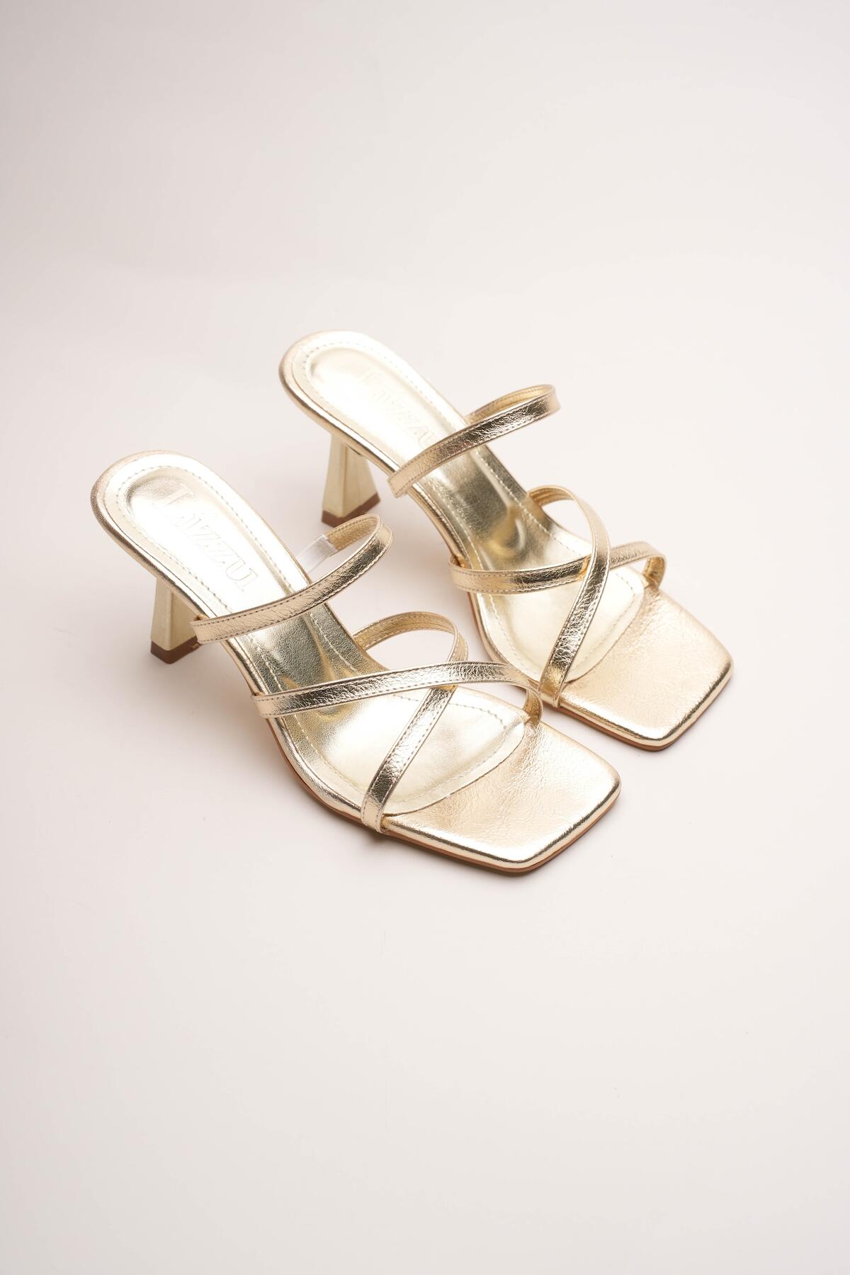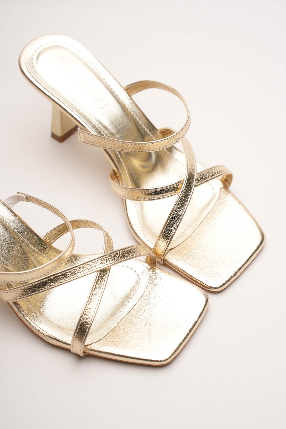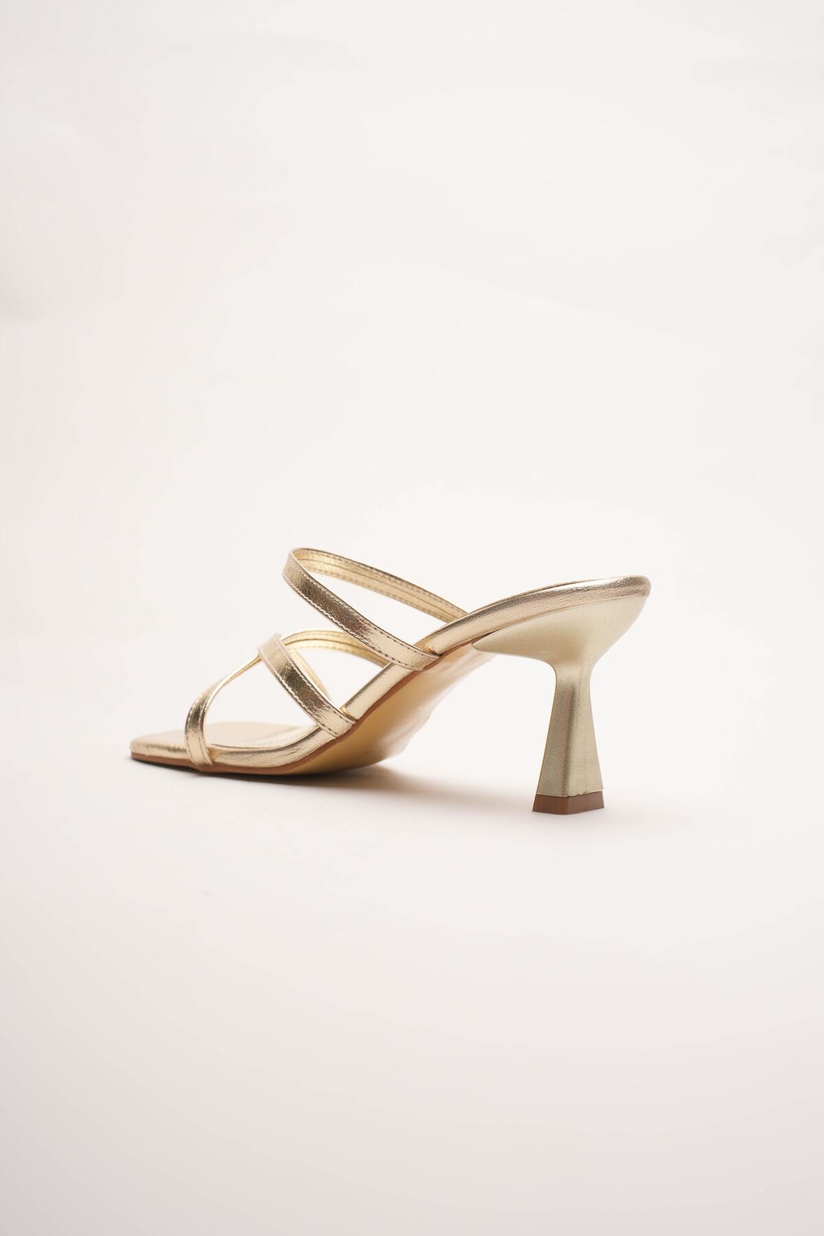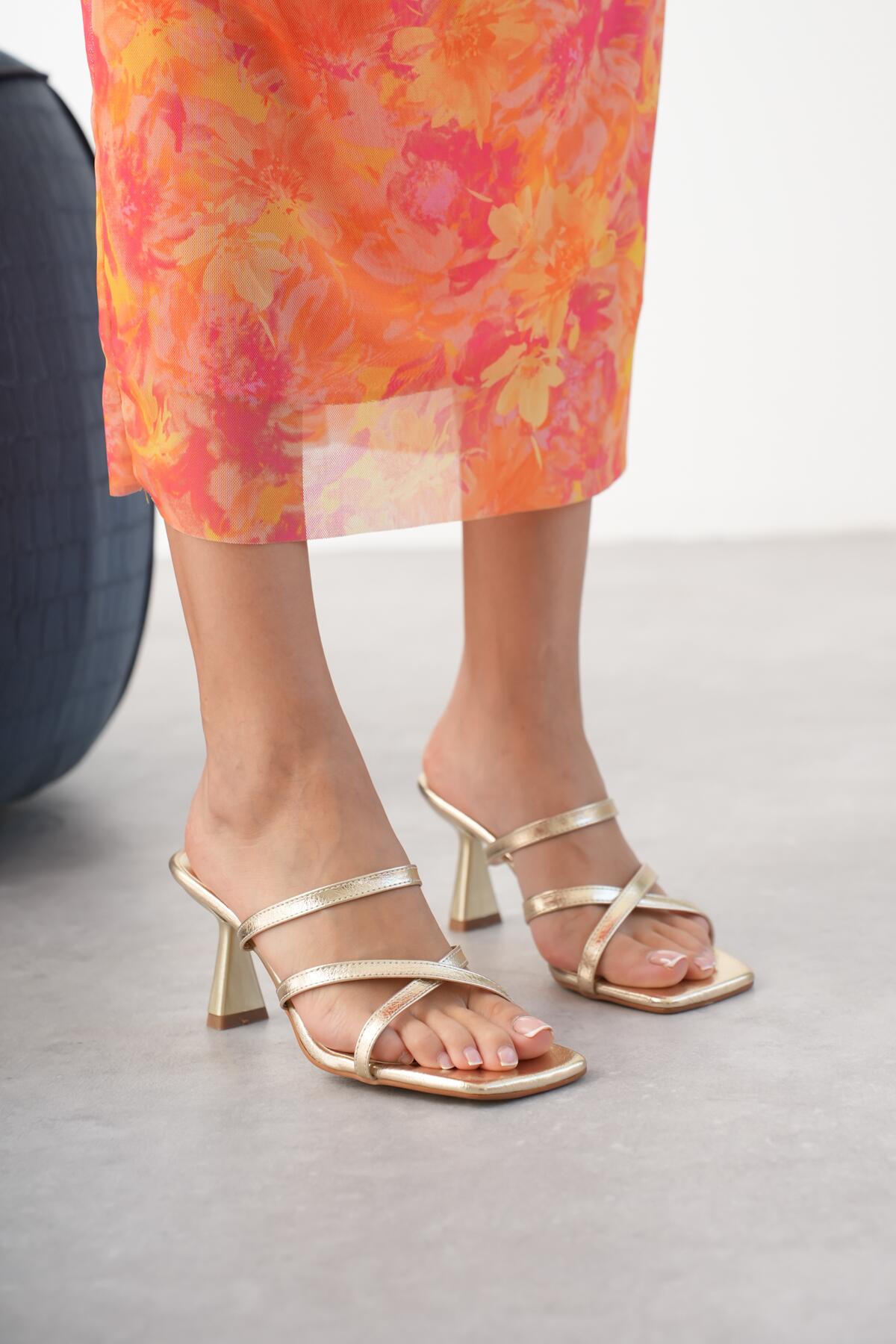 Kadın Çapraz Bantlı Tasarım Topuklu Terlik Carele Altın