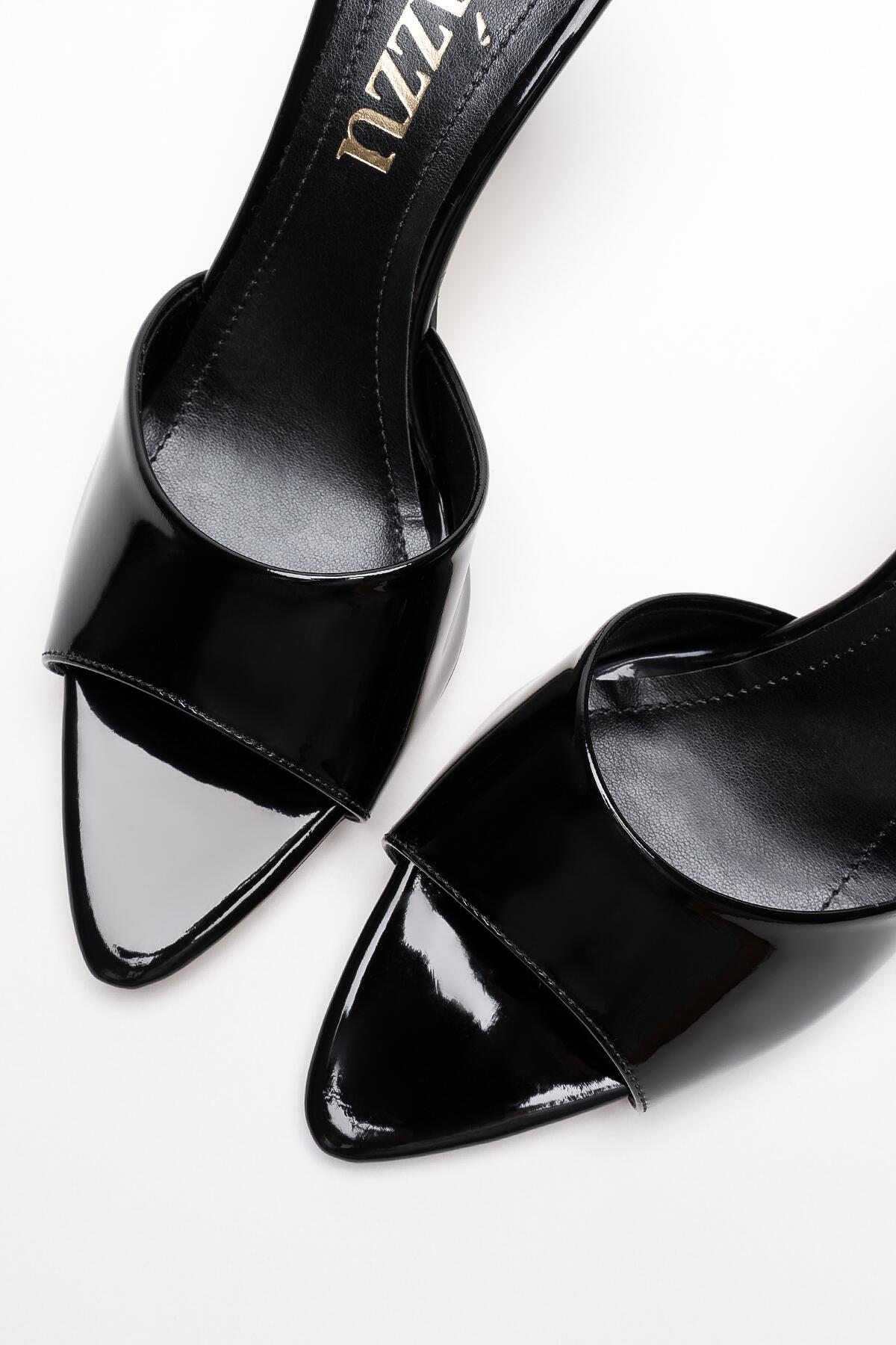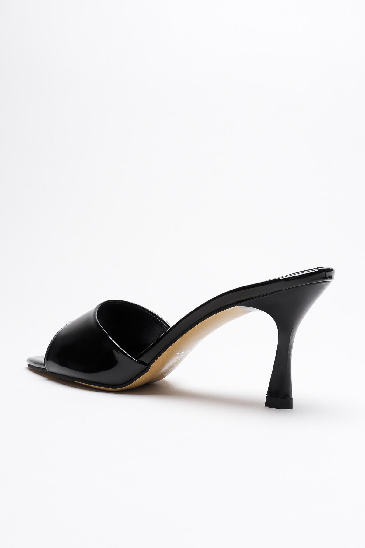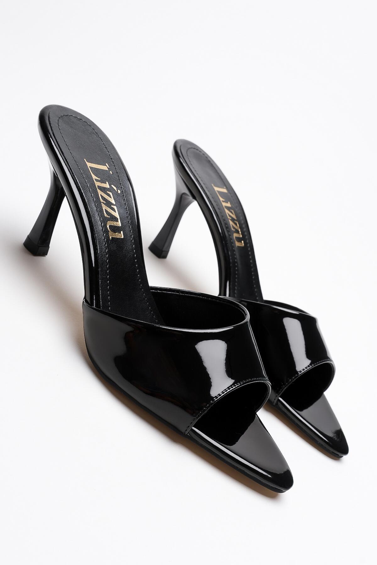 Kadın Sivri Burun Açık Topuklu Terlik Leni Siyah Rugan