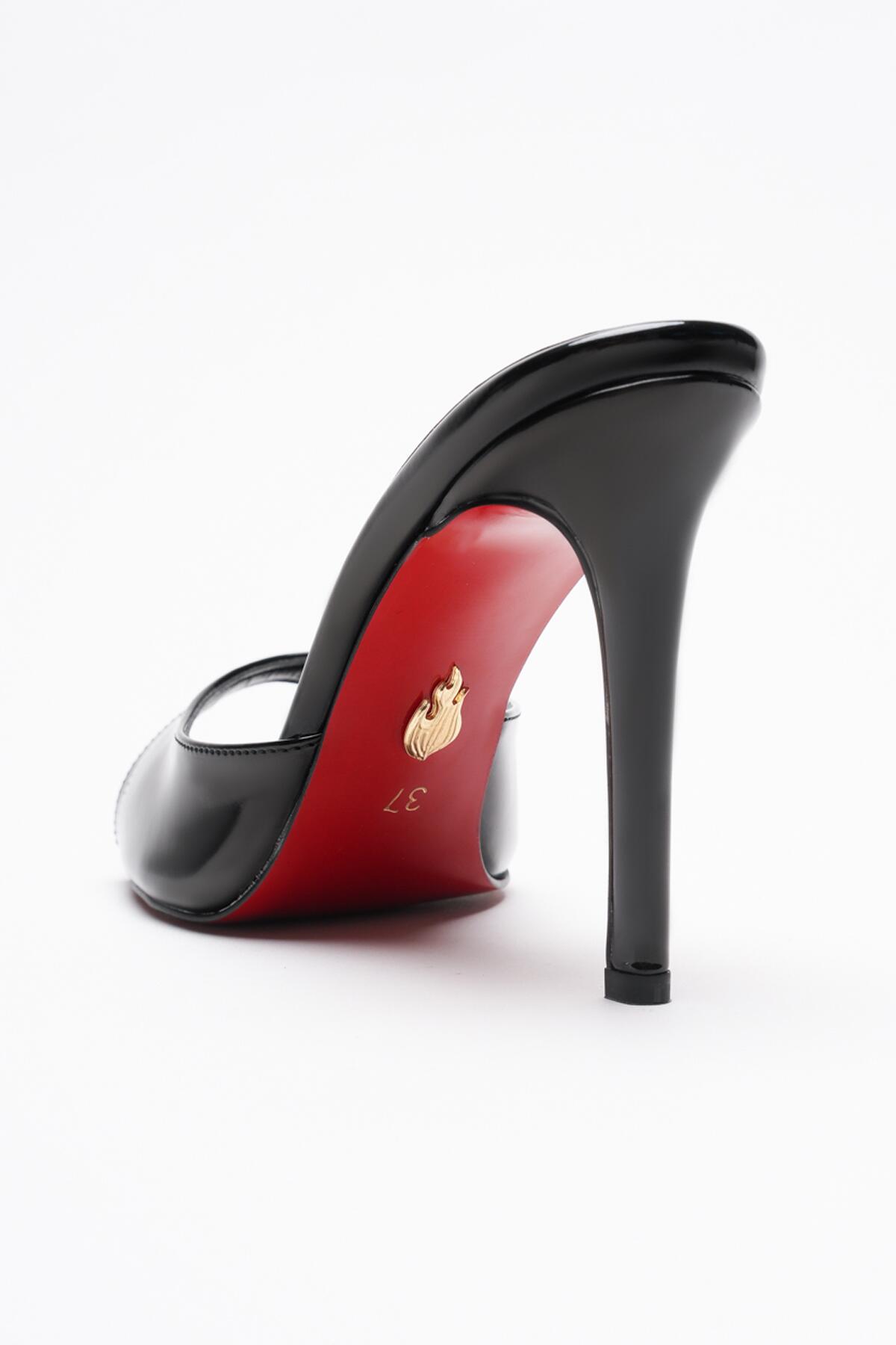 Kadın Sivri Burun İnce Topuklu Terlik Sona Siyah Rugan