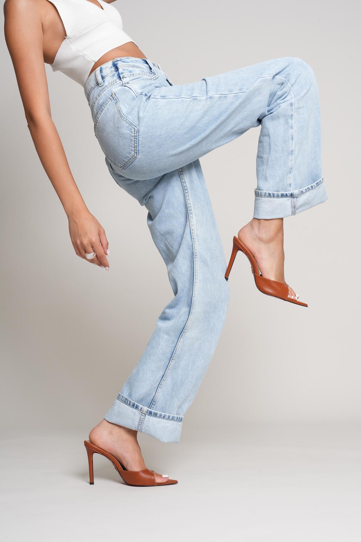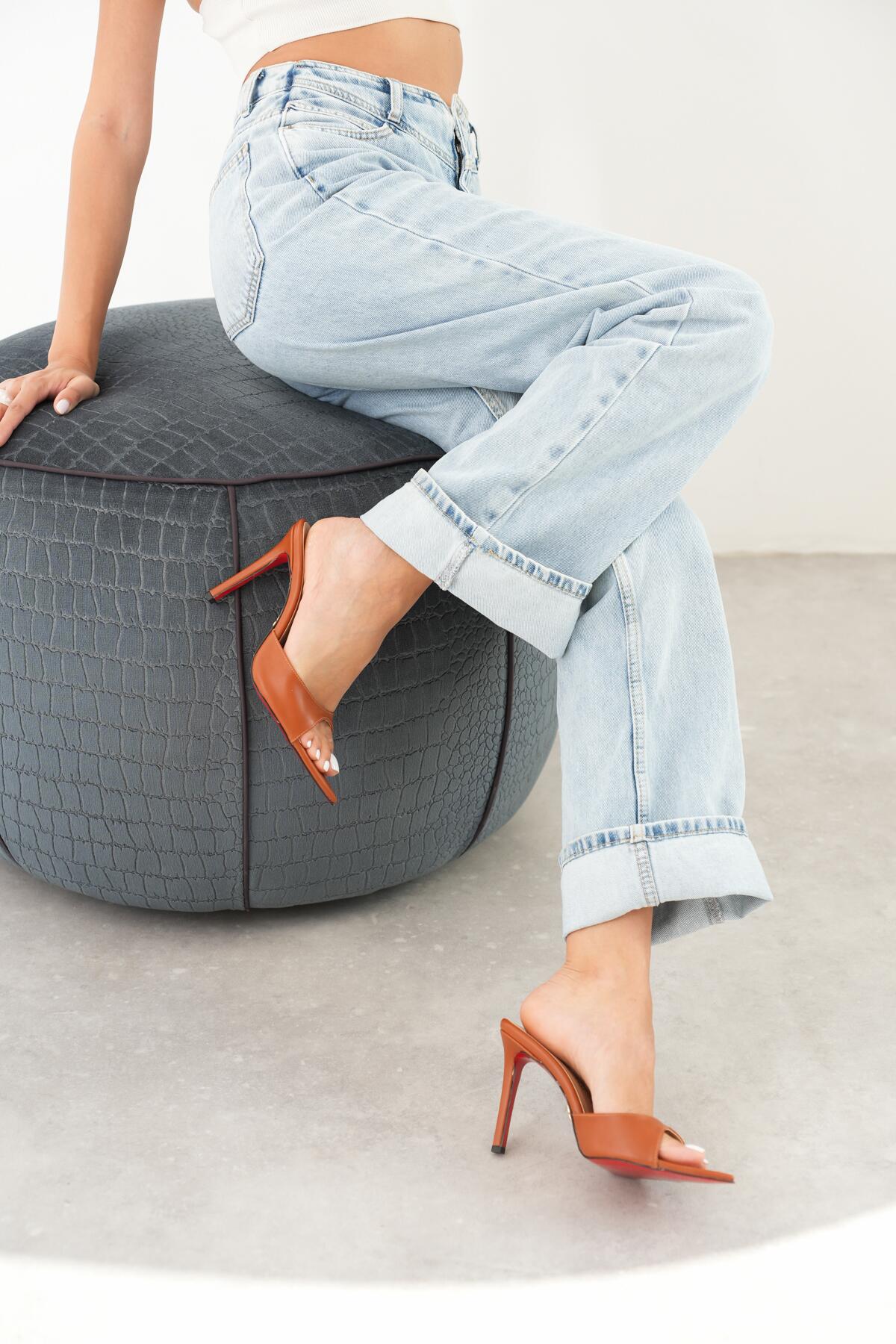 Kadın Sivri Burun İnce Topuklu Terlik Sona Taba Cilt