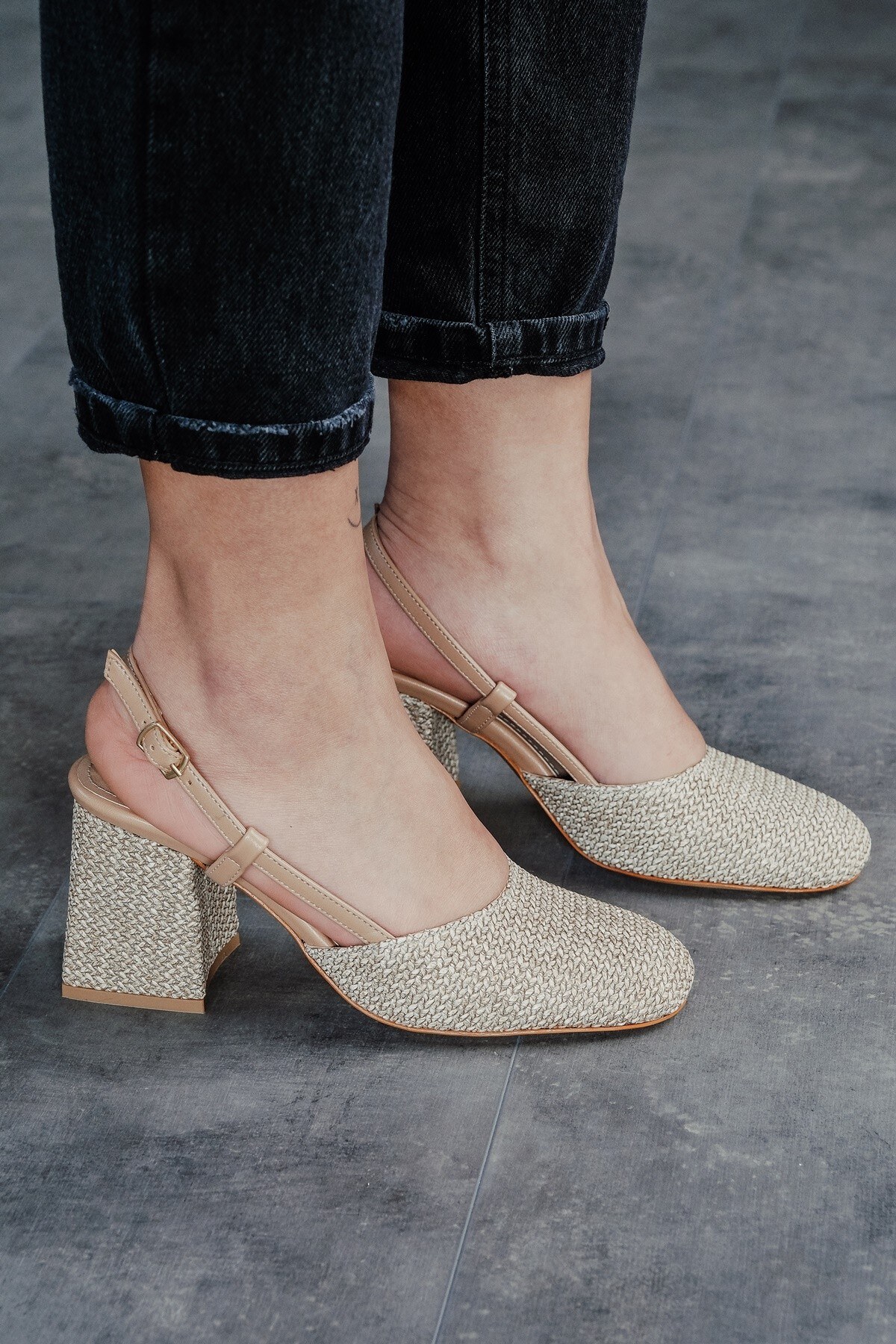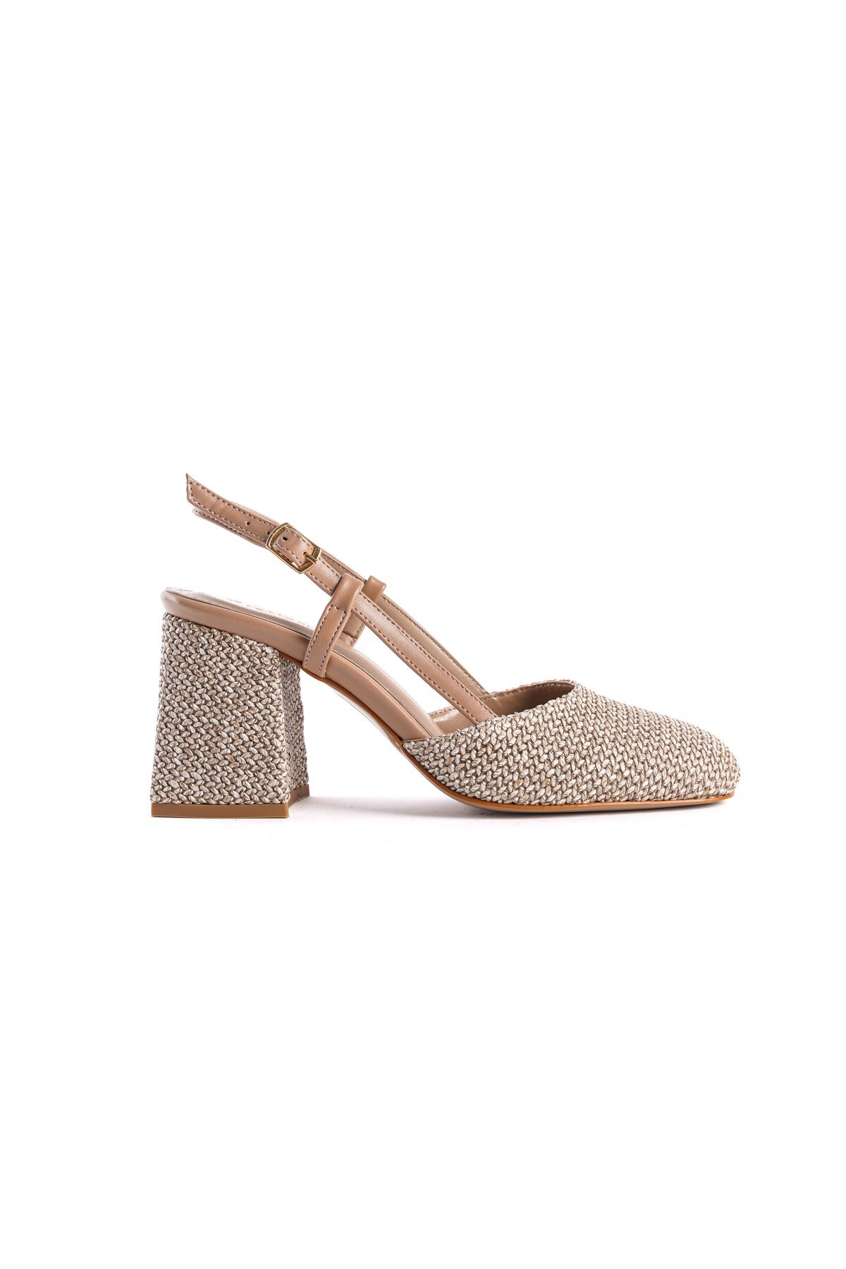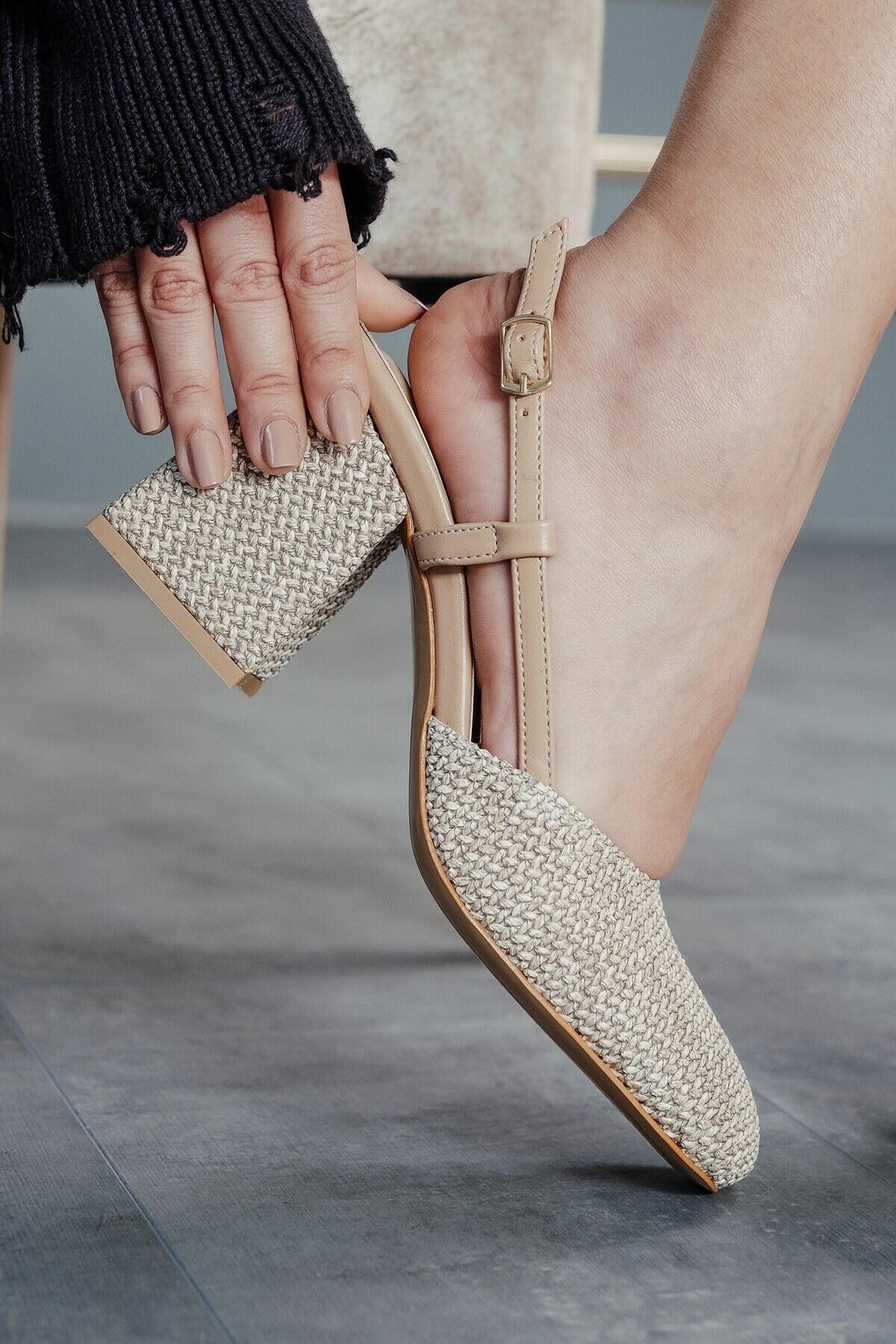 Bej Hasır Cilt Baretli Kalın Topuklu Ayakkabı Niloya Bej