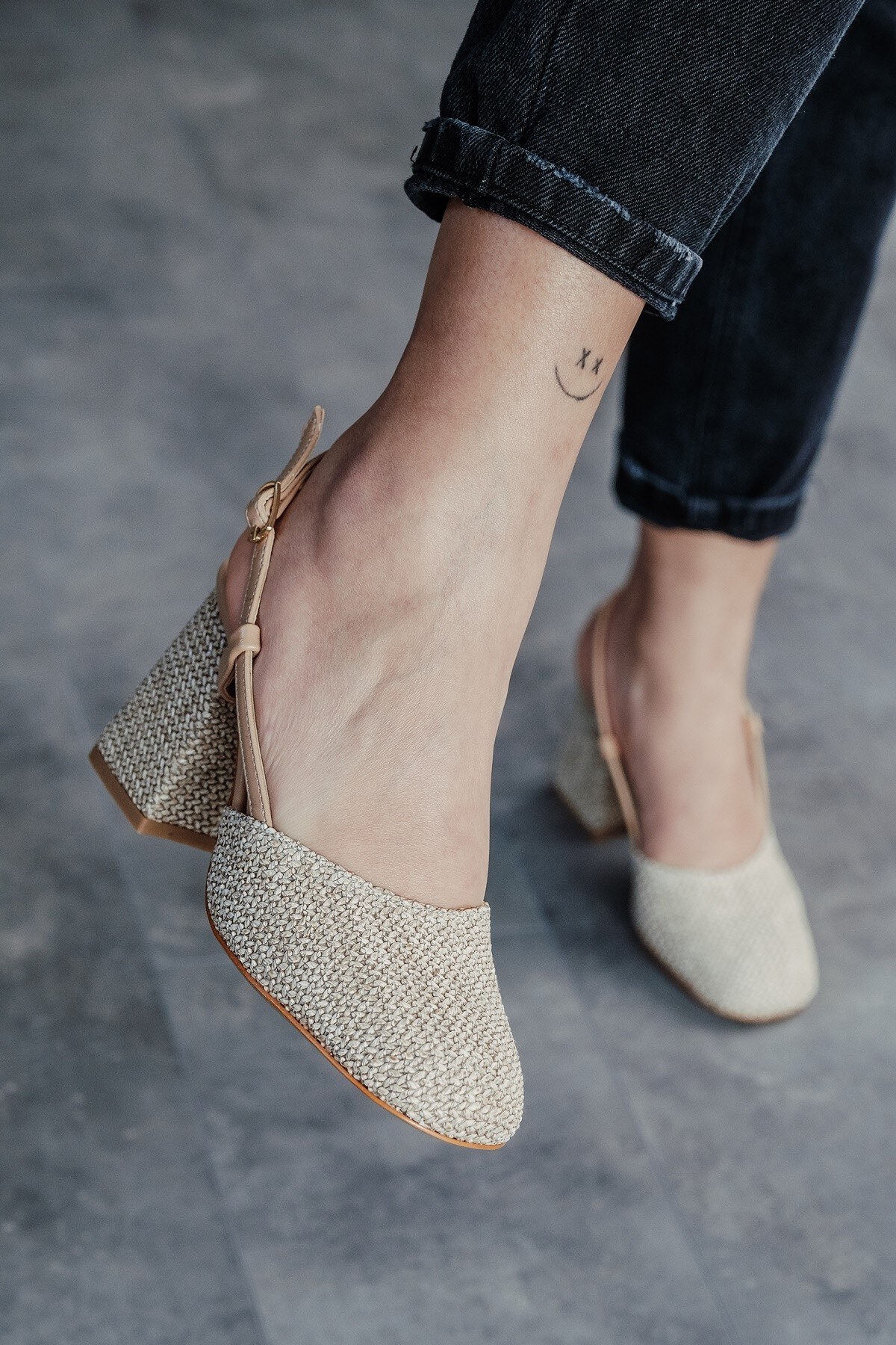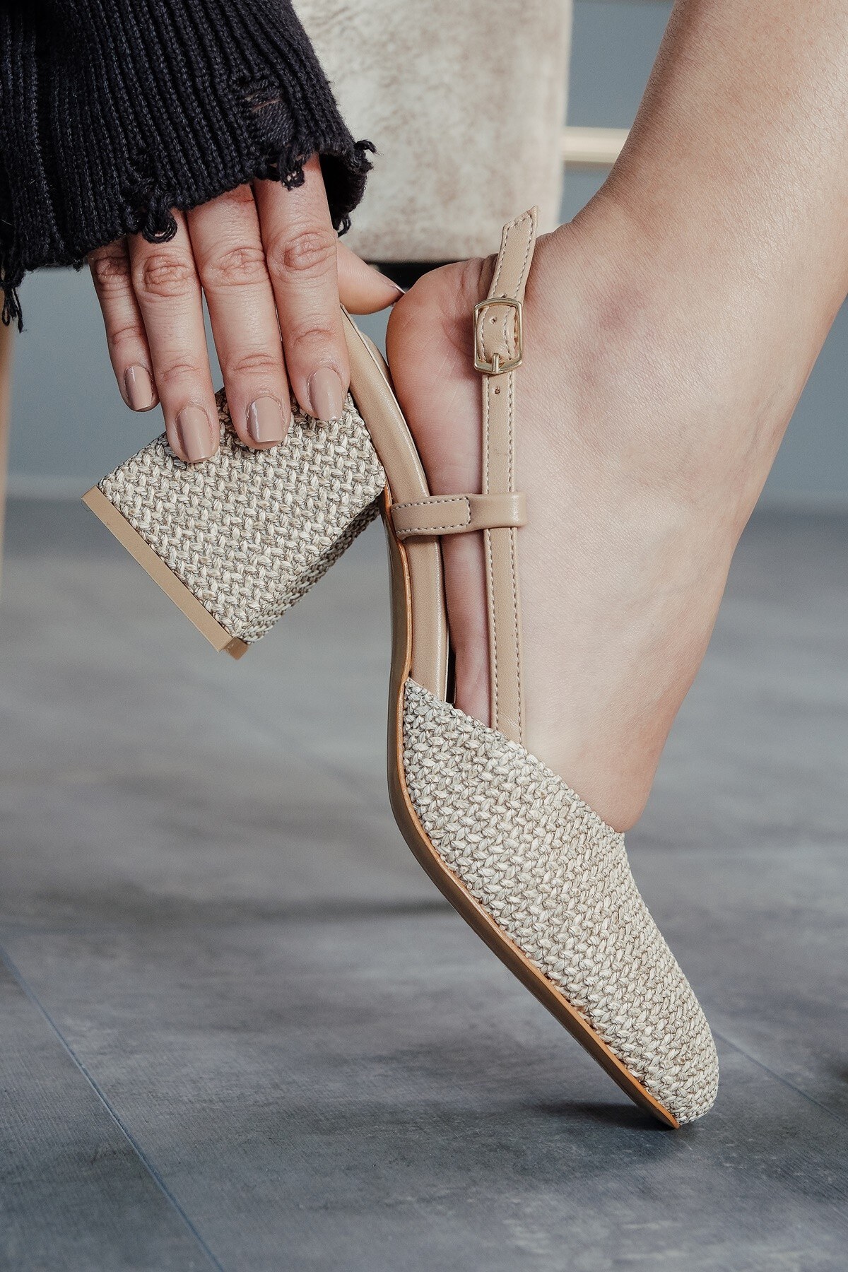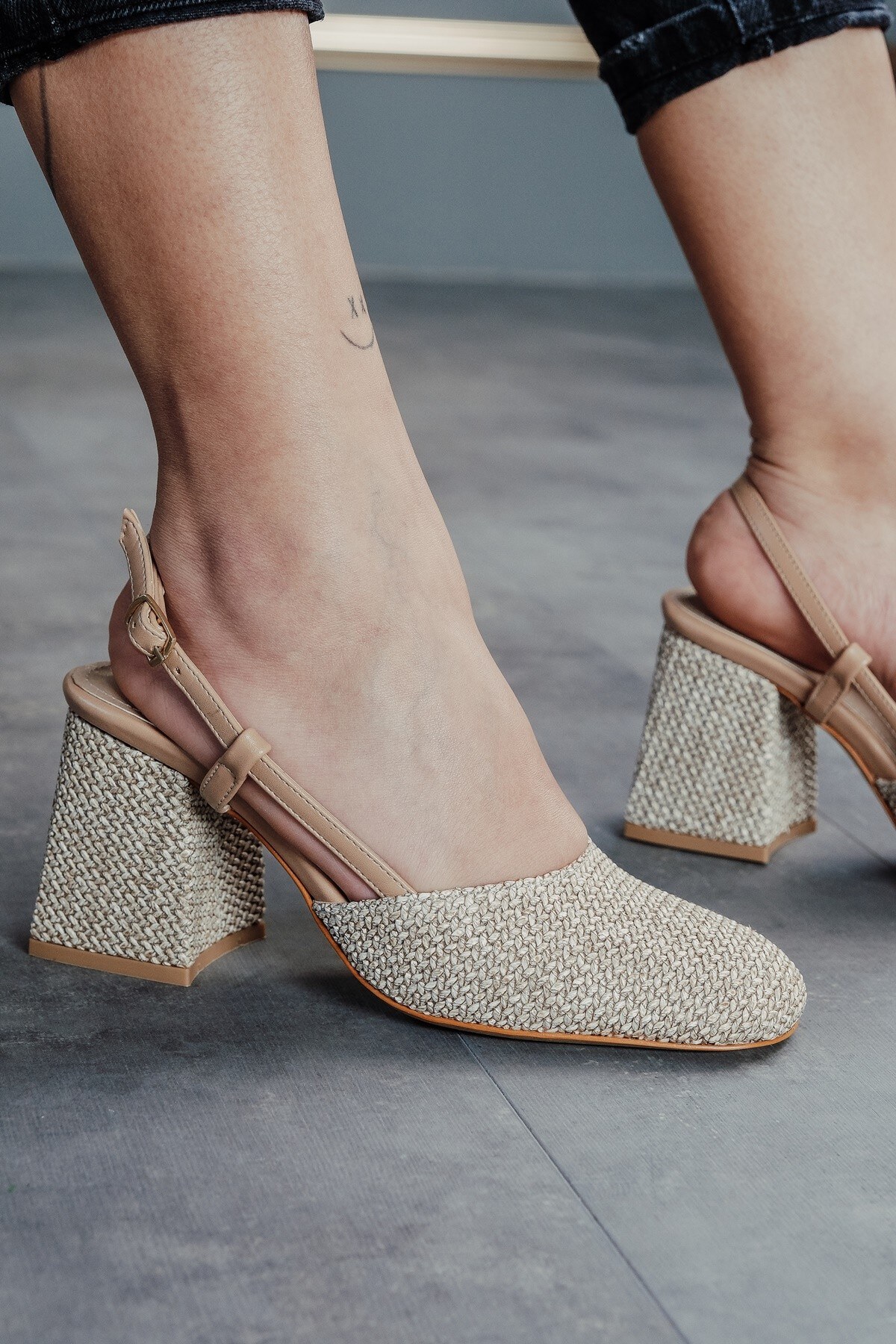 Bej Hasır Cilt Baretli Kalın Topuklu Ayakkabı Niloya Bej