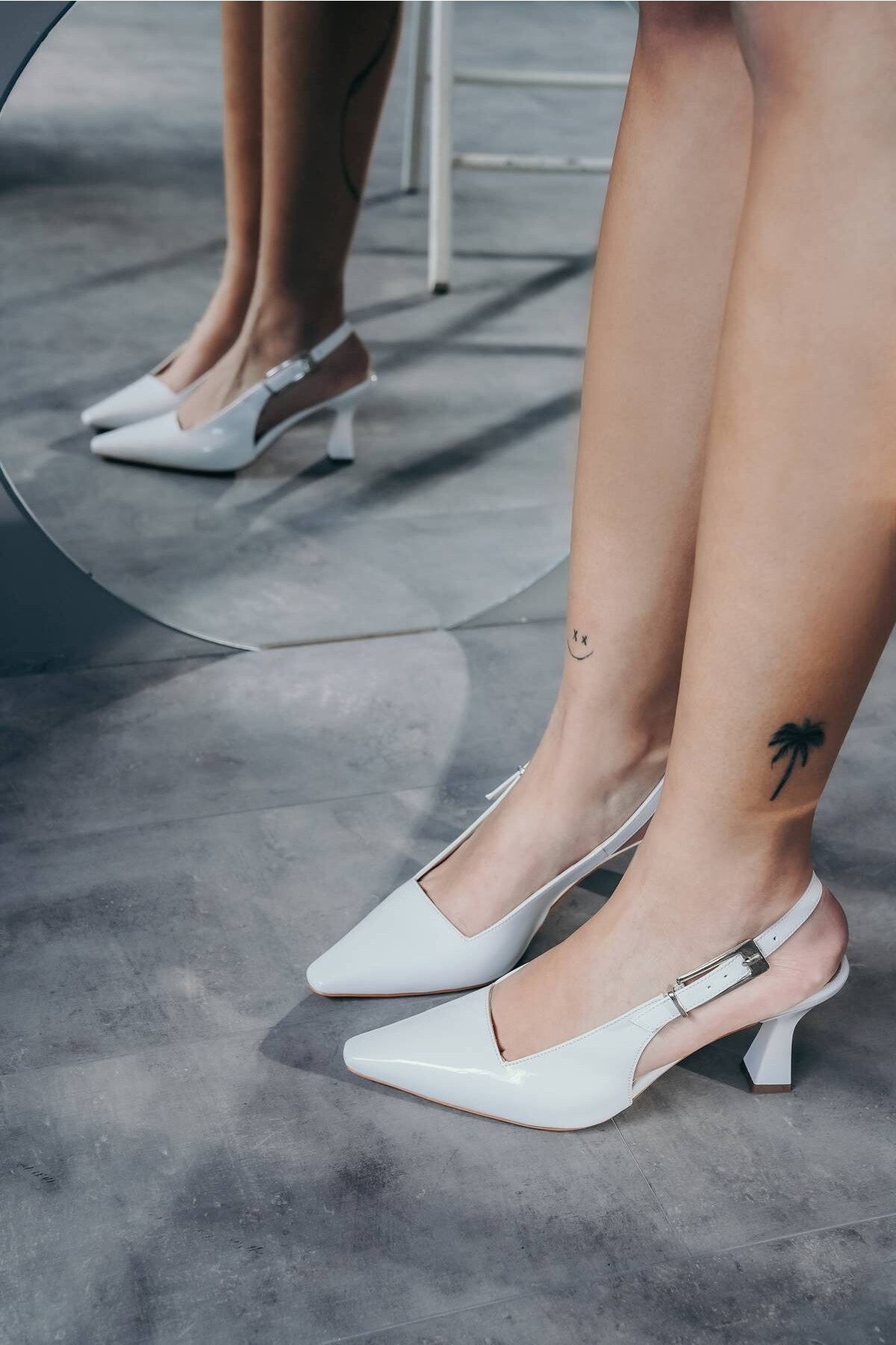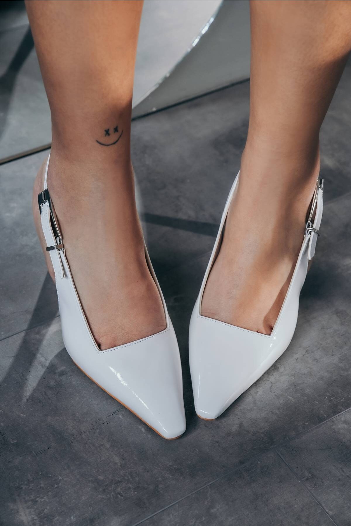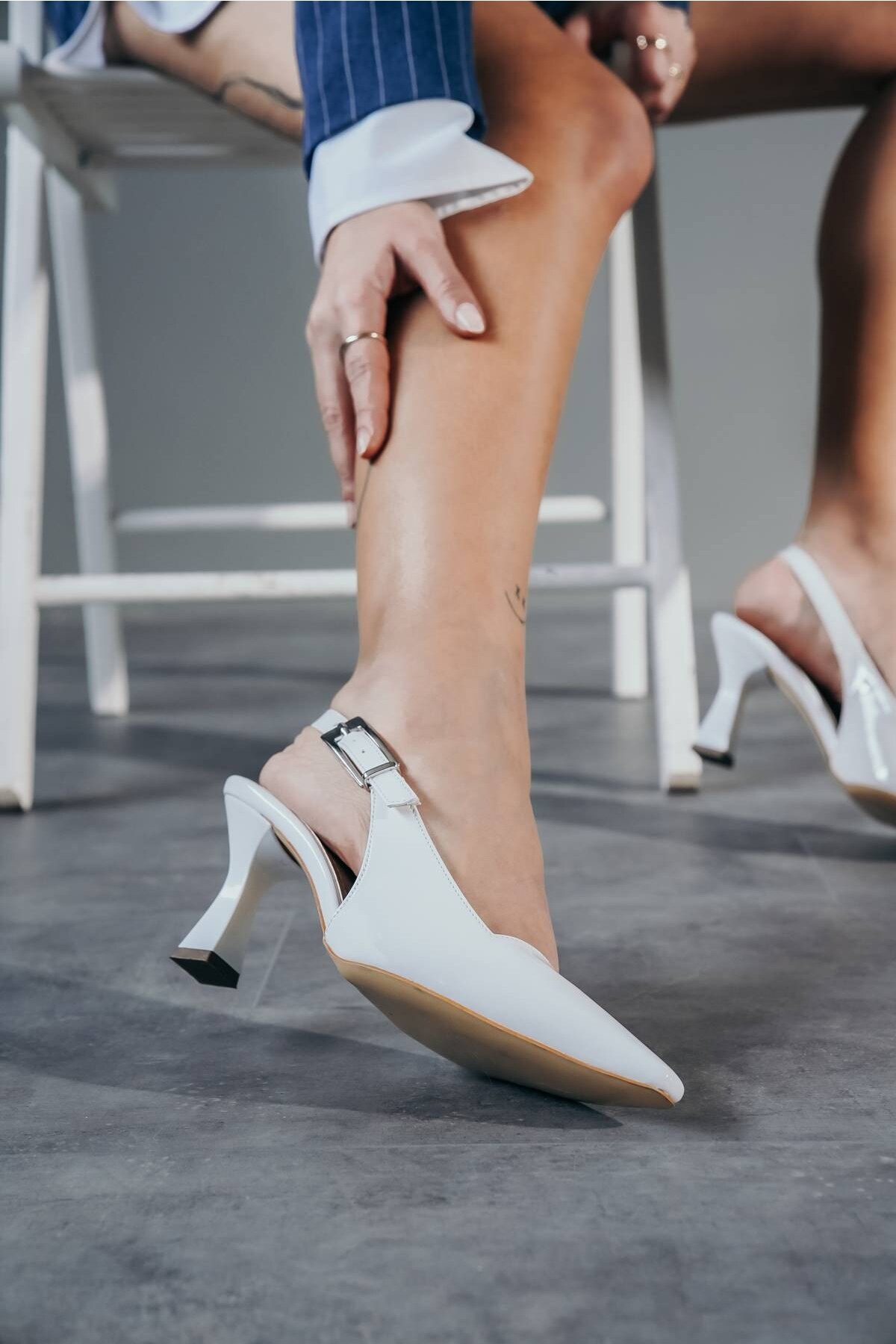 Beyaz Rugan Tasarım Tokalı Kadın Topuklu Ayakkabı Niola Beyaz Rugan