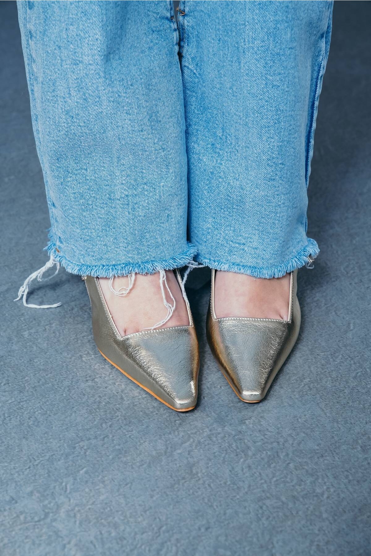 Altın Parlak Cilt Biyeli Kadın Topuklu Ayakkabı Yonni