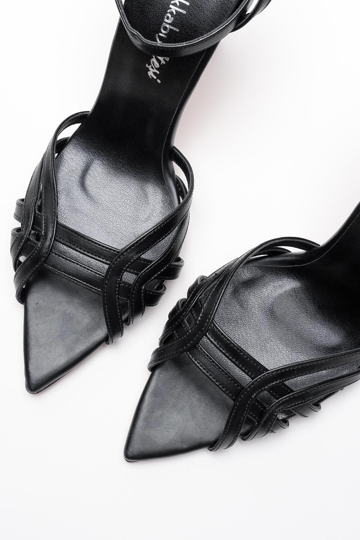 Kadın Açık Kafes Burun Tasarım İnce Topuklu Ayakkabı Prona Siyah Cilt