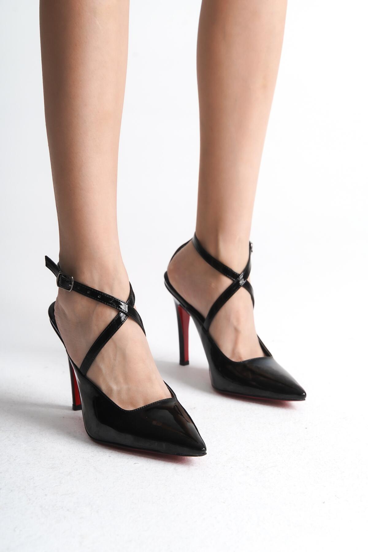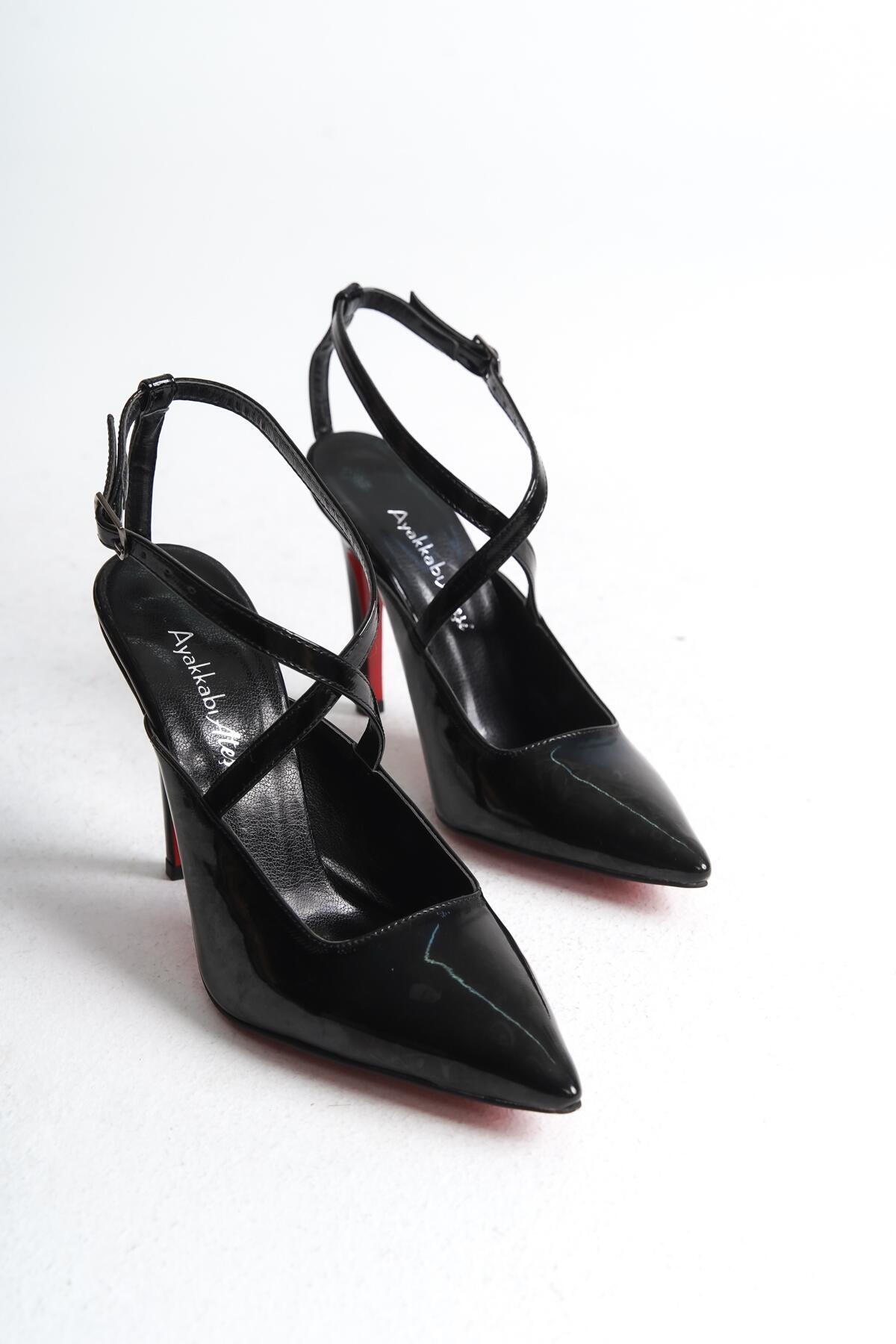 Kadın Arka Açık Tasarım İnce Topuklu Ayakkabı Rileyya Siyah Rugan