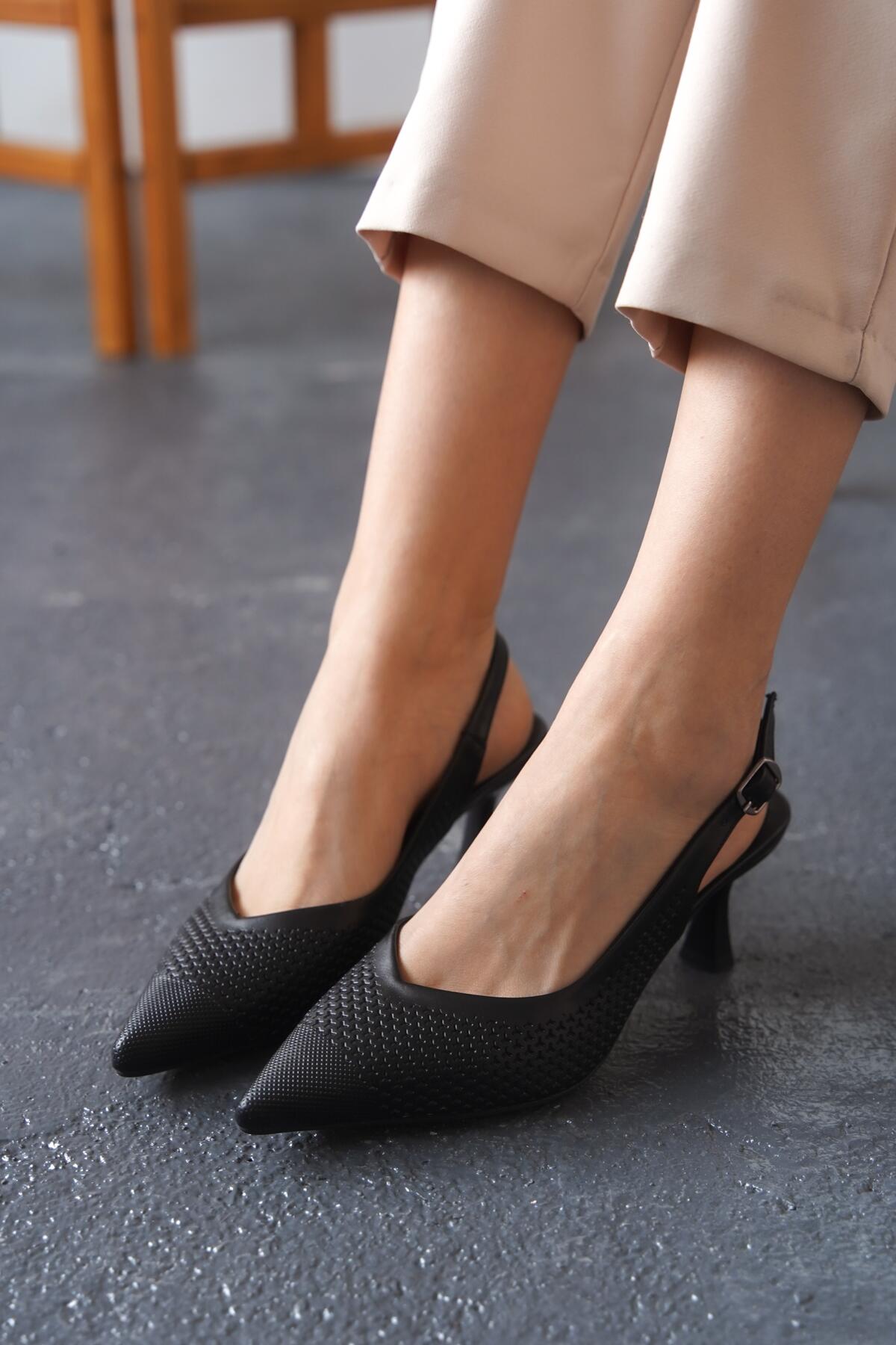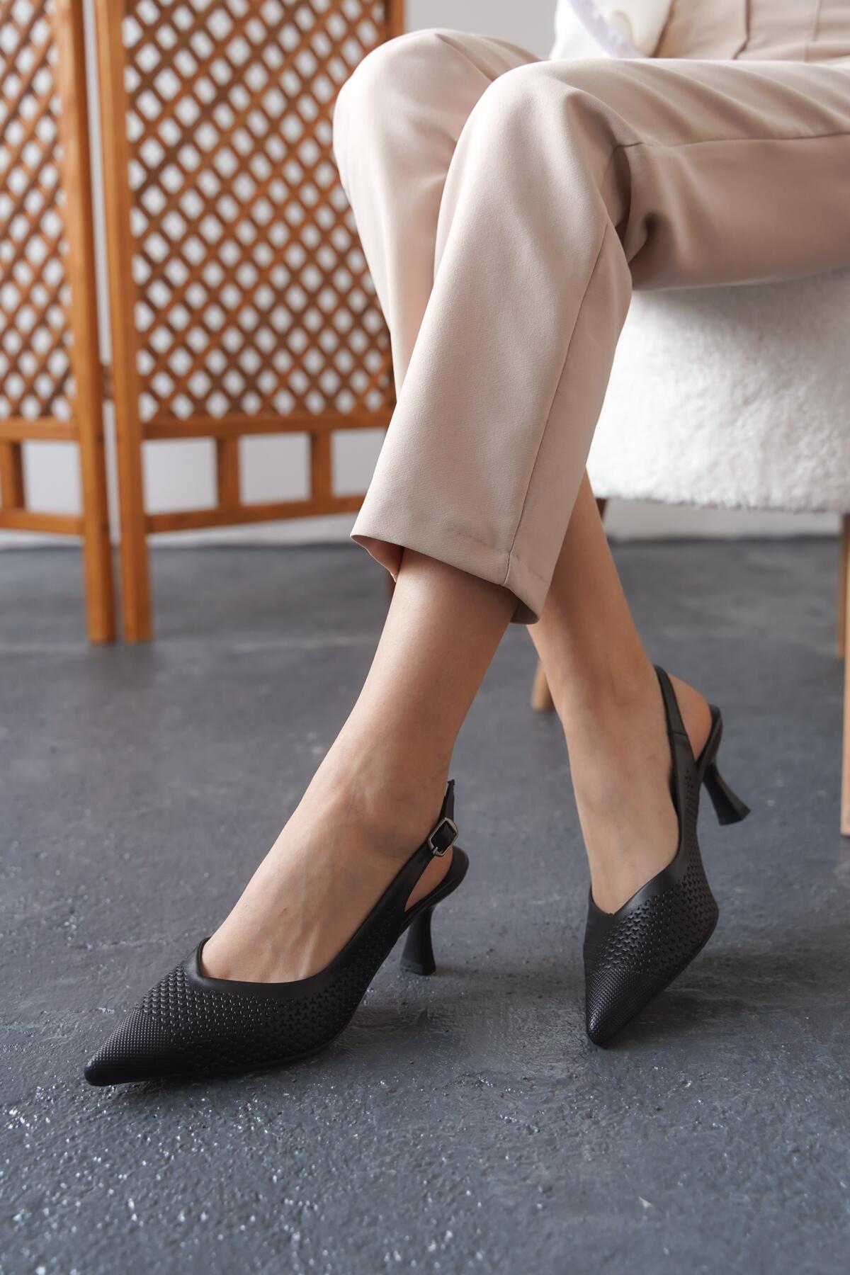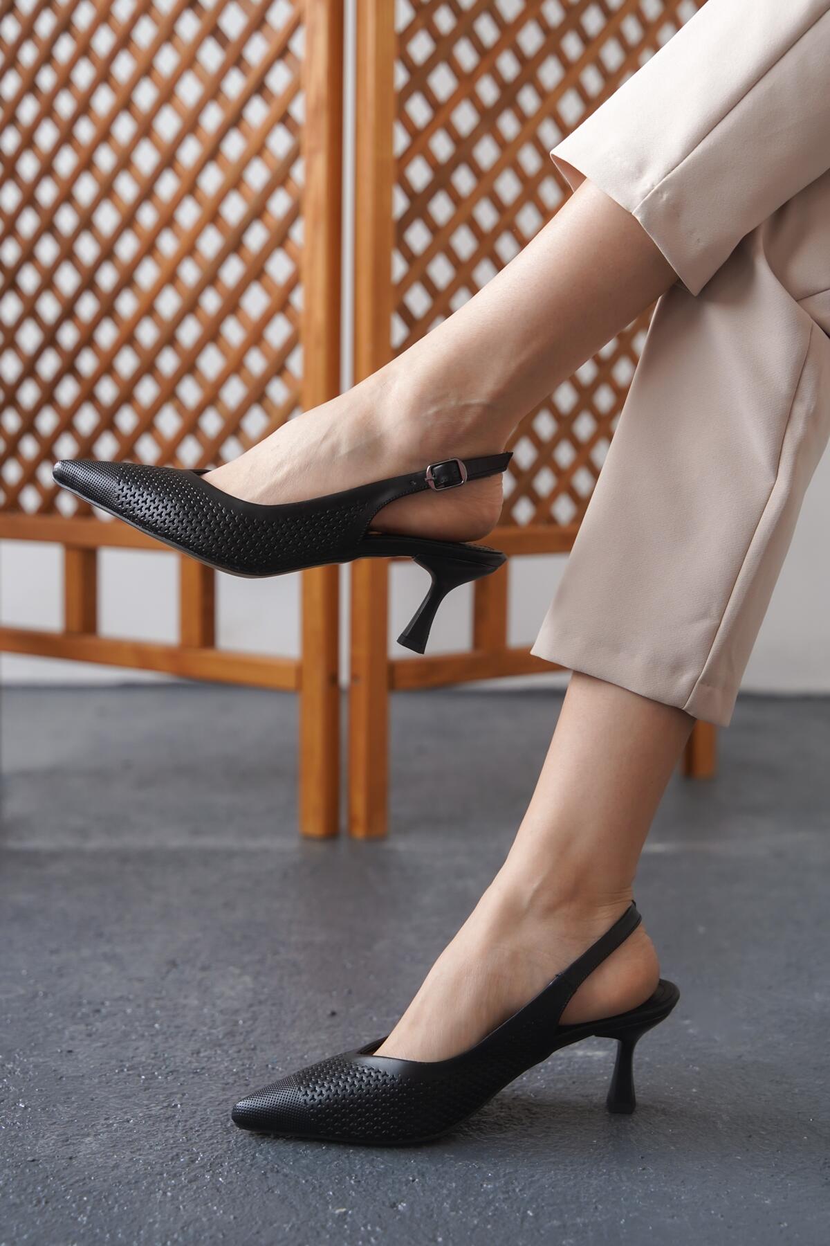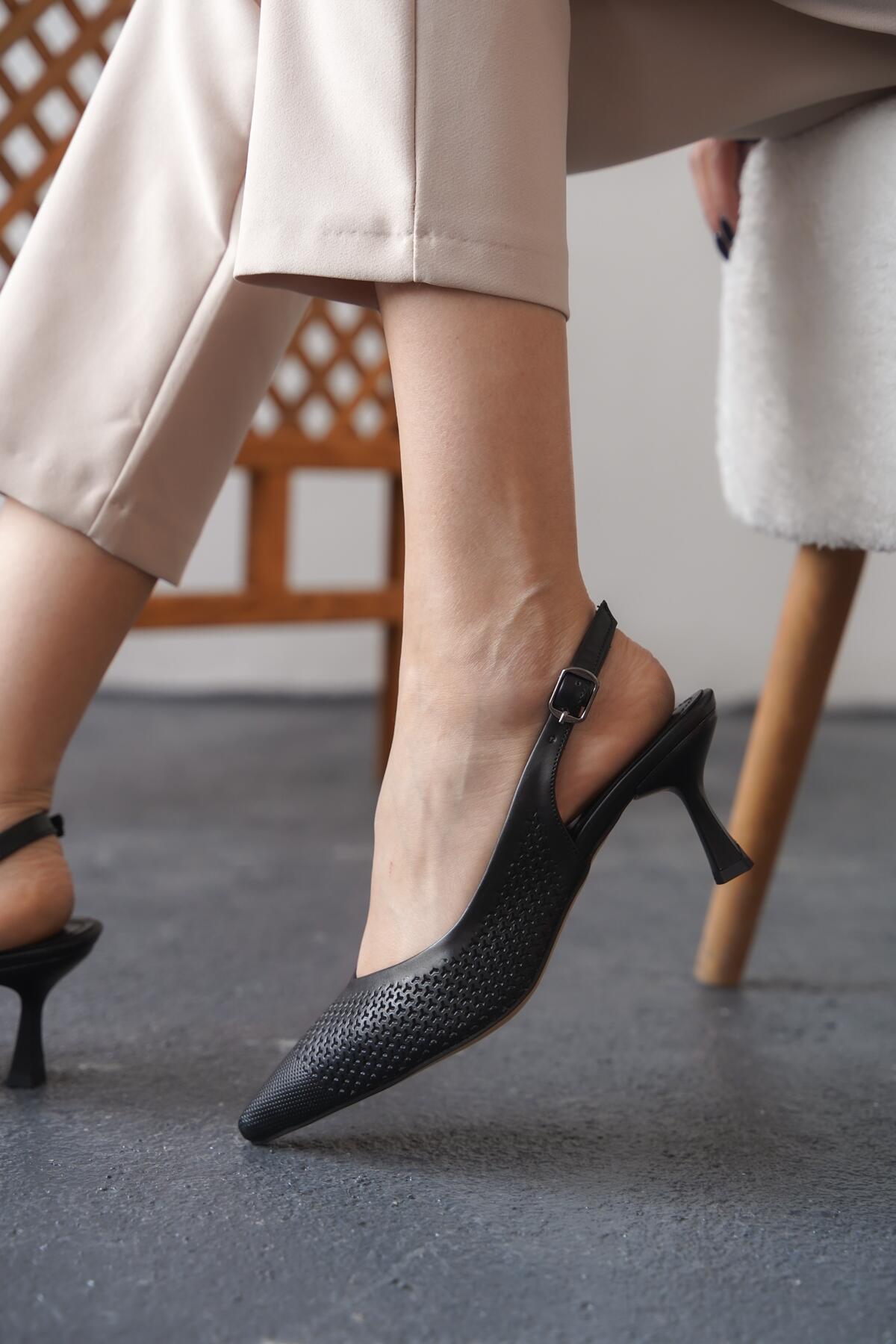 Kadın Arkası Açık Lazer Delikli Orta Topuklu Ayakkabı Coan Siyah Cilt