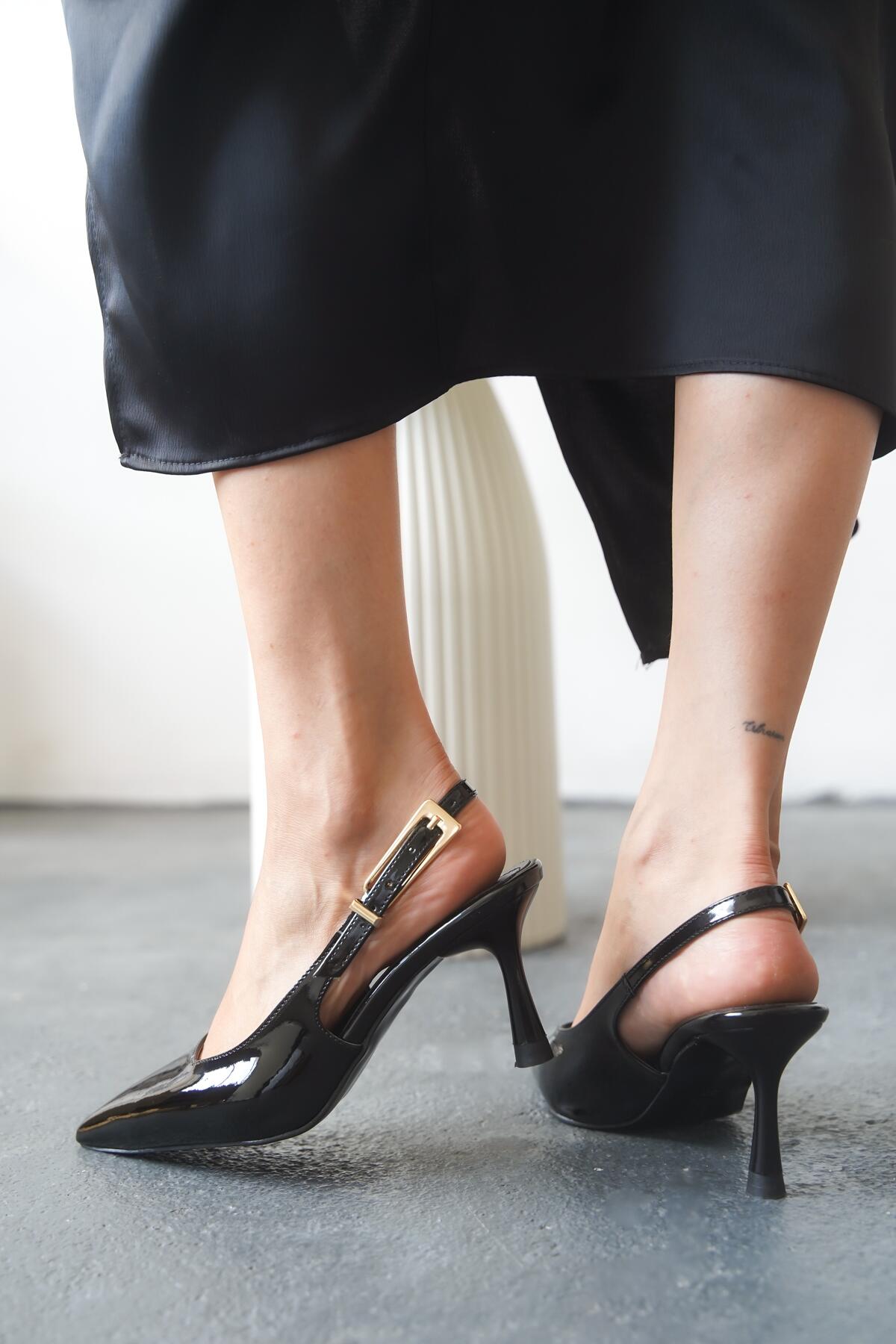 Kadın Arkası Açık Tasarım Tokalı Topuklu Ayakkabı Claria Siyah Rugan