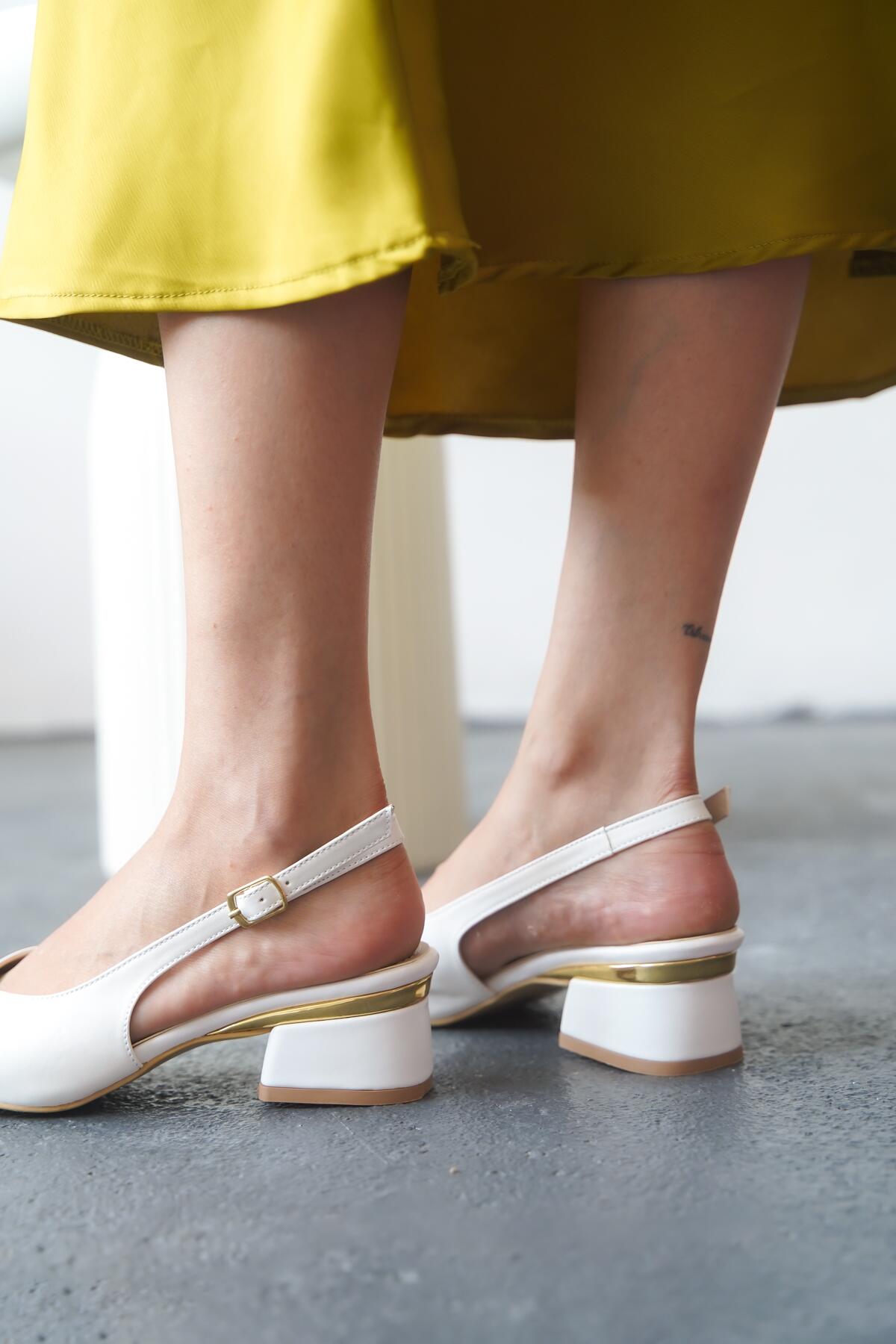 Kadın Arkası Açık Toka Detaylı Kısa Topuklu Ayakkabı Kabbi Beyaz Cilt