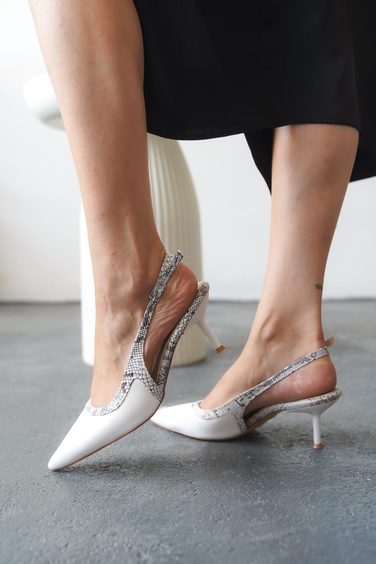 Kadın Arkası Açık Yılan Desenli Kısa Topuklu Ayakkabı Beyaz Cilt