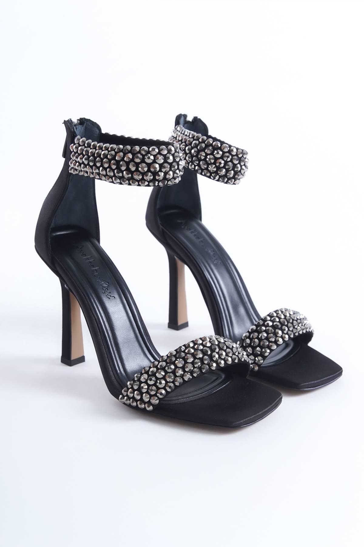 Kadın Büyük Taş Baret Ve Detaylı Orta Topuklu Ayakkabı Dimeria Siyah Saten