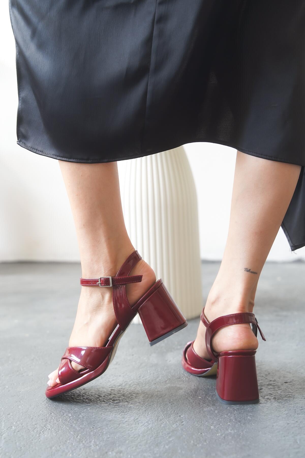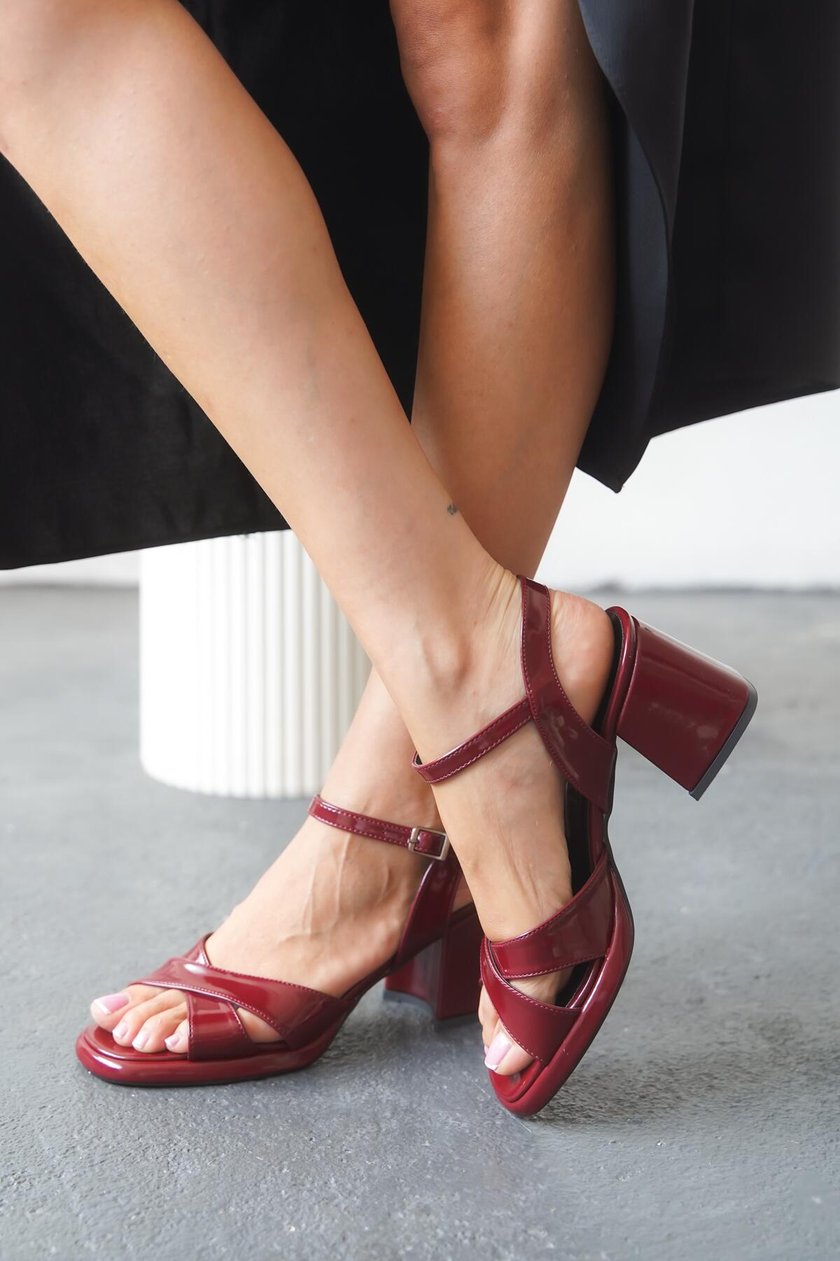 Kadın Çapraz Bant Kalın Topuklu Ayakkabı Meriye Bordo