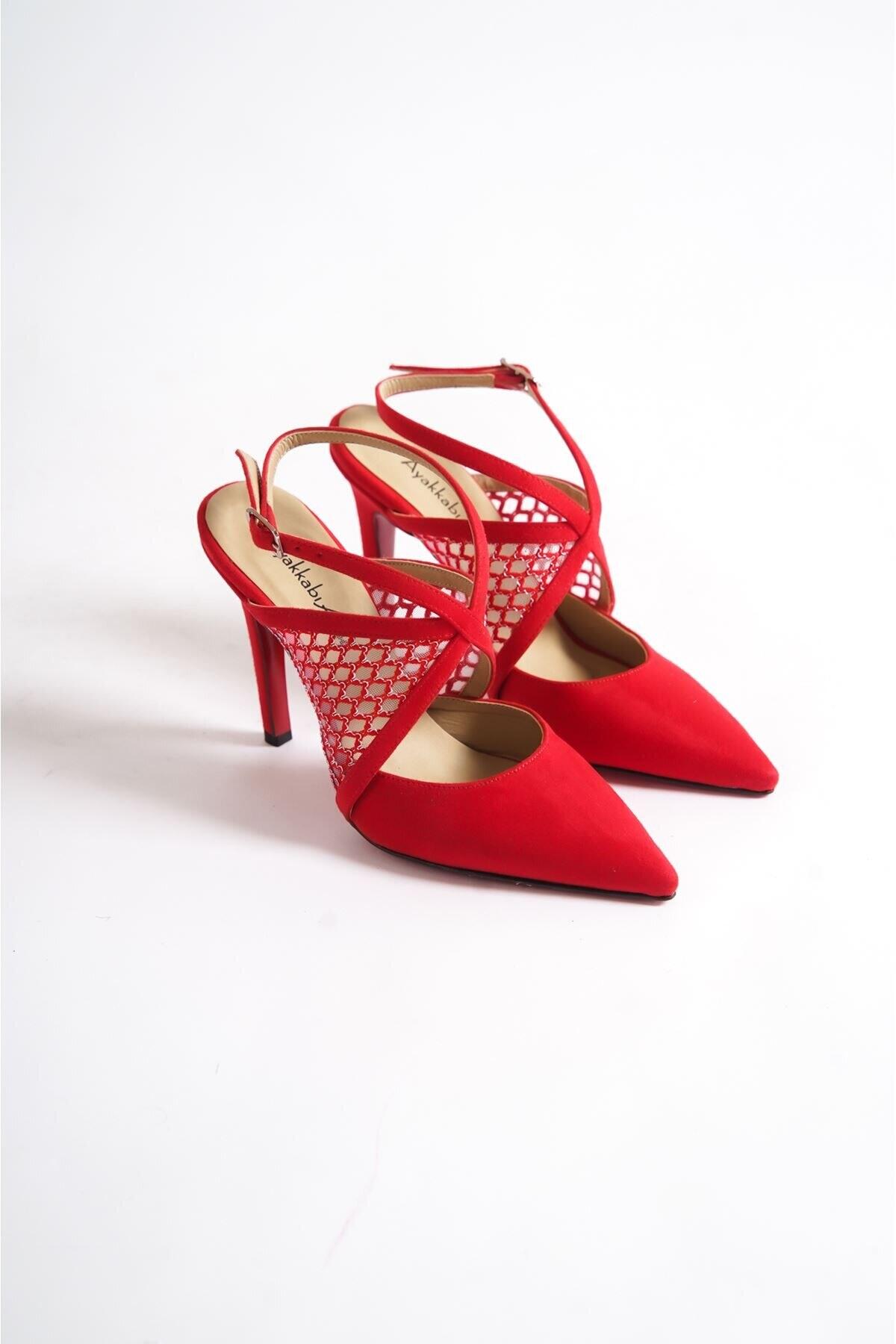 Kadın File Detaylı Özel Tasarım İnce Topuklu Ayakkabı Stiletto Harlow Kırmızı Süet