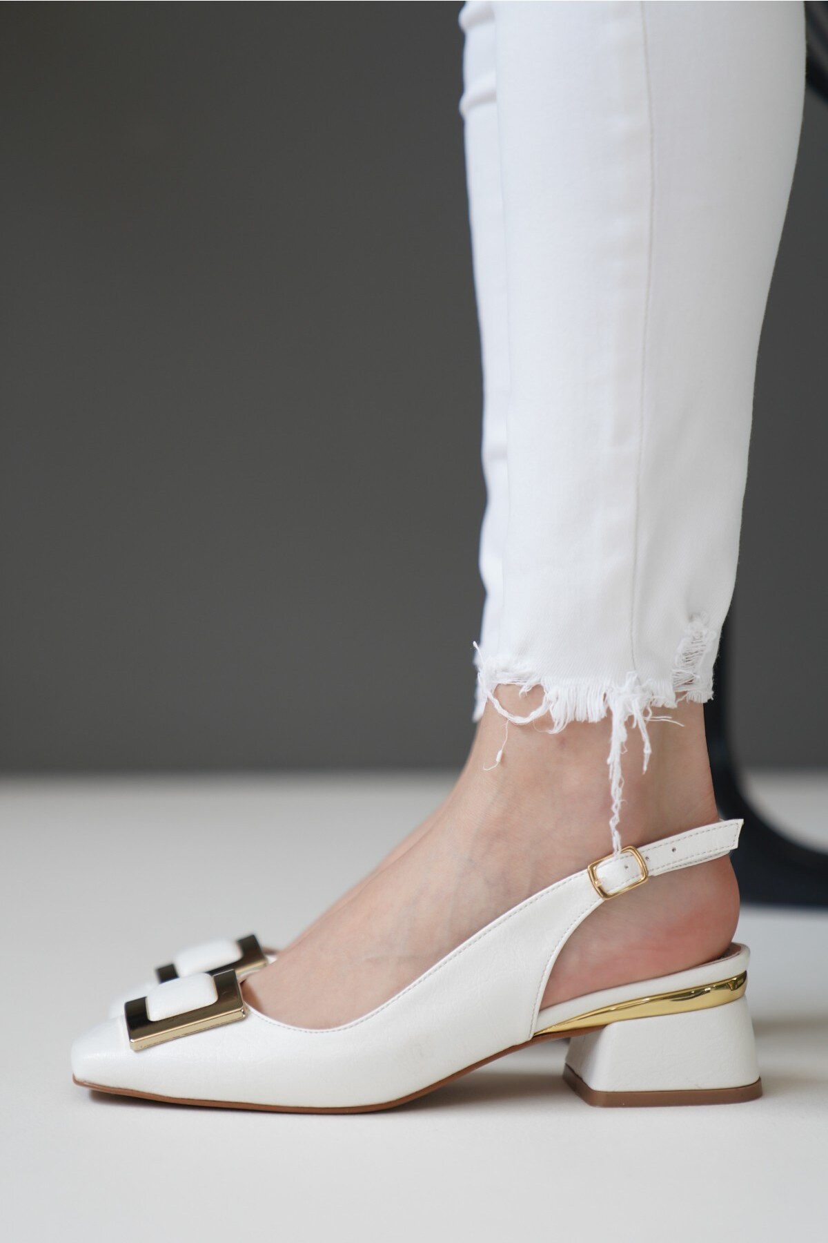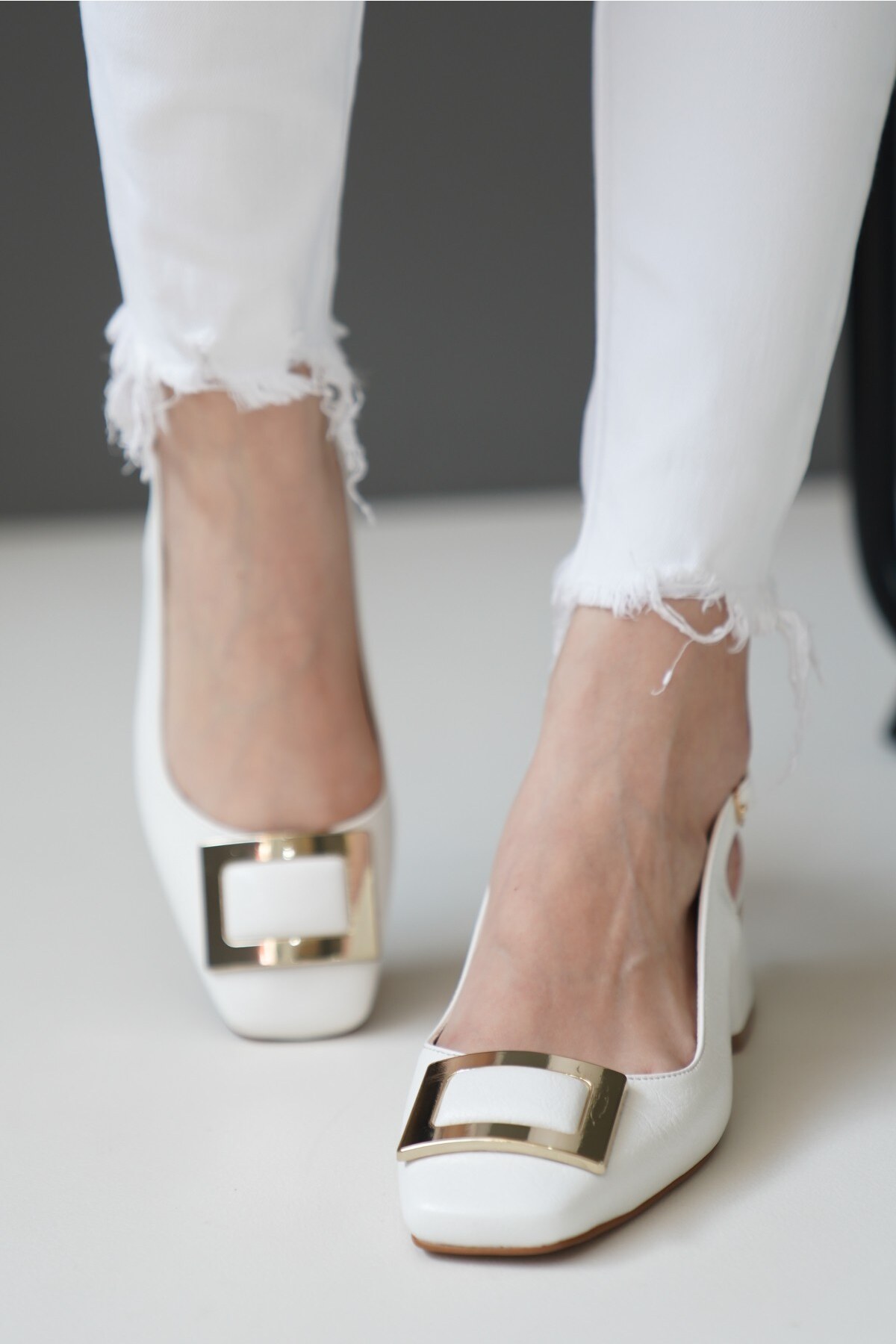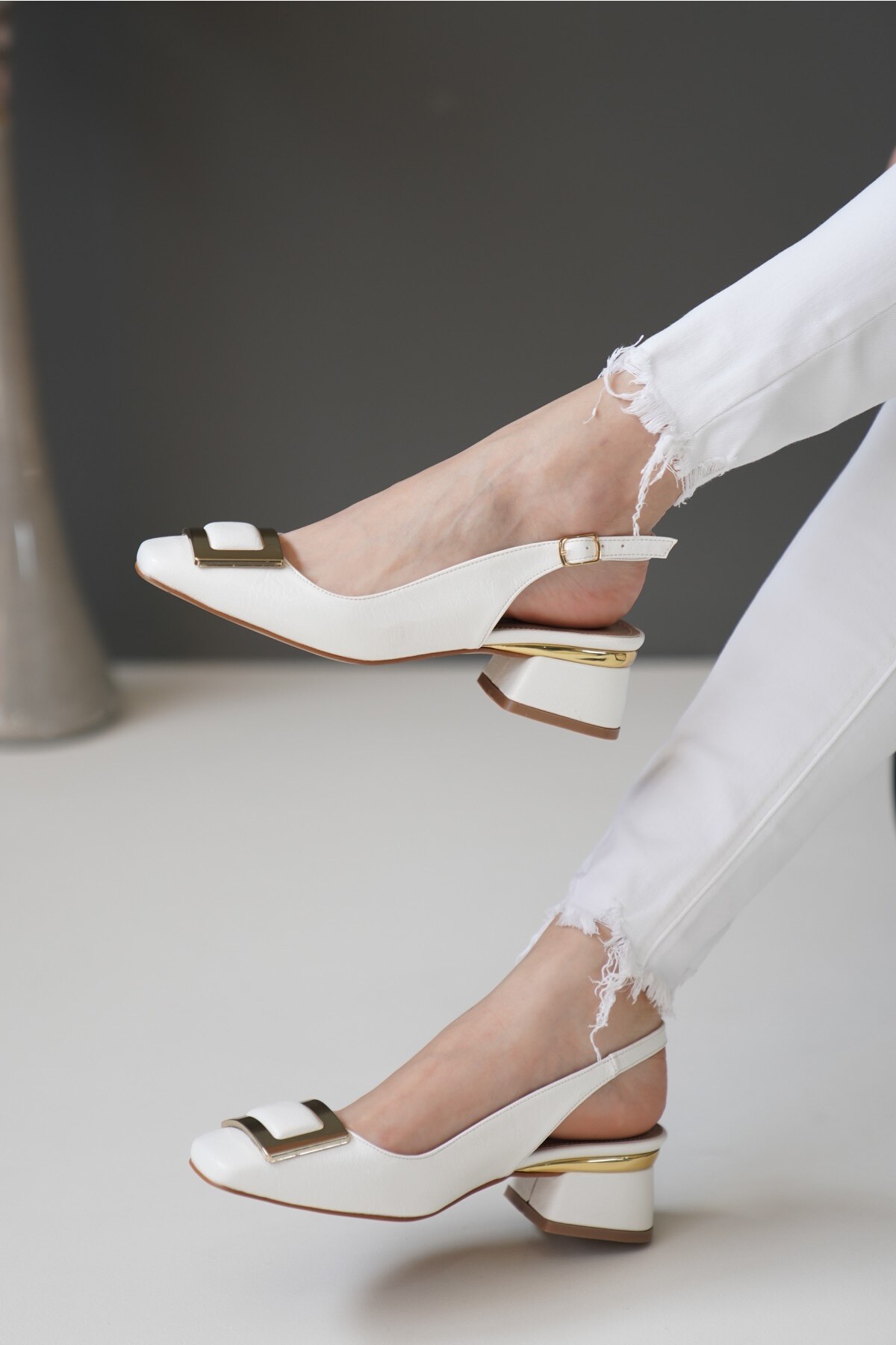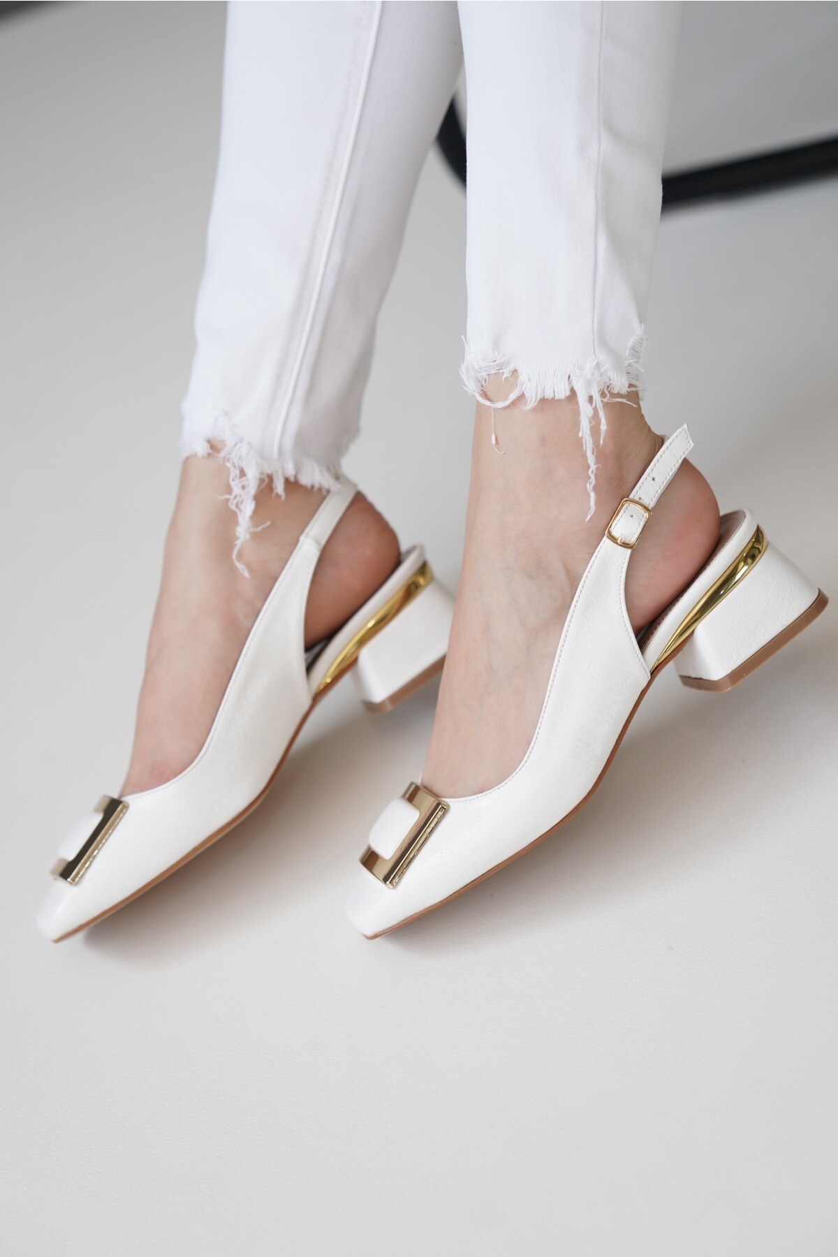 Kadın Gold Kare Toka Kısa Topuklu Ayakkabı Siyon Beyaz