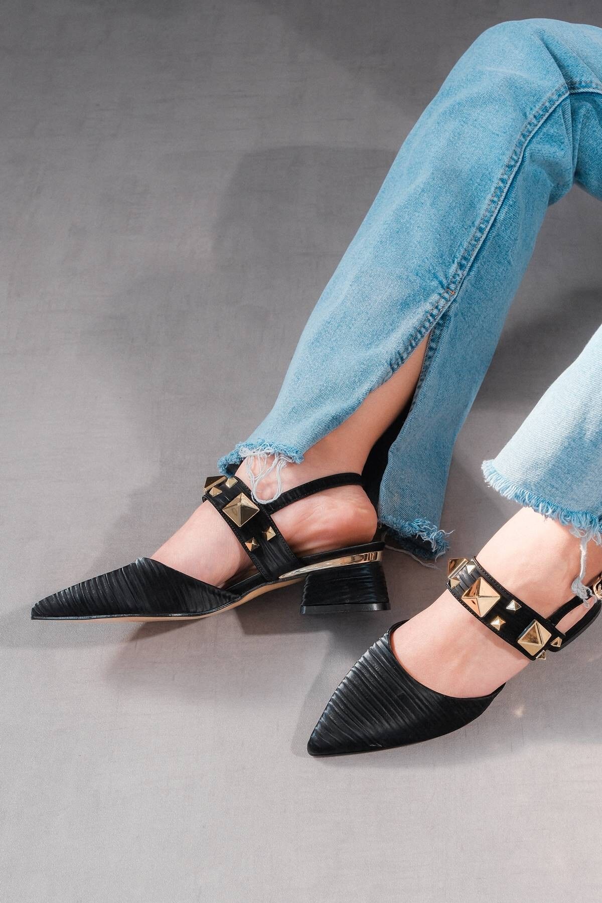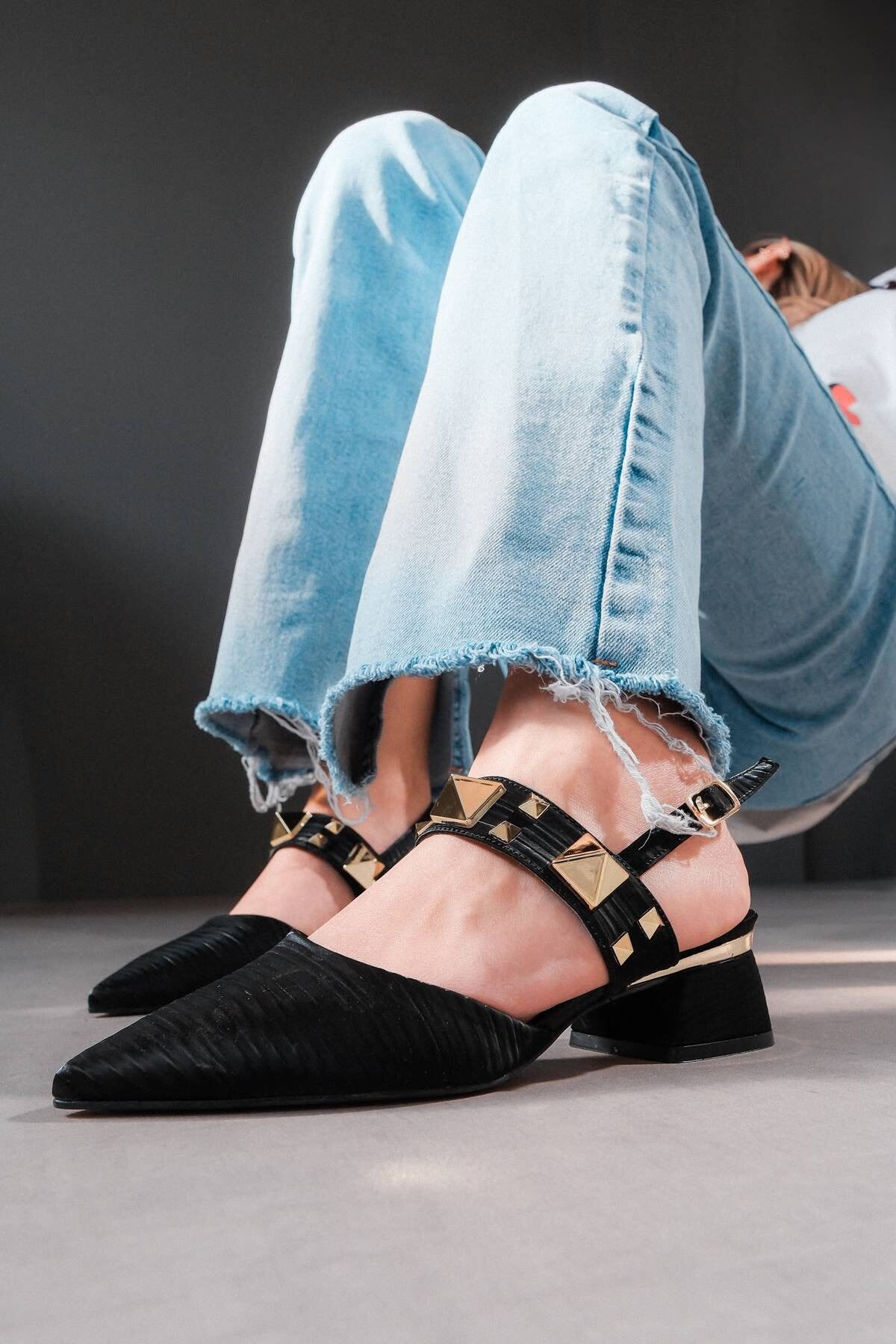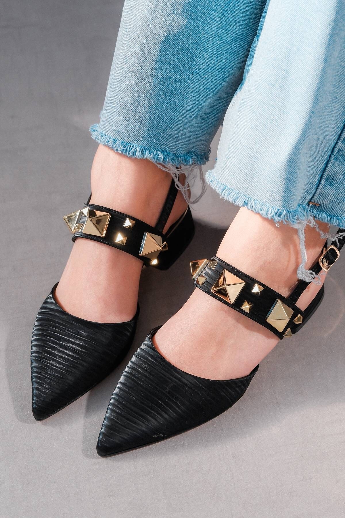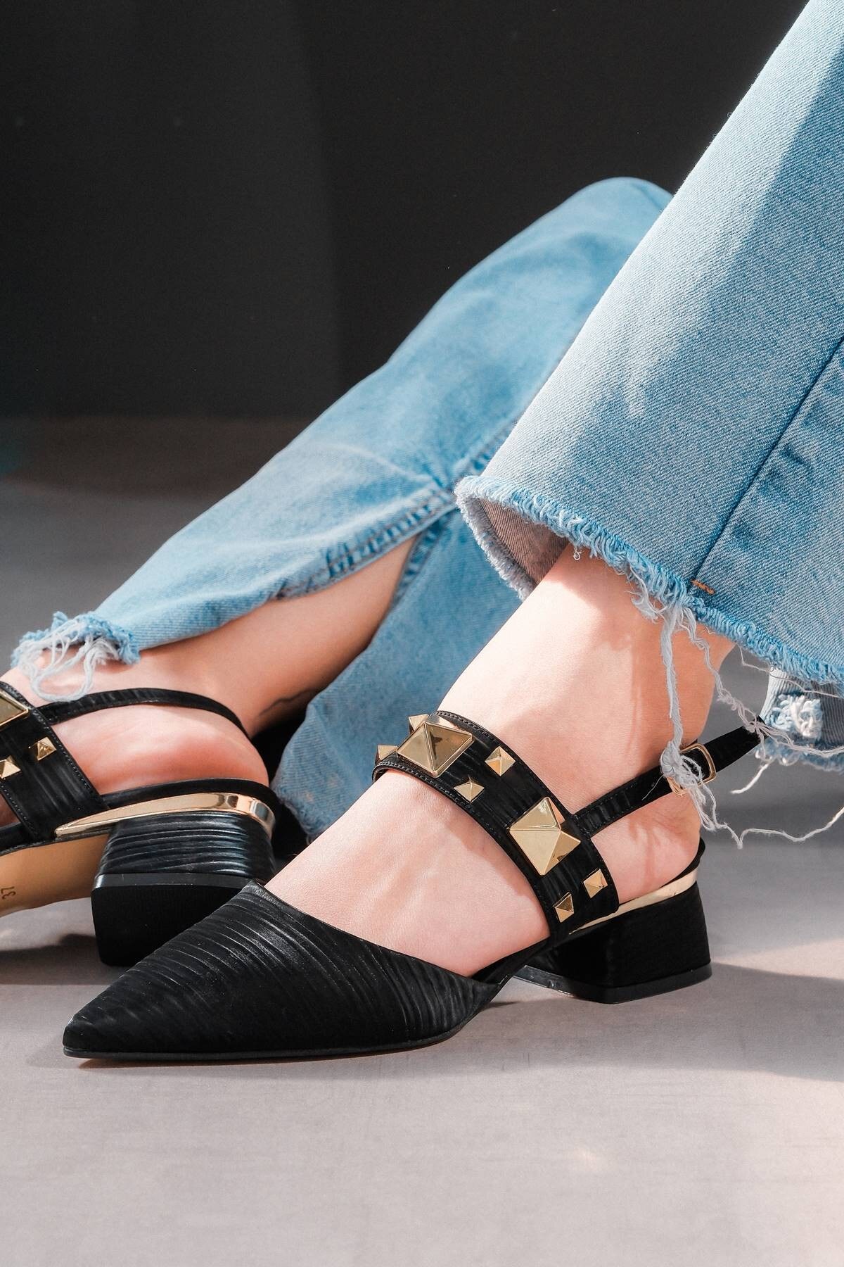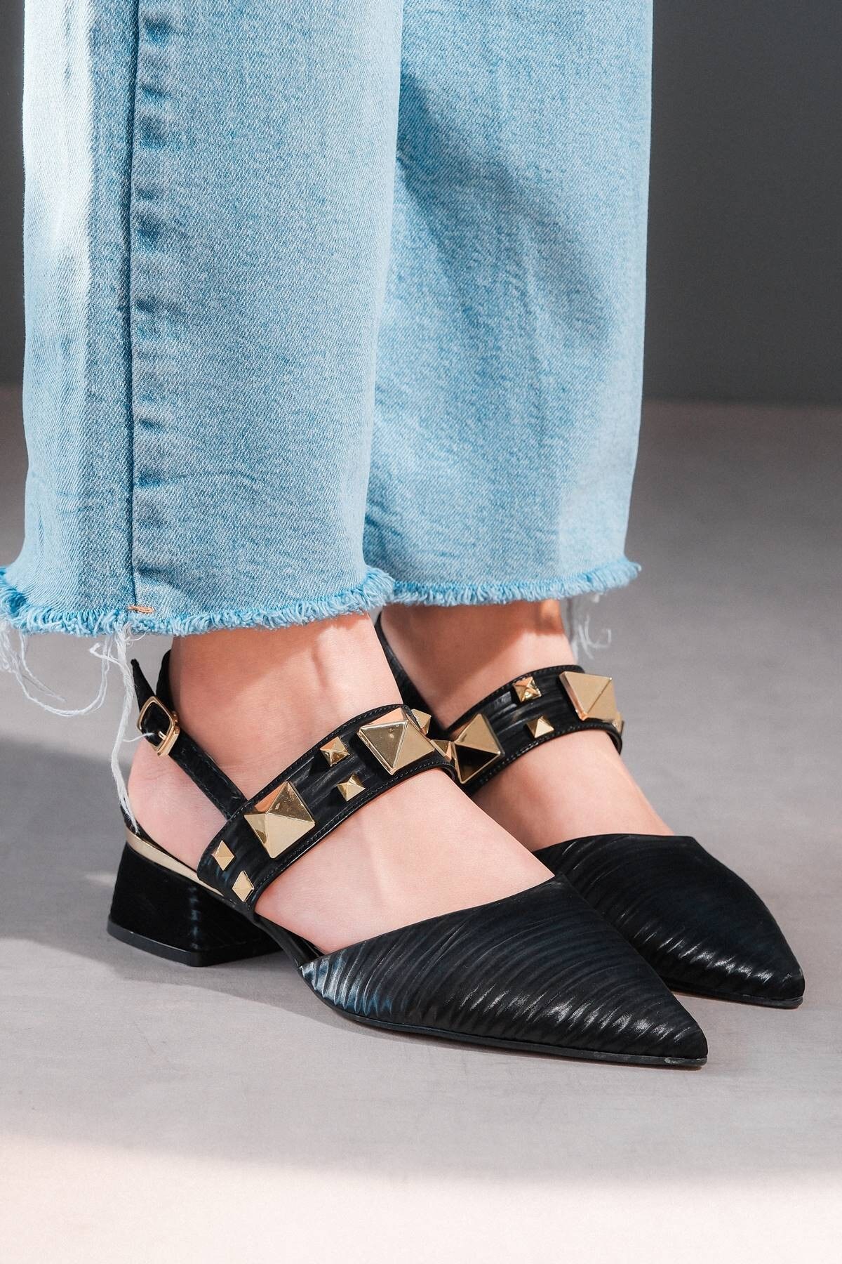 Kadın Gold Taşlı Kısa Topuklu Ayakkabı Siyah