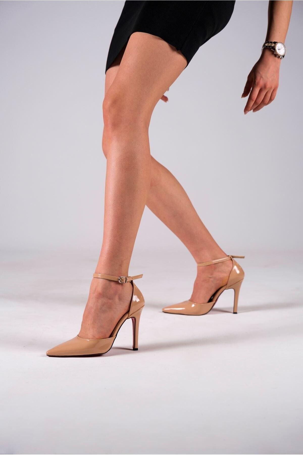 Kadın İnce Topuklu Baretli Tasarım Ayakkabı Stiletto Noppa Nude Rugan