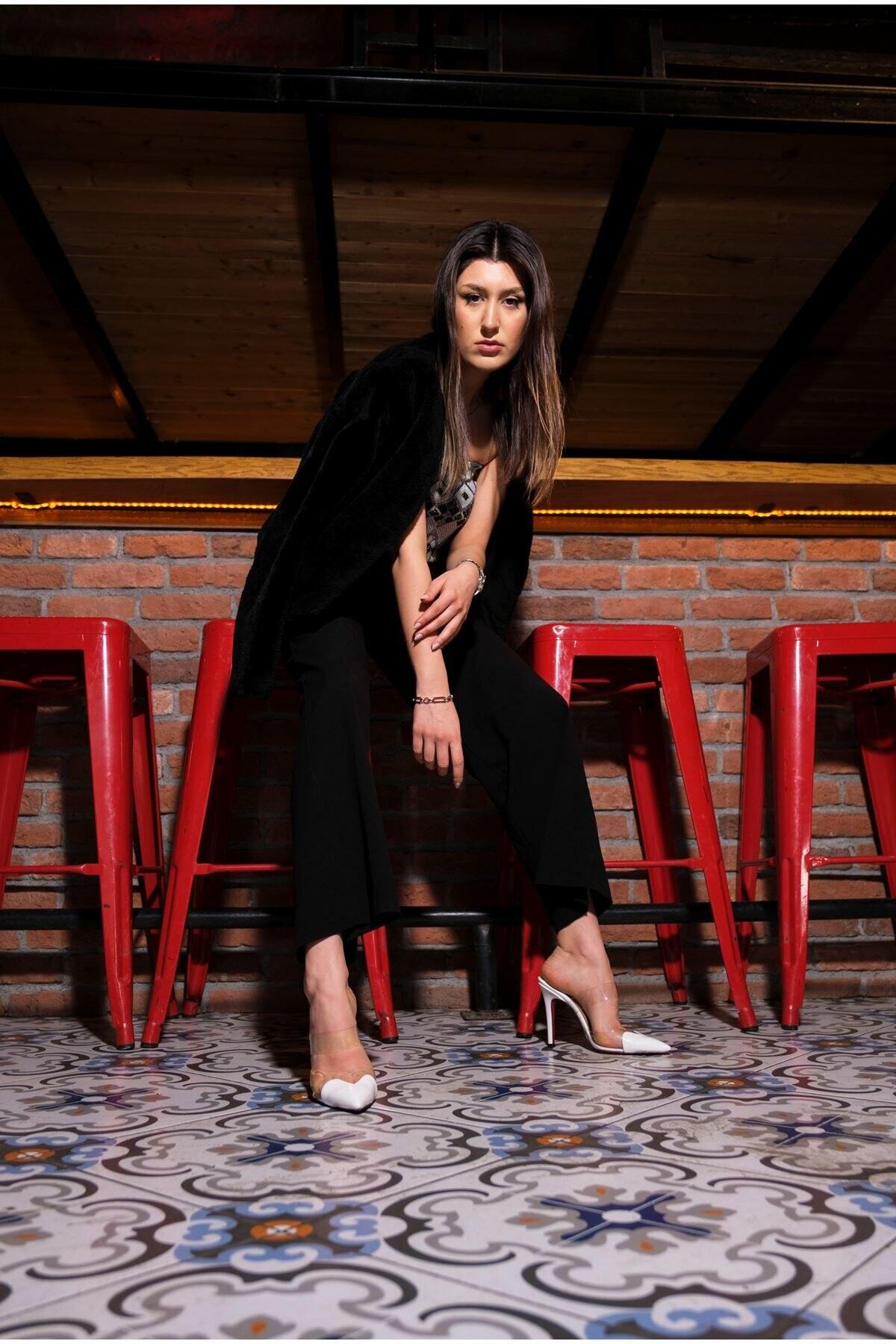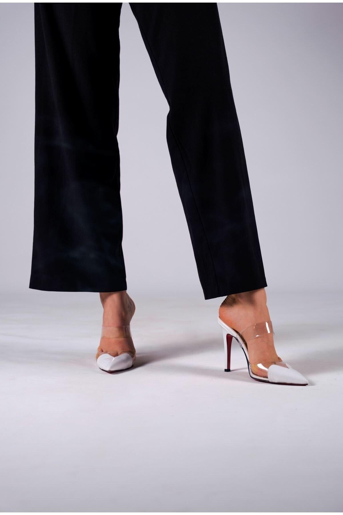 Kadın Şeffaf Bant Sivri Burun Topuklu Terlik Vario Beyaz Rugan