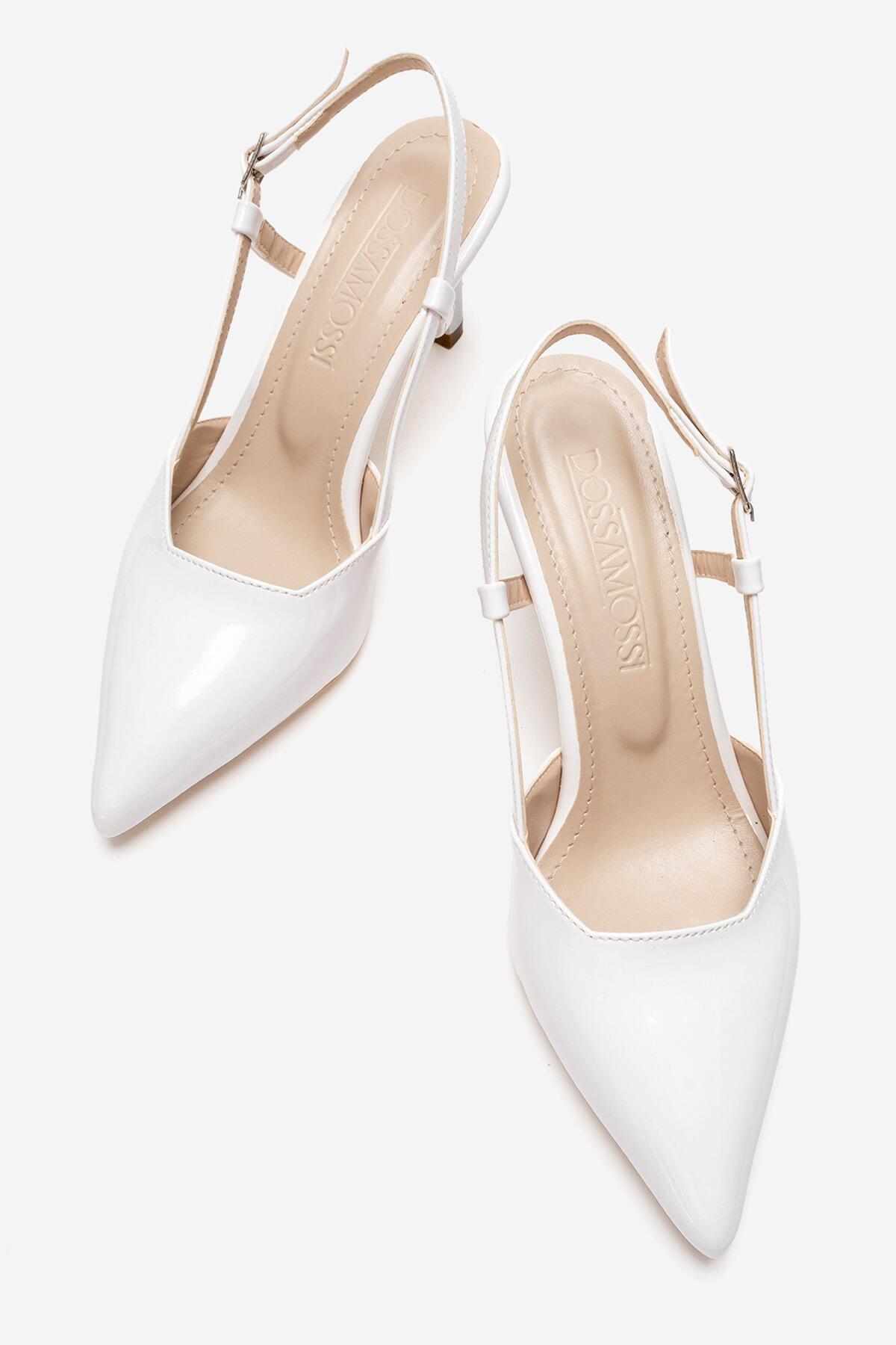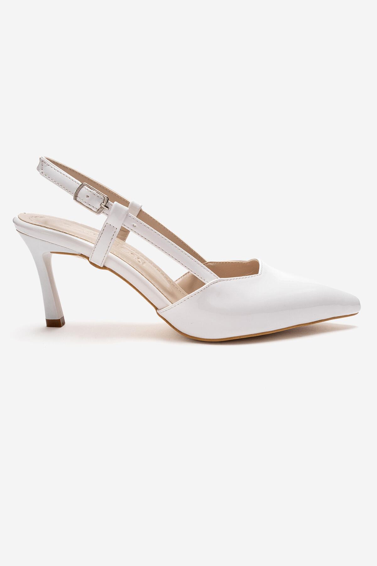 Kadın Sivri Burun Arkası Açık Kısa Topuklu Ayakkabı Cone Beyaz Rugan