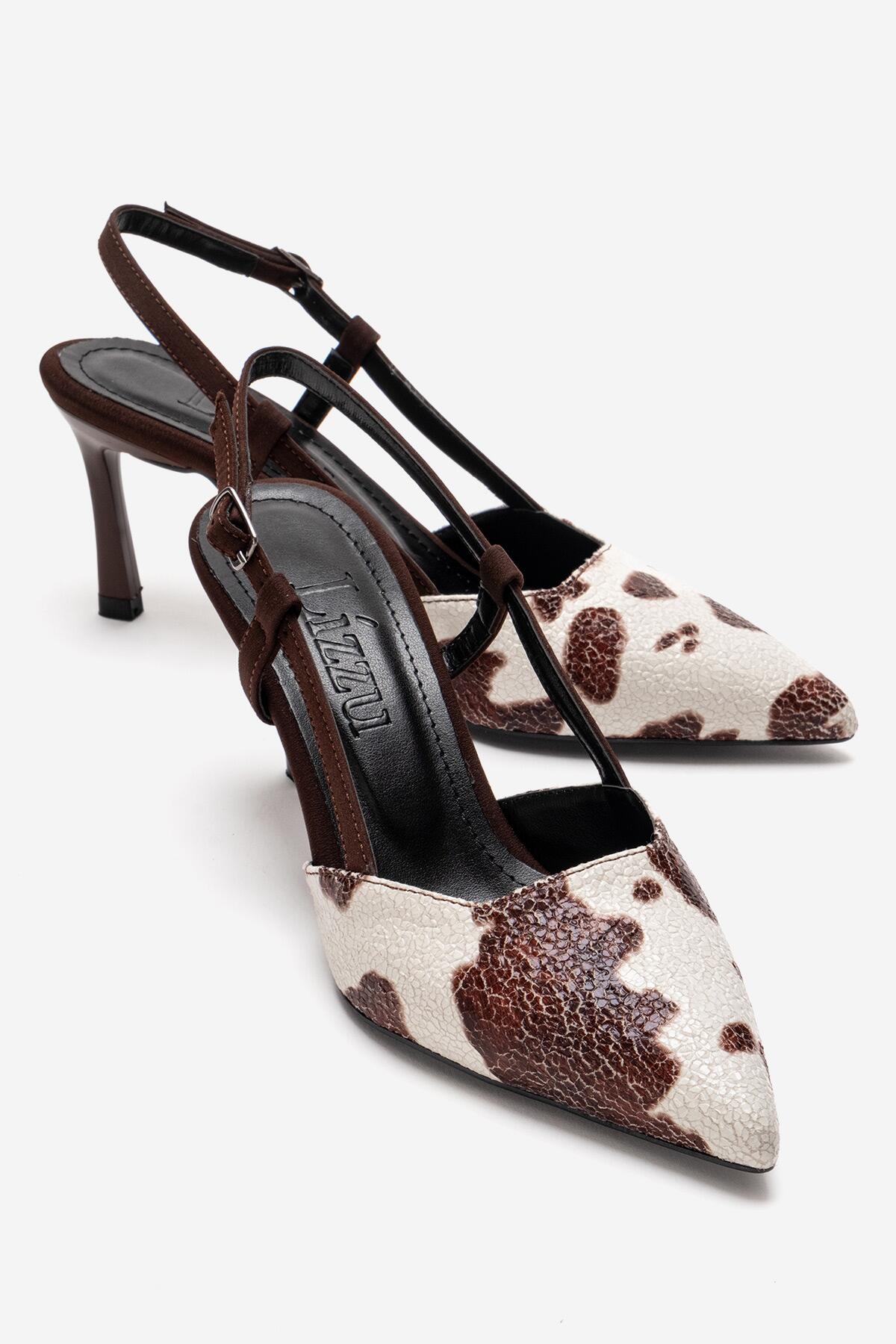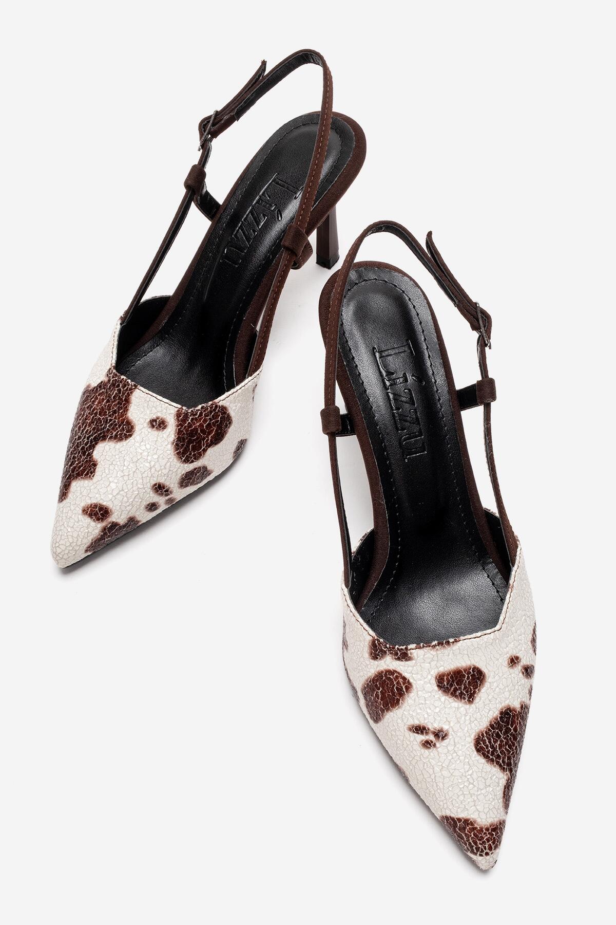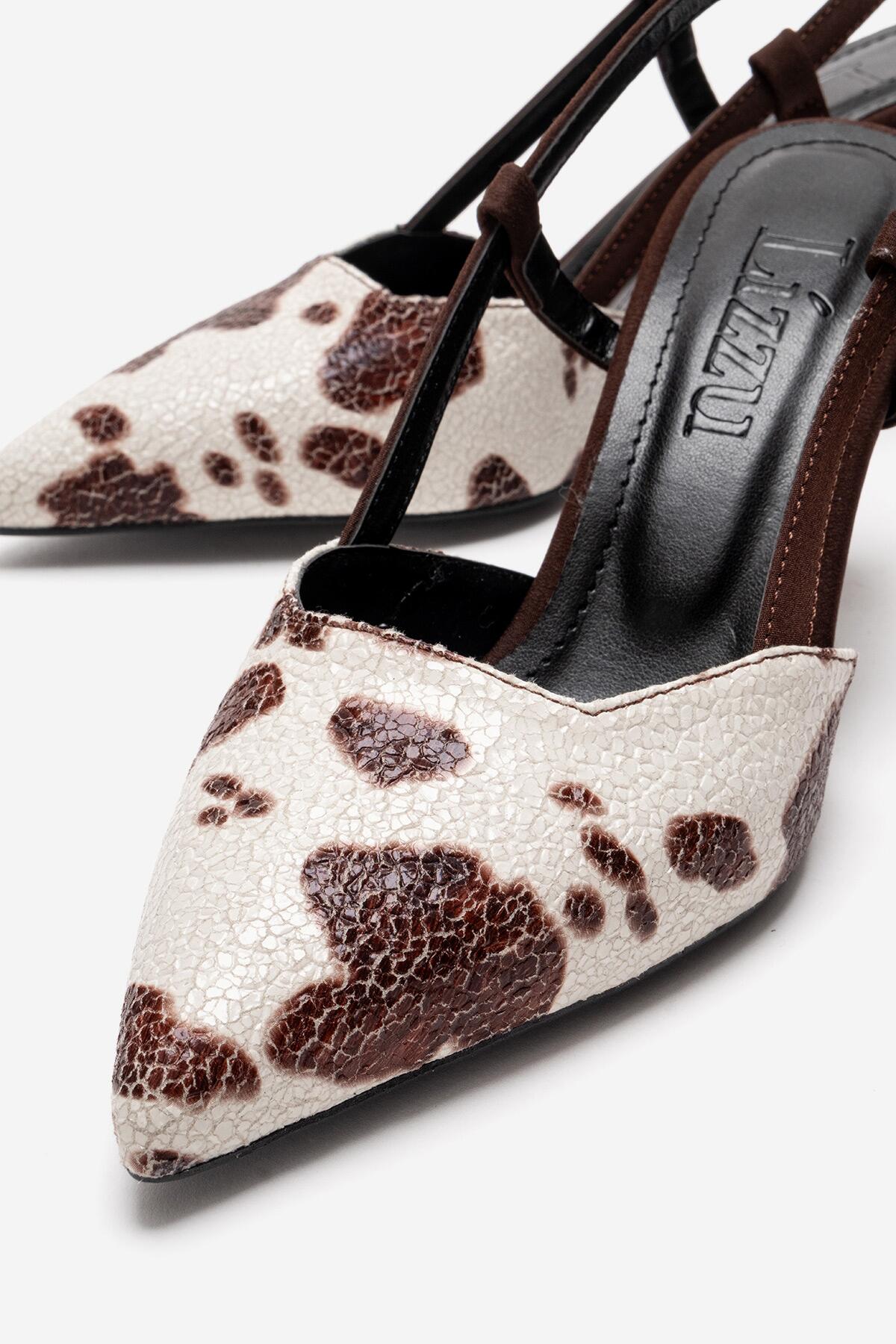 Kadın Sivri Burun Arkası Açık Kısa Topuklu Ayakkabı Cone Kahve İnek Desenli
