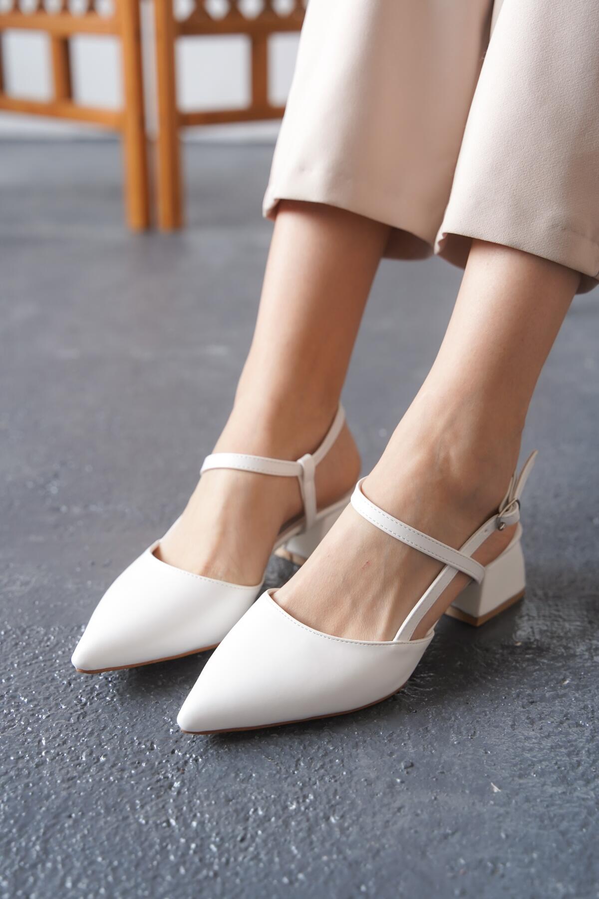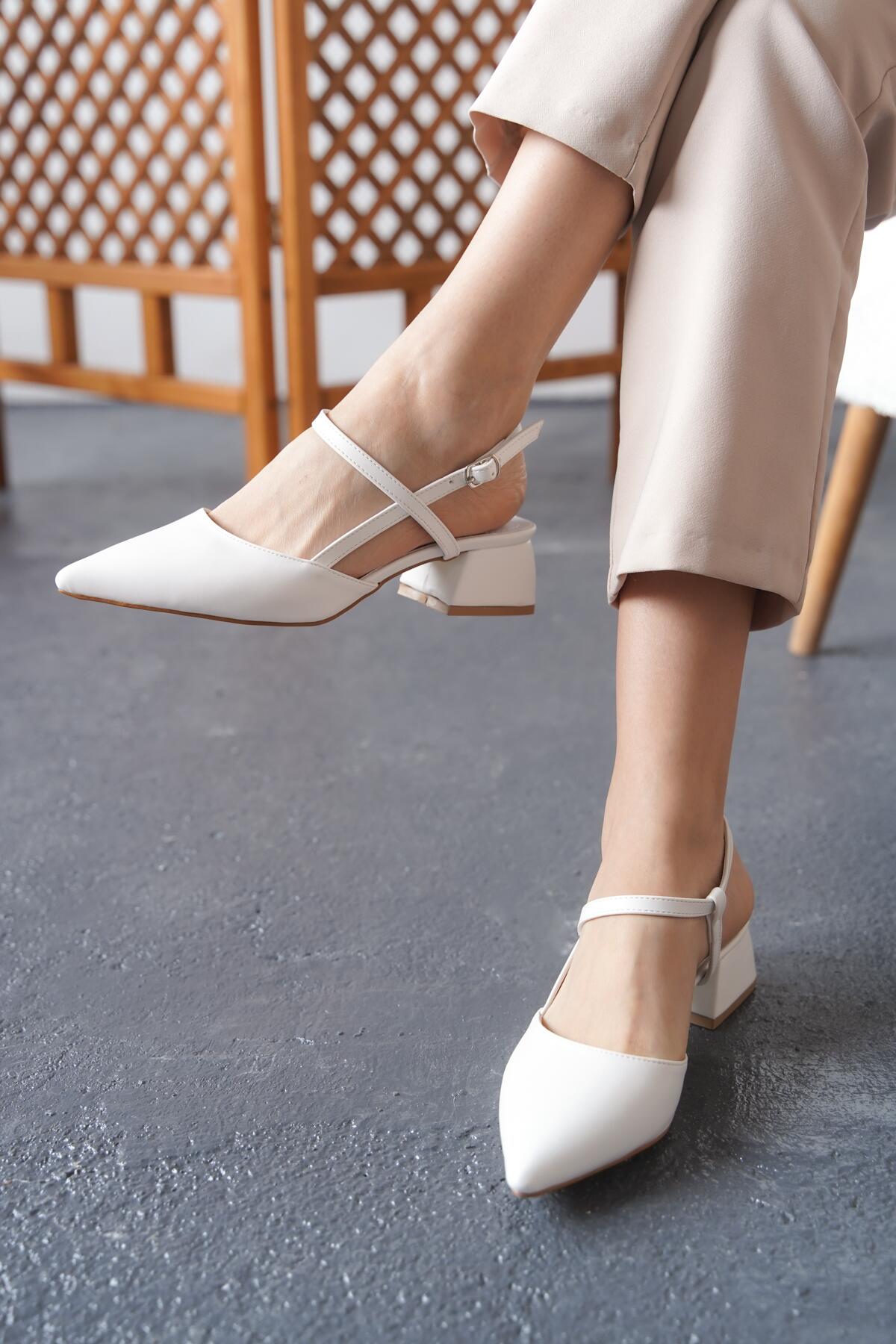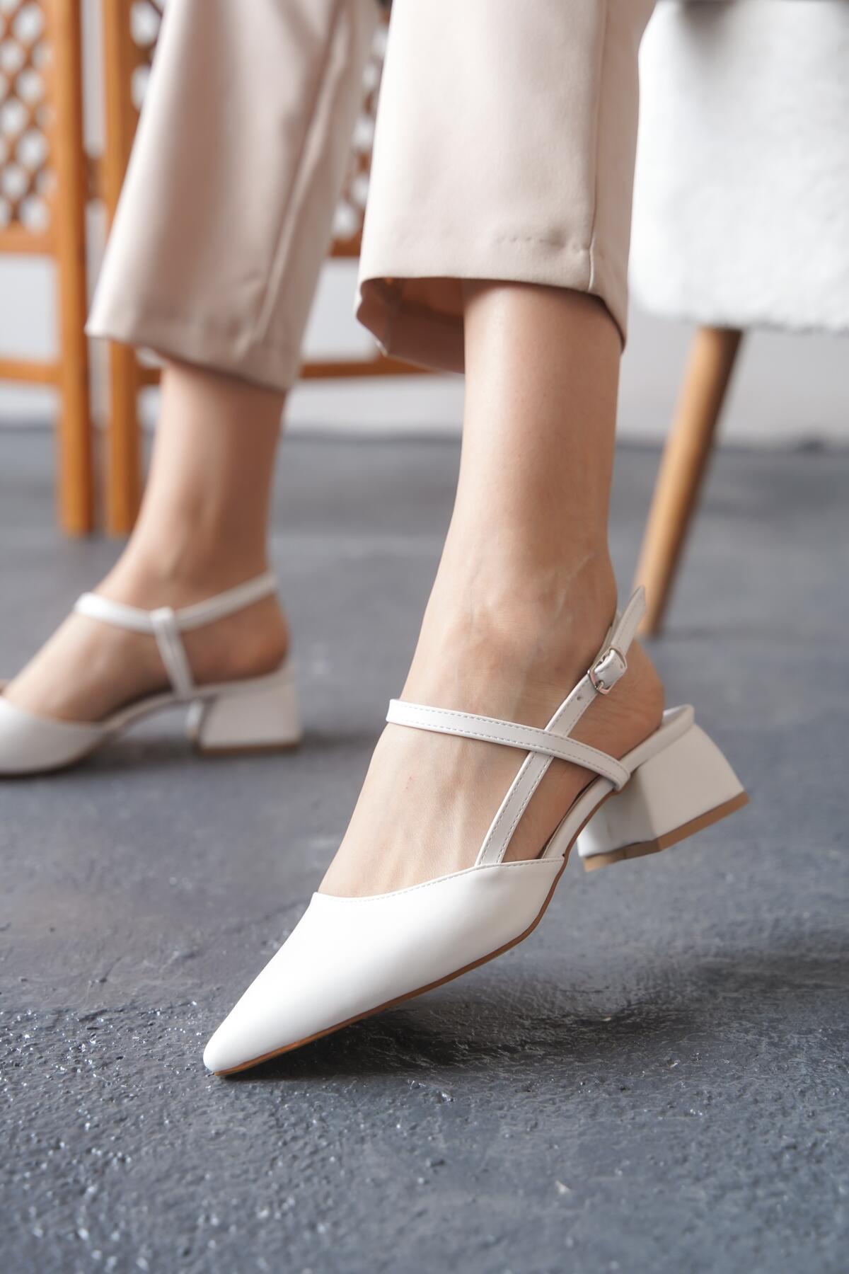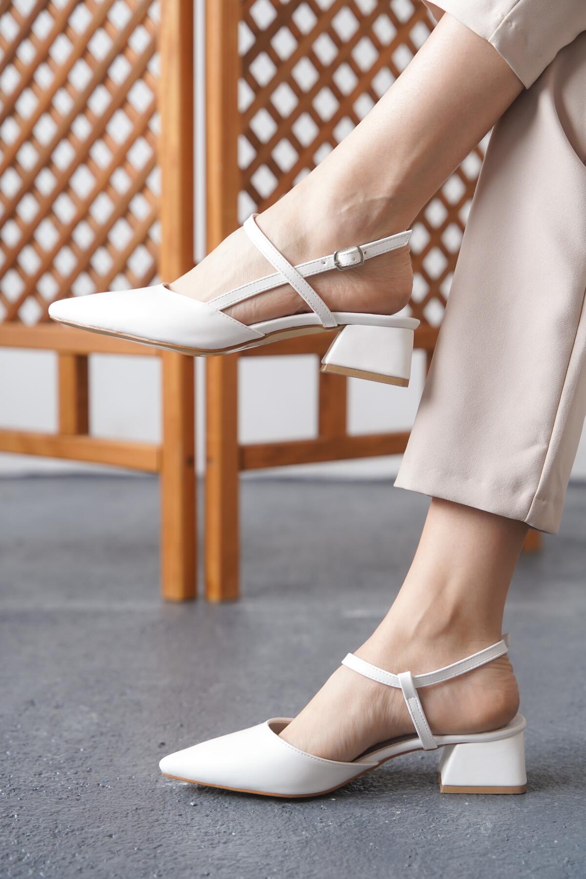 Kadın Tasarım Baret Arka Açık Kısa Topuklu Ayakkabı Emoi Beyaz Cilt