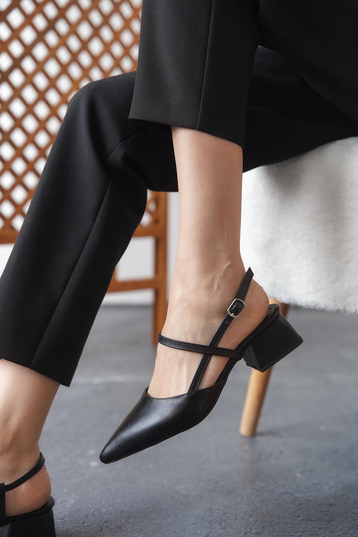 Kadın Tasarım Baret Arka Açık Kısa Topuklu Ayakkabı Emoi Siyah Cilt