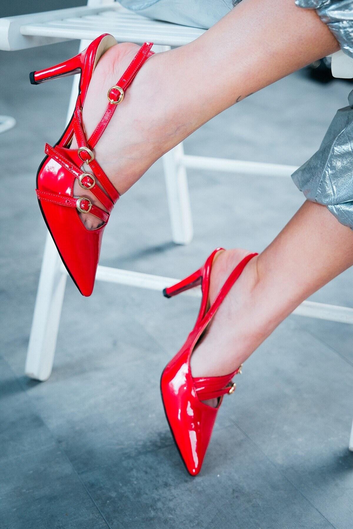 Kadın Üç Bant Tokalı Kısa Topuklu Ayakkabı Royal Kırmızı Rugan