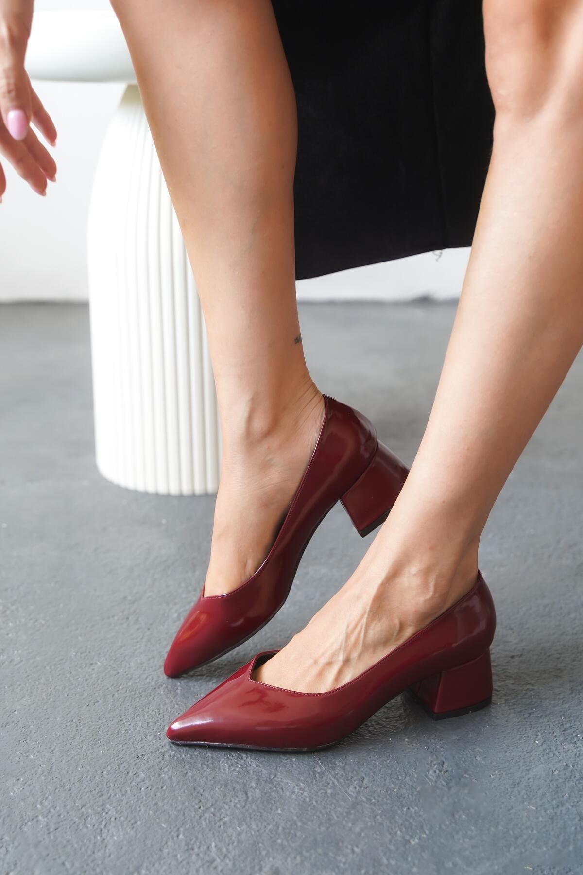 Kadın V Kesim Kısa Kalın Topuklu Ayakkabı Gova Bordo