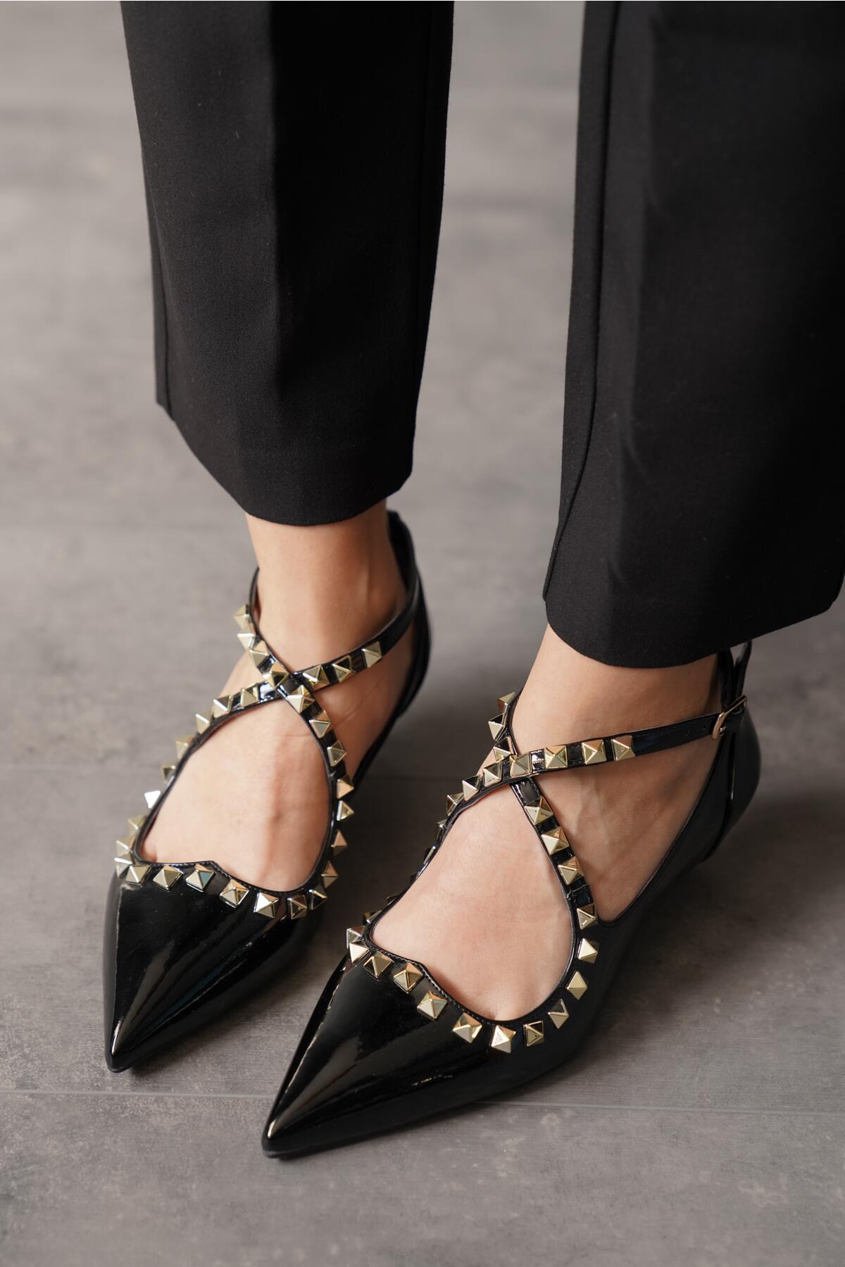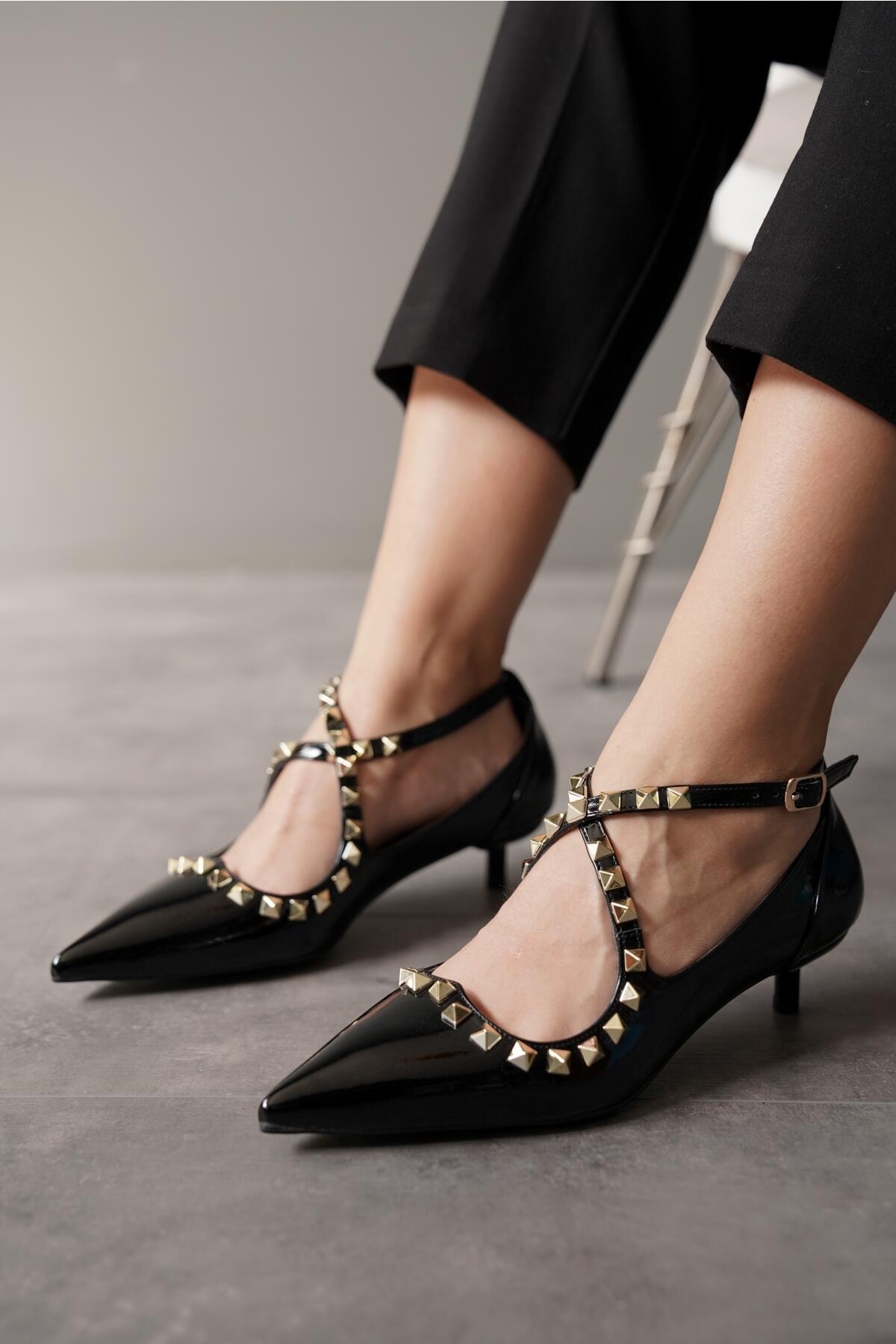 Kadın Zımba Baret Kısa Topuklu Ayakkabı Mansa Siyah Rugan