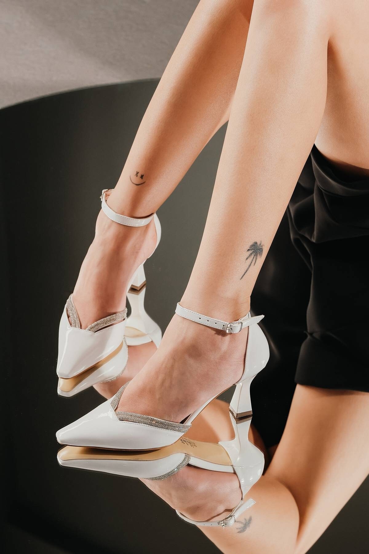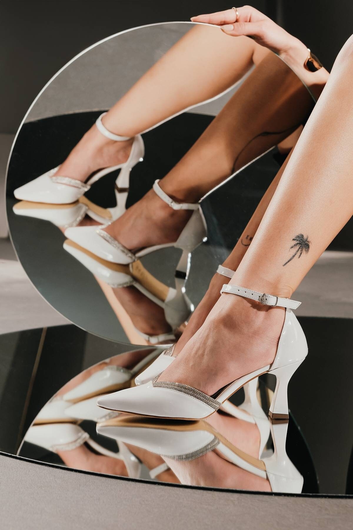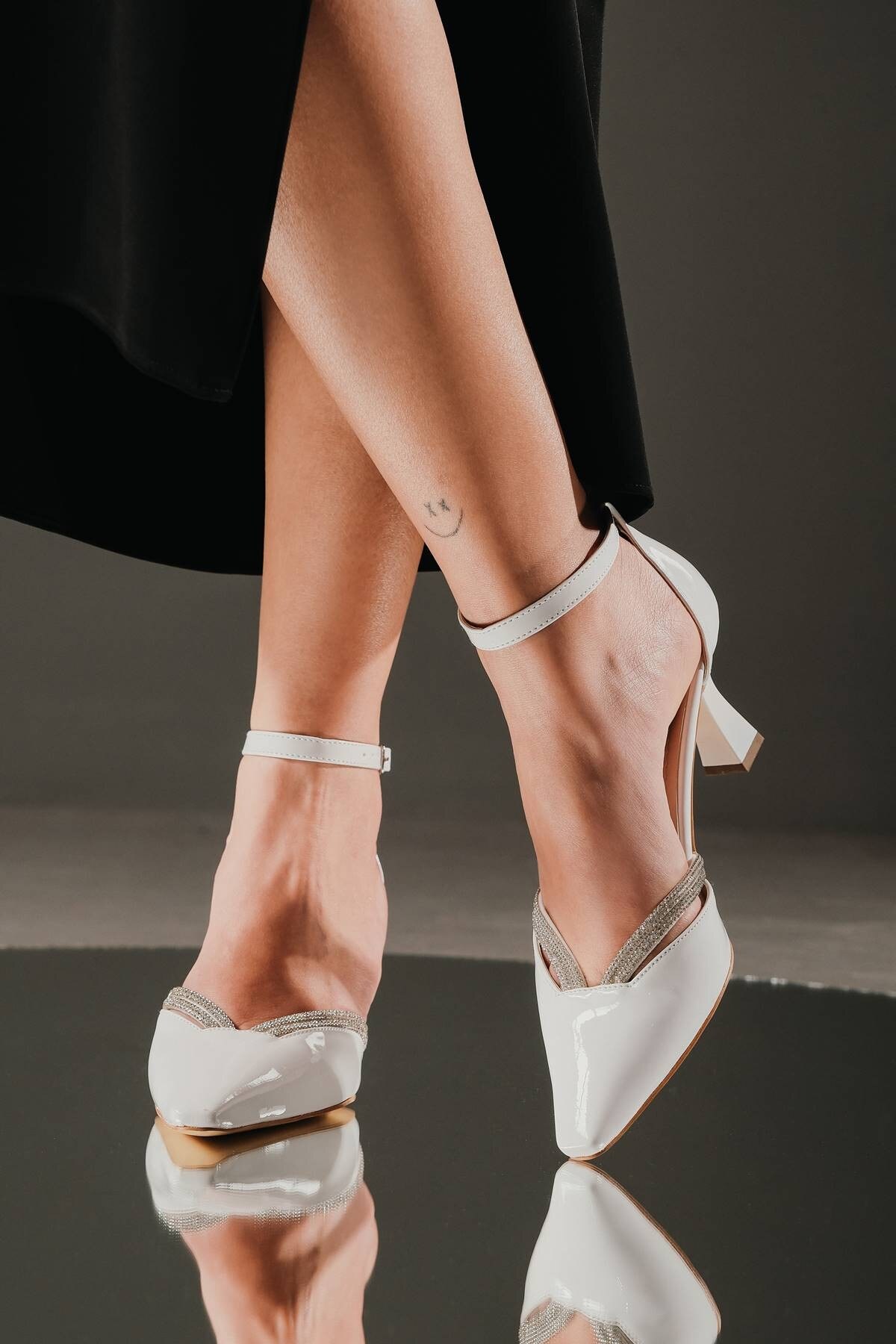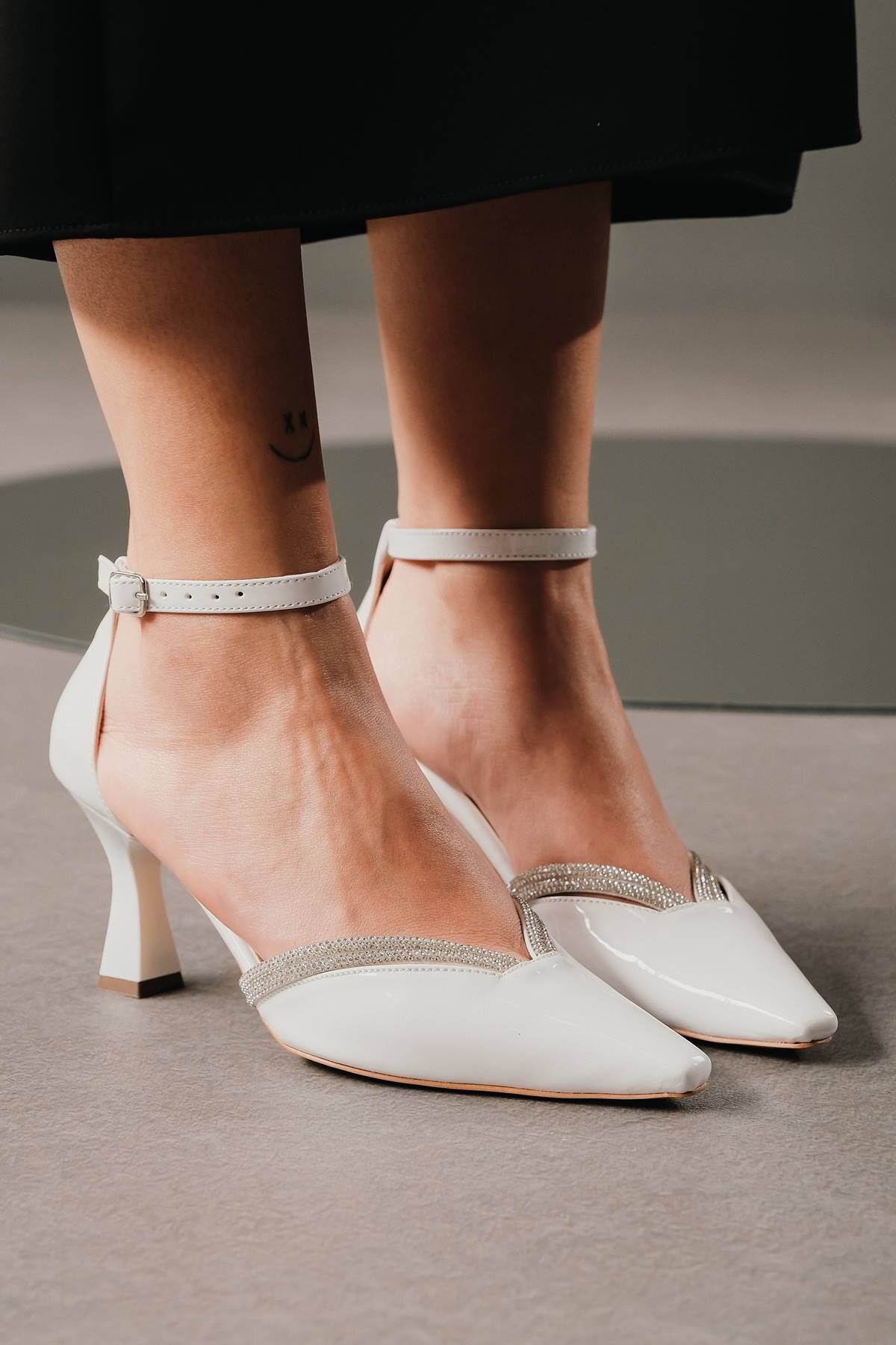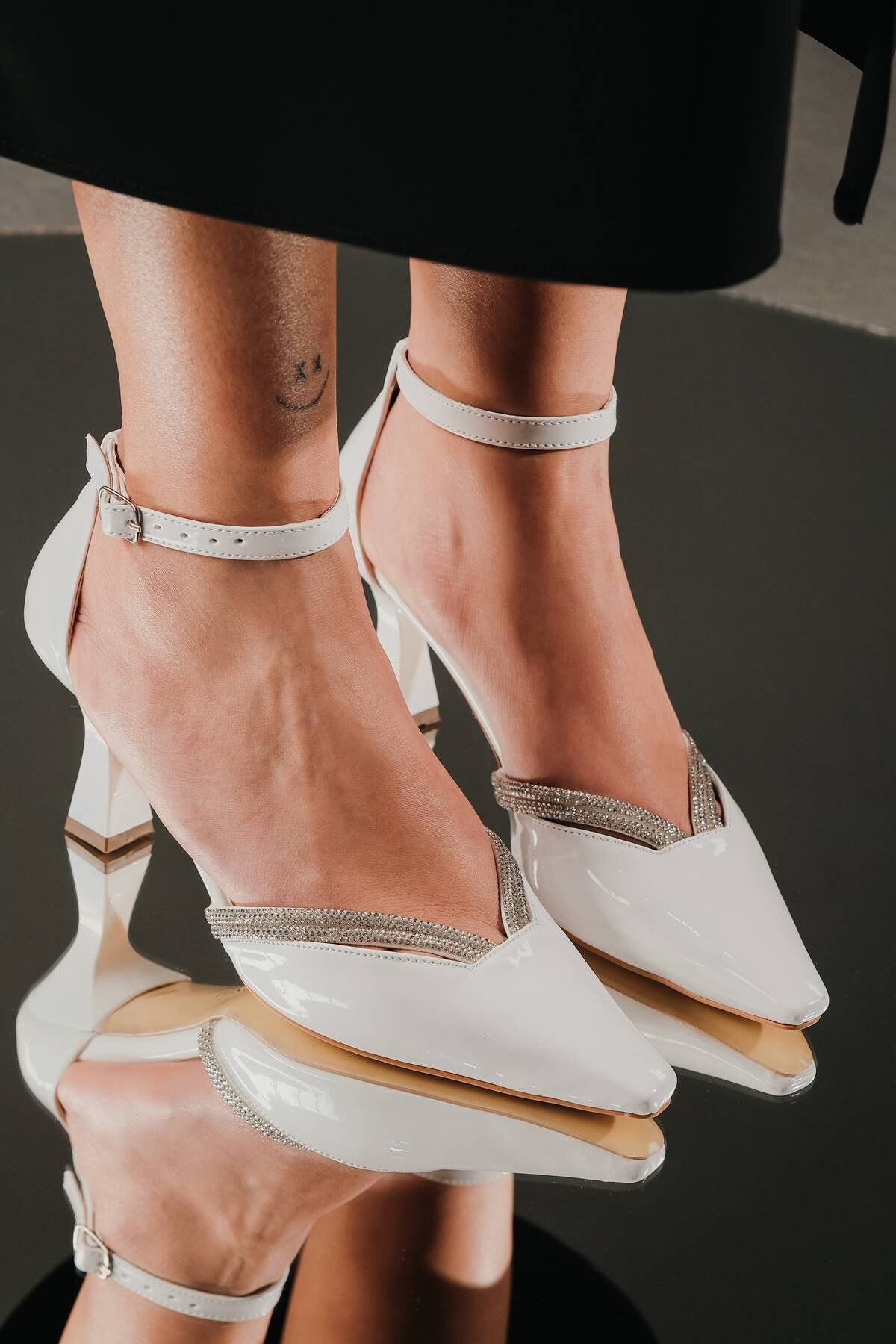 Beyaz Rugan Taş Detaylı Kadın Topuklu Ayakkabı Spenna Beyaz