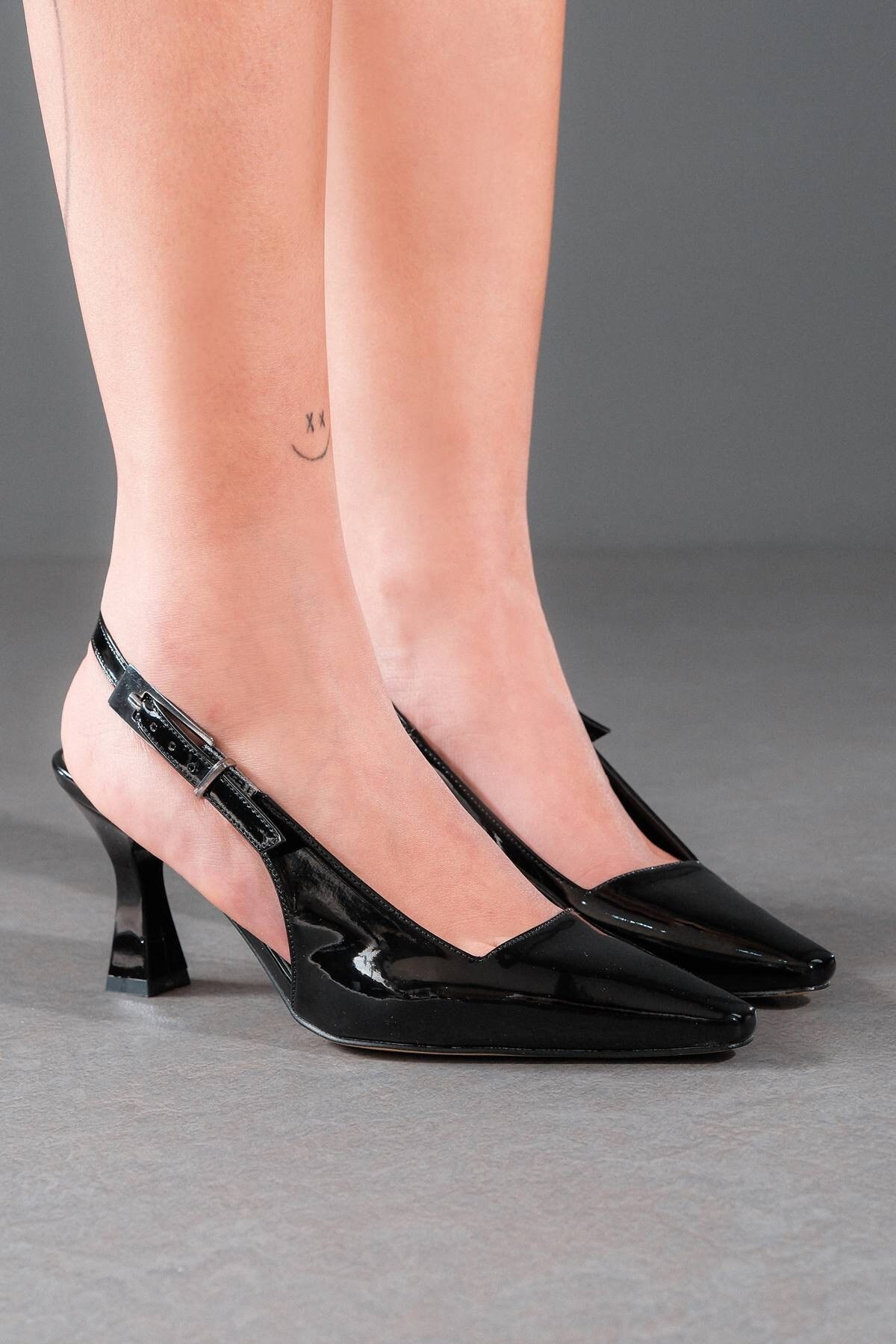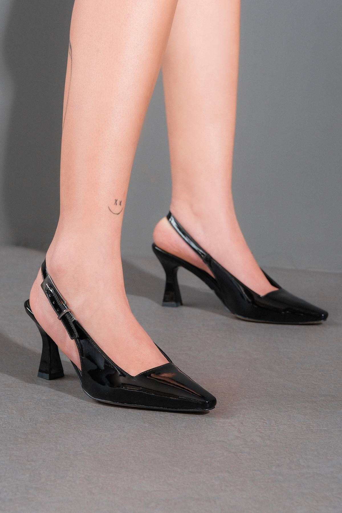 Siyah Rugan Tasarım Tokalı Kadın Topuklu Ayakkabı Niola Siyah Rugan