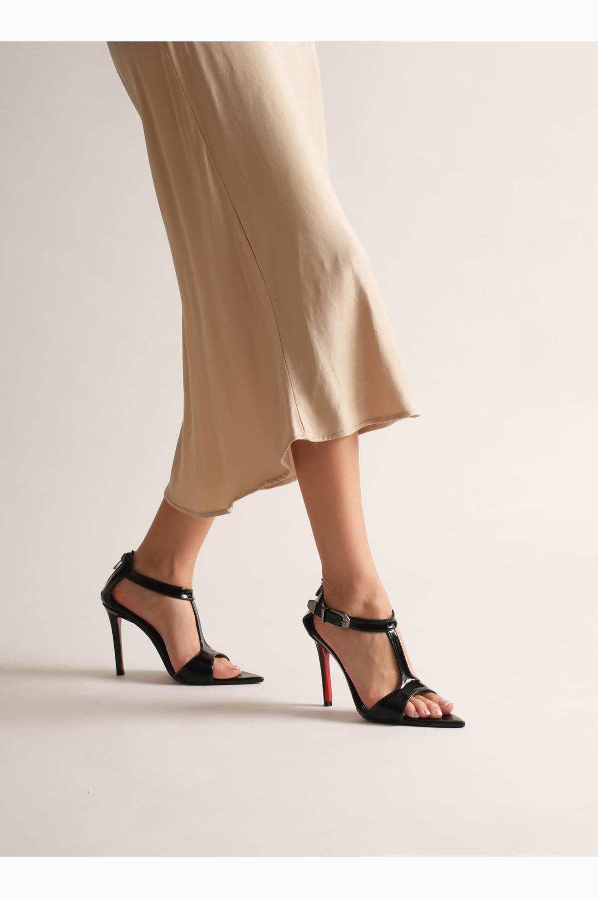 T-bantlı Toka Detaylı Sivri Burun İnce Topuklu Stiletto Ayakkabı Tories Siyah Rugan